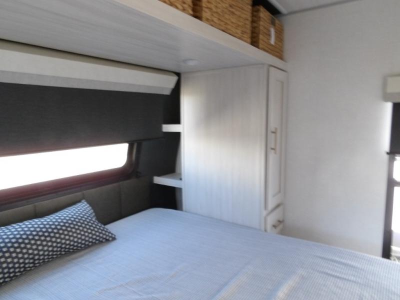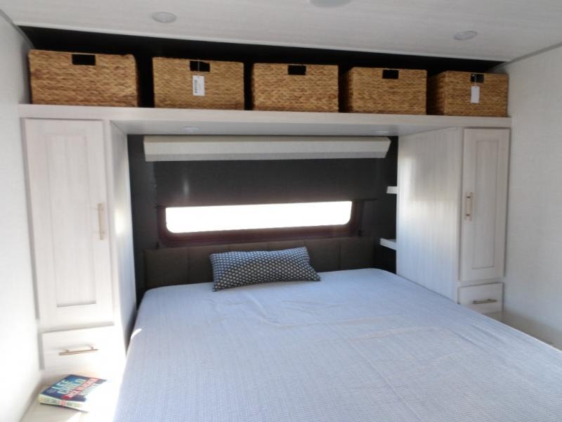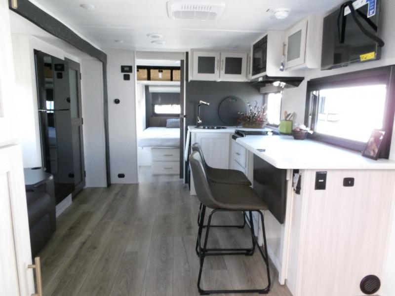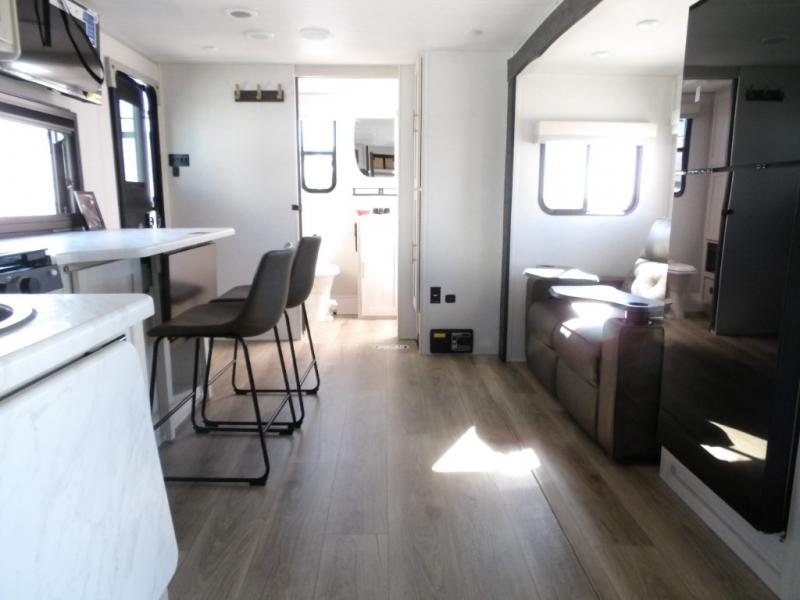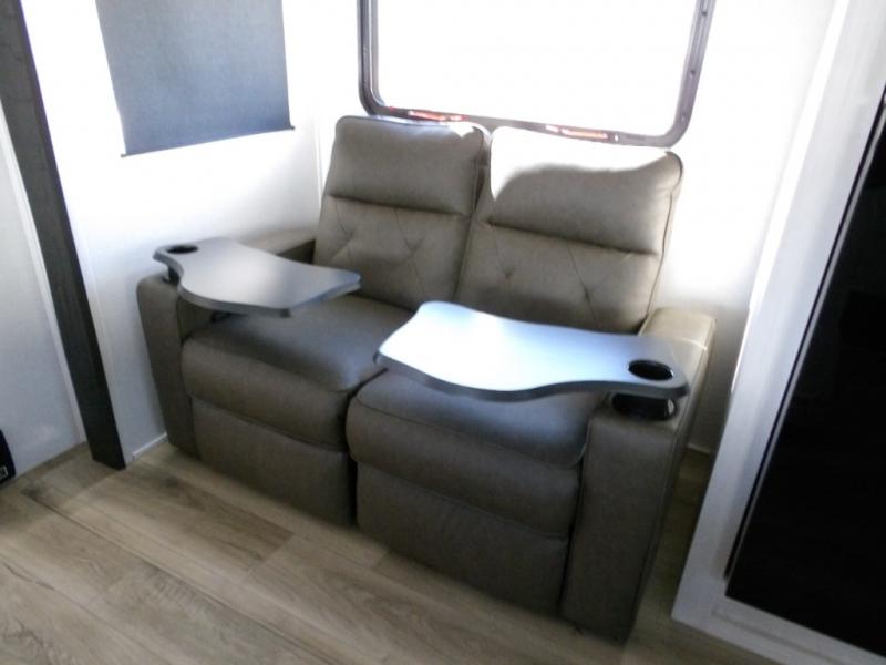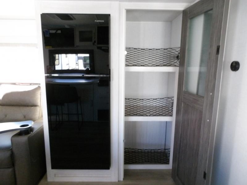 The rear bathroom with a linen closet is for personal care and storage of linens, a front bedroom with a king bed and two wardrobes, creates a serene retreat with ample storage for clothing and personal items, perfect for restful nights. The theater seating provides immersive comfort for relaxation and entertainment, ideal for enjoying movies or unwinding after a day of exploration. Overhead cabinets deliver additional storage for travel essentials and keepsakes. The kitchen area boasts a fridge, a pantry, an air fryer/microwave that combines versatility for quick and healthy meal preparation, a countertop extension, and a flip-up window that enhances ventilation and brings in natural light for a bright kitchen ambiance. You can also enjoy the outdoor living delights by cooking in the incredible outlook kitchen un ther the protection of the power awning.