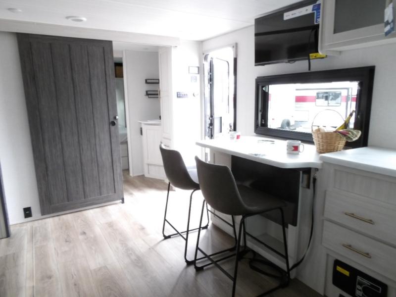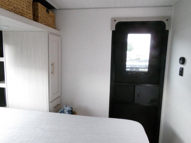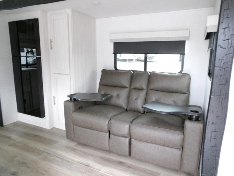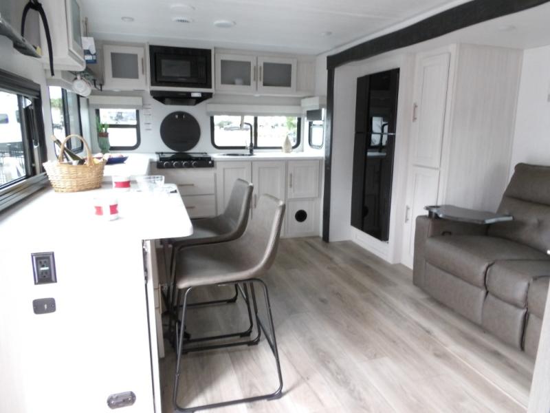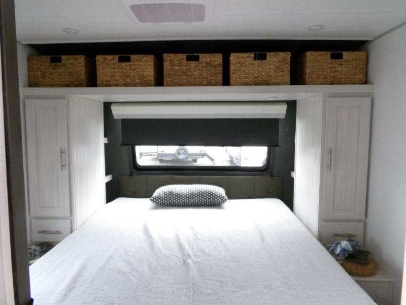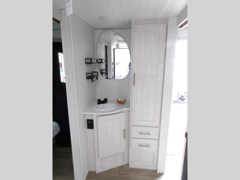 This travel trailer's functional rear kitchen boasts an air fryer/microwave that combines convenience for quick and healthy meal preparation, a shelf, overhead cabinets offering ample storage for culinary supplies and travel items, a fridge, and a pantry that delivers convenient storage for snacks and provisions. Plus, the bar 2 table creates a flexible space for casual dining and socializing, and the flip-up window enhances ventilation and brings in natural light for a bright kitchen ambiance. You can also rest a bit in the theater seating that provides comfortable, cinematic-style seating for relaxation. In the center of this RV, you will find a walk-through bathroom, adding convenience to the unit, and further, you will be mesmerized by the well-appointed front bedroom. Designed for two, this space offers a king-size bed, end tables, and a wardrobe on each side of the bed, featuring ample storage and convenient bedside spaces for comfort and organization.