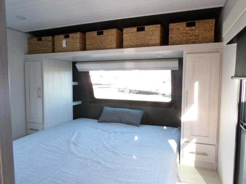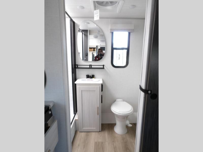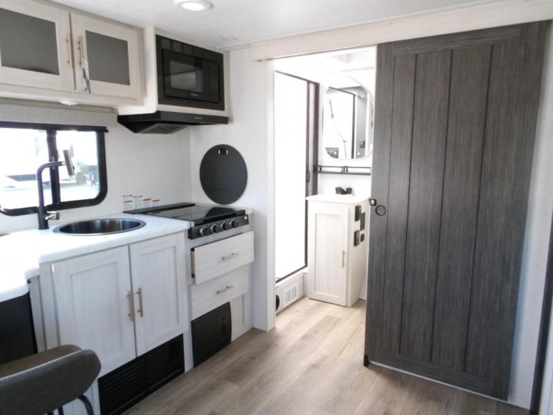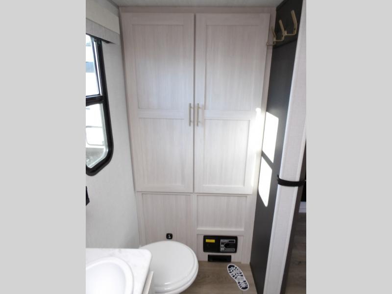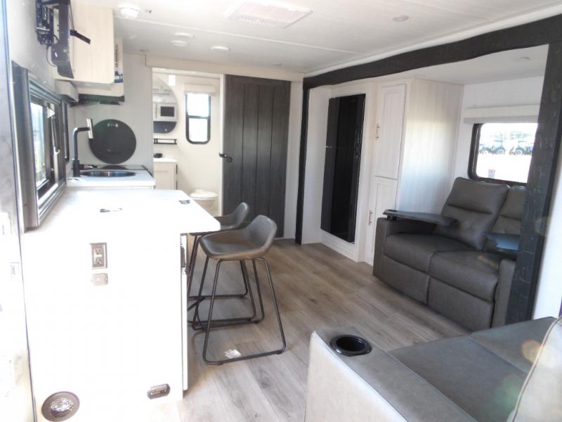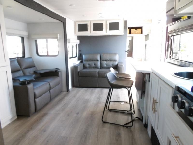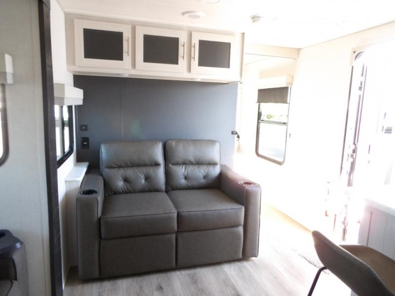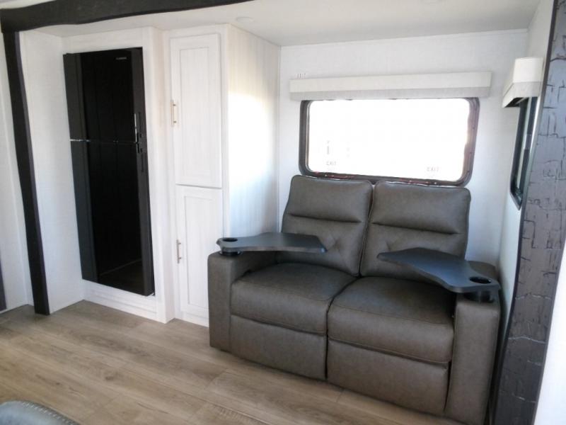 This travel trailer offers a comfortable and convenient layout rear bathroom with a linen closet, a private, well-appointed space for personal care with storage for linens, ensuring comfort on every journey. In the living room/kitchen combined area, you will find theater seating, a tri-fold sofa that offers versatile seating and additional space for guests or relaxation, adaptable to your travel needs, a fridge, a pantry for culinary supplies, an air fryer /microwave, a flip-up window, and overhead cabinets. The front bedroom will be your sanctuary of relaxation after a long day of exploring. The outside kitchen is the cherry on top, since it is ideal for alfresco cooking and dining, perfect for savoring meals amidst scenic surroundings and enjoying the outdoors with loved ones!