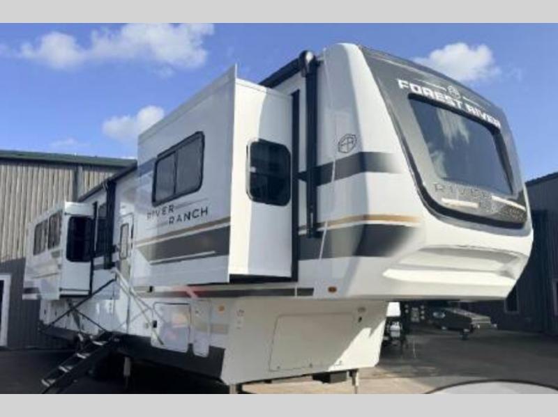 With the River Ranch fifth wheel by Forest River, you will love the practical living, ample storage, the optimum towability, and the lavish style found throughout! There is a 7' interior height and a 101" wide body for added space, plus large, tinted windows throughout, worry-free composite floors, and vacuum bonded walls with Azdel for durability. The mandatory River Package includes features such as an upgraded suspension, a screenless operating system with Bluetooth, and three A/C units to keep you comfortable. These fifth wheels also include the mandatory Ranch Package that comes with a stainless-steel appliance package, day/night roller shades, a fiberglass shower surround, plus residential style dinette chairs. There are many more features to love about the River Ranch fifth wheels, like the upgraded true solid surface countertops, the mirrored sliding closet doors, and the two-tone painted front cap!