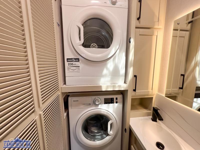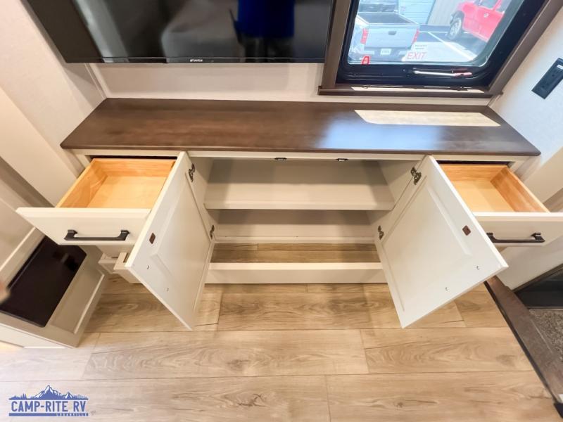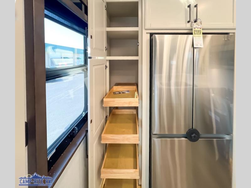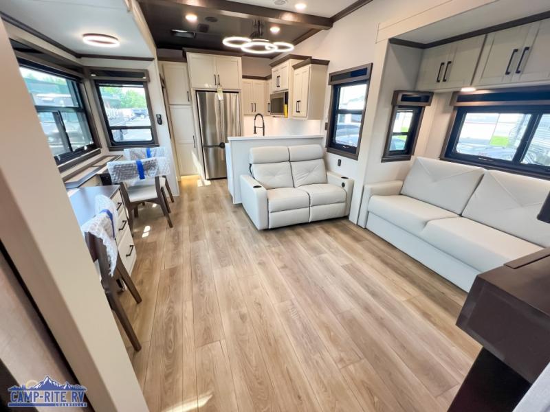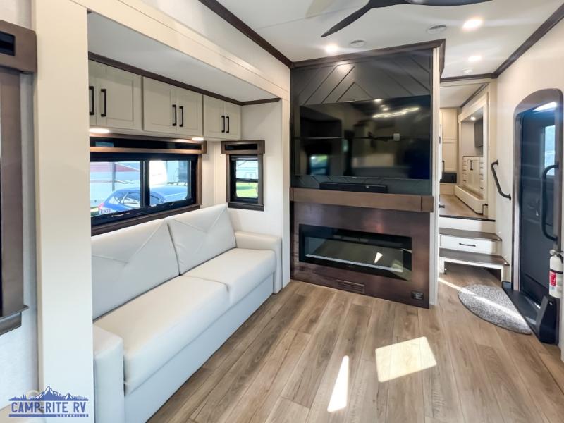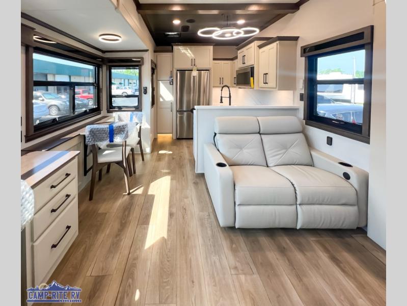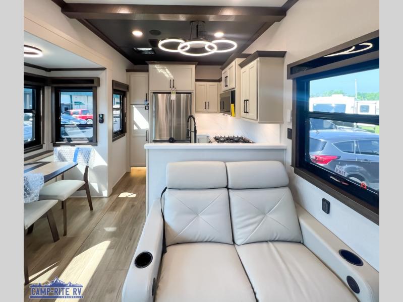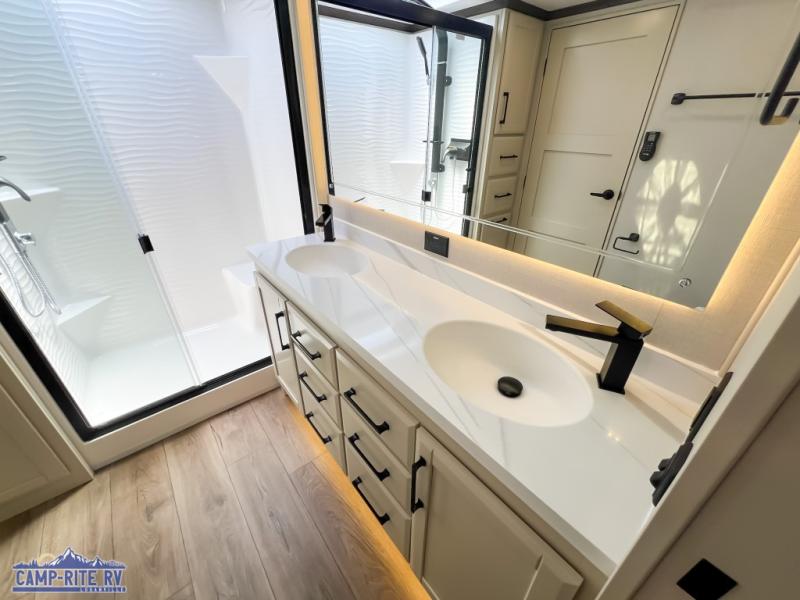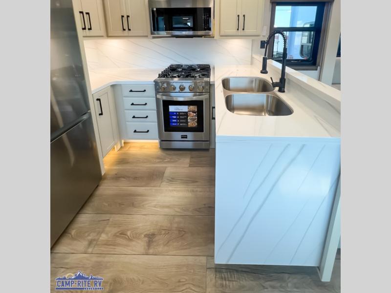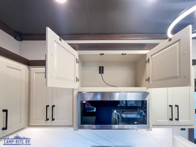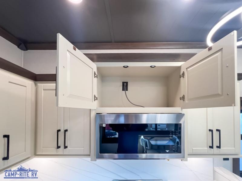 The Forest River RiverStone fifth wheels and toy haulers are luxurious units that have it all! You'll find an automatic six-point hydraulic level-up system to keep your unit in place, and there is preparation for a four-camera observation system. The TravlFi Journey XTR 4G/LTE router and WiFi extender will help you stay connected to the outside world, and you'll never have to overpack again since the Splendid “Astral” stackable washer and dryer will let you clean the small amount of clothes you've brought with you. Another high luxury is the Fischer Paykal dishwasher which will allow you to spend more time enjoying your camp life and less time cleaning up. Each unit is built with an LCI Road Armour suspension system, dual-pane frameless windows, a full docking station, a 200W solar panel, and a BMPro touch control system.