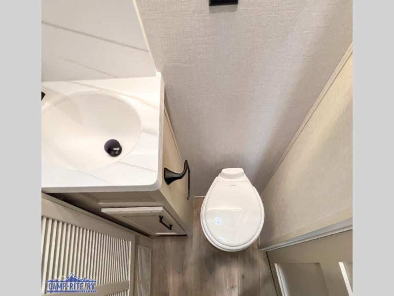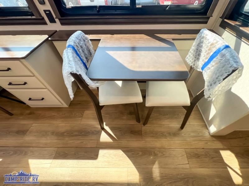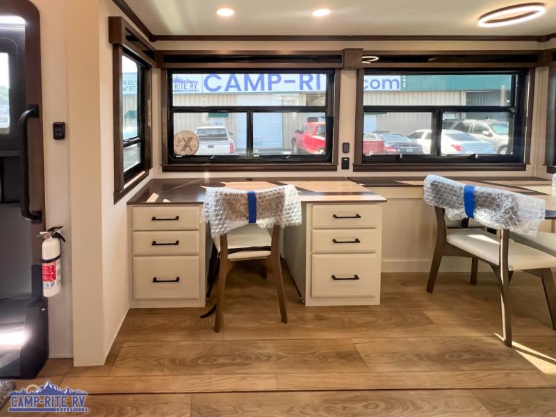 Show your family a good time with this RiverStone fifth wheel! You will get to stay in a super comfortable master suite at the front of this unit which has a dual-sink vanity in the full bathroom. The bedroom offers you a king-size bed that you can rest on while you watch the 40" LED TV across from you, and there is a half bathroom just outside the bedroom for your friends or family to use. If you've decided to bring work with you on the road, you'll be grateful to find a desk in the living area, and the pull-out dinette is a great place to sit down for meals. Work your magic in the kitchen and prepare something delicious on the four-burner range for everyone to eat.