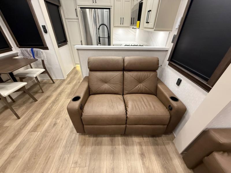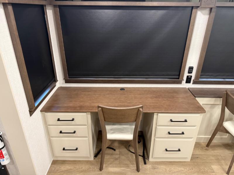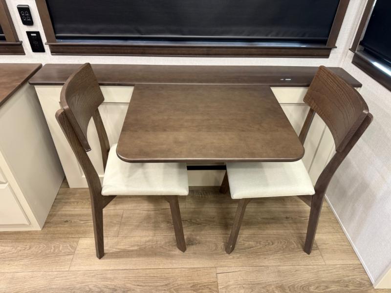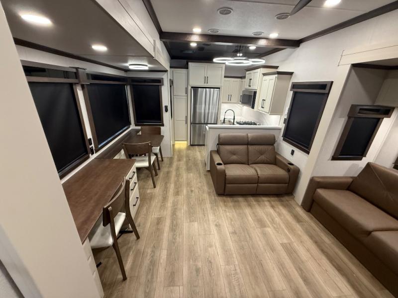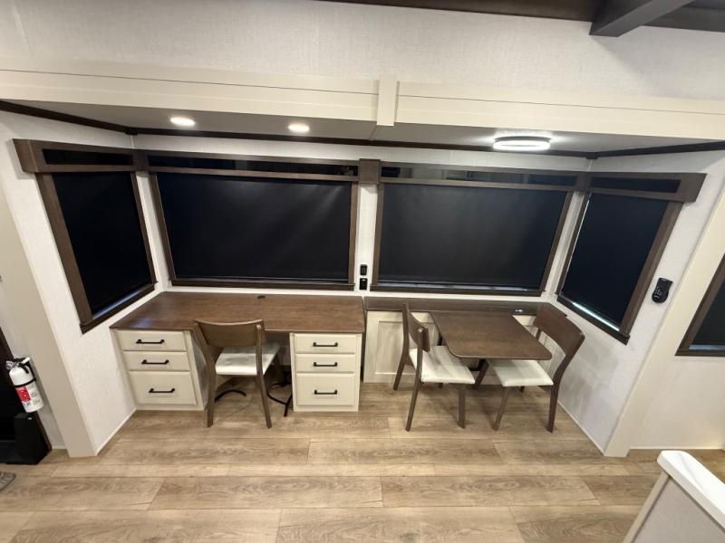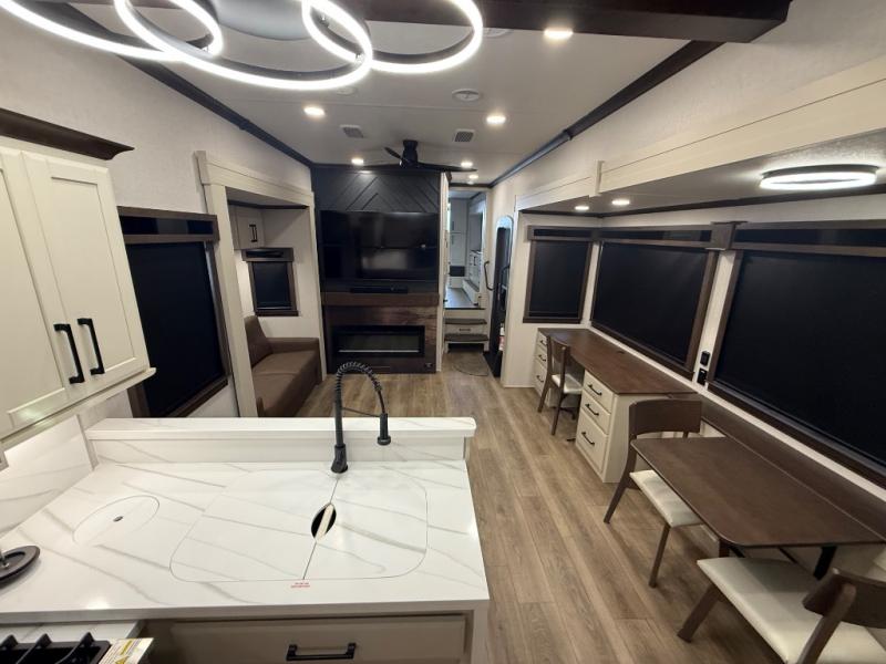 Show your family a good time with this RiverStone fifth wheel! You will get to stay in a super comfortable master suite at the front of this unit which has a dual-sink vanity in the full bathroom. The bedroom offers you a king-size bed that you can rest on while you watch the 40" LED TV across from you, and there is a half bathroom just outside the bedroom for your friends or family to use. If you've decided to bring work with you on the road, you'll be grateful to find a desk in the living area, and the pull-out dinette is a great place to sit down for meals. Work your magic in the kitchen and prepare something delicious on the four-burner range for everyone to eat.
