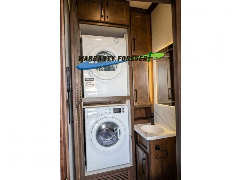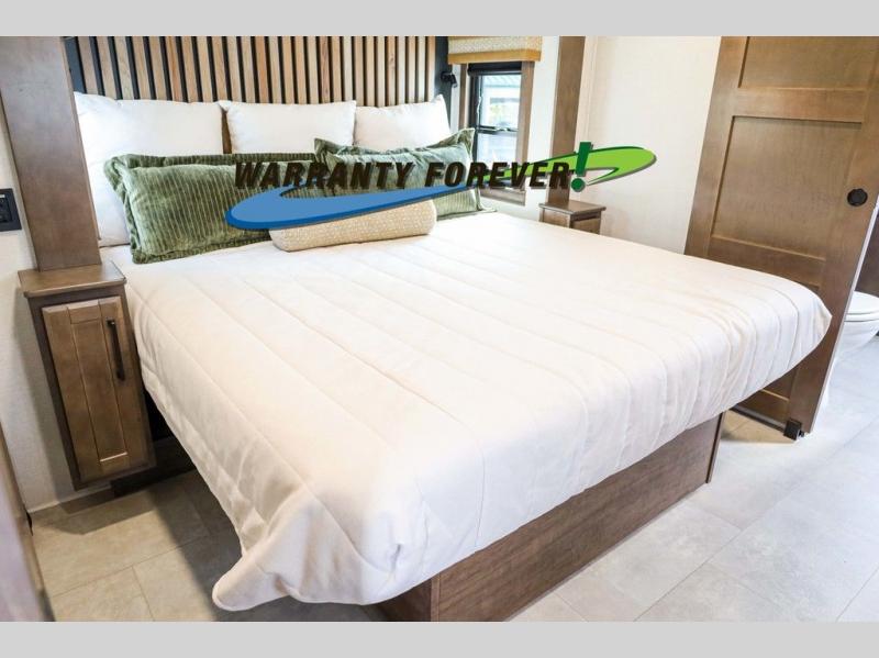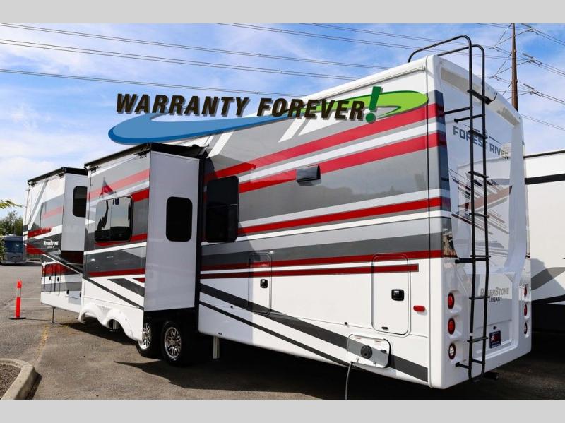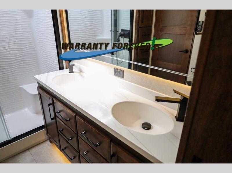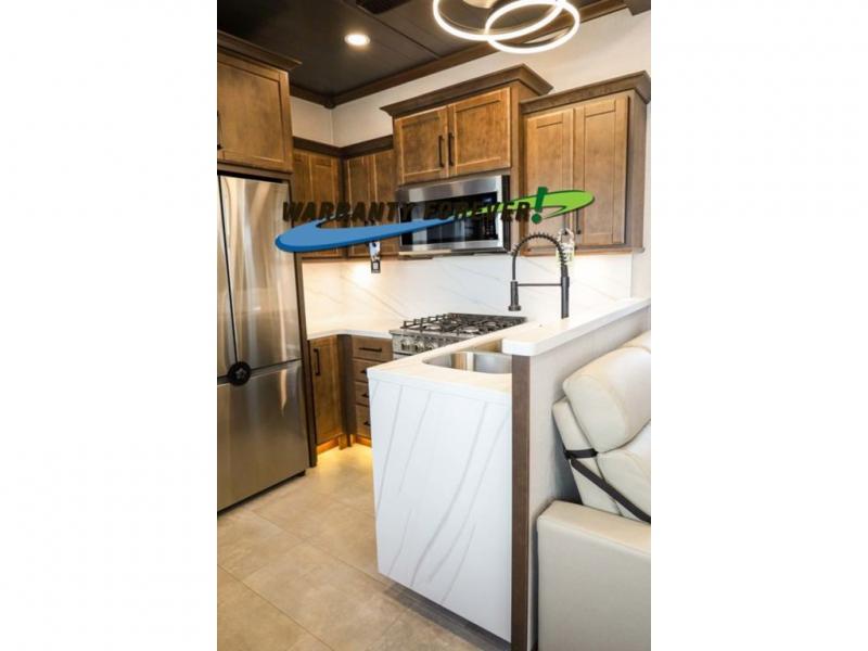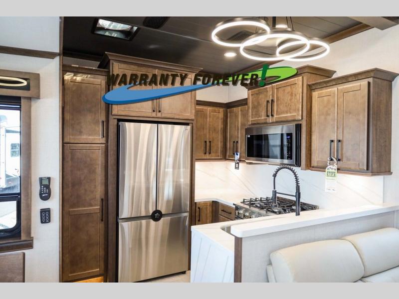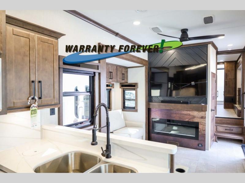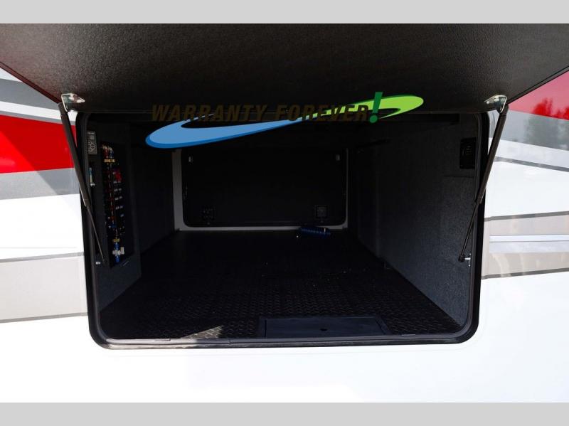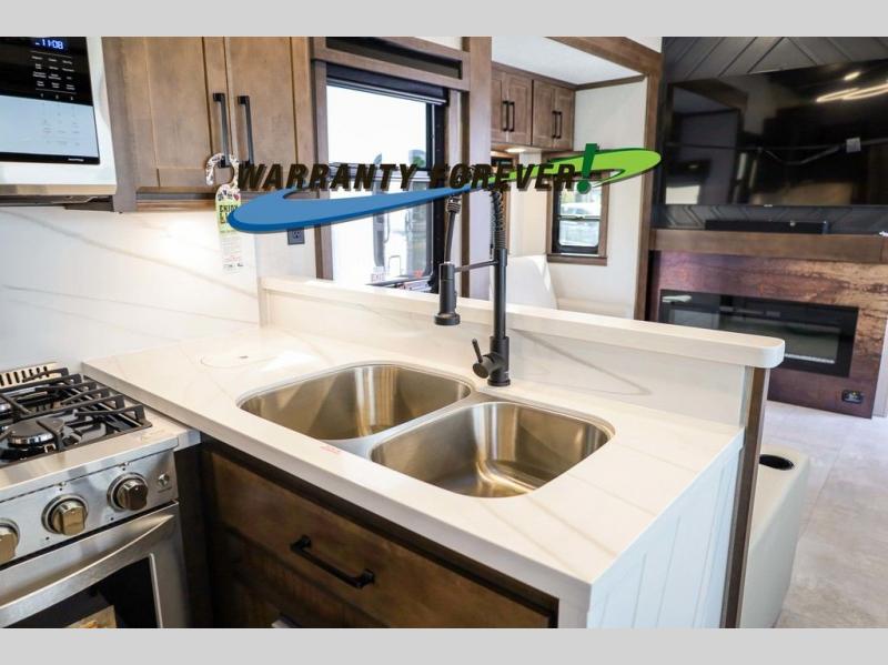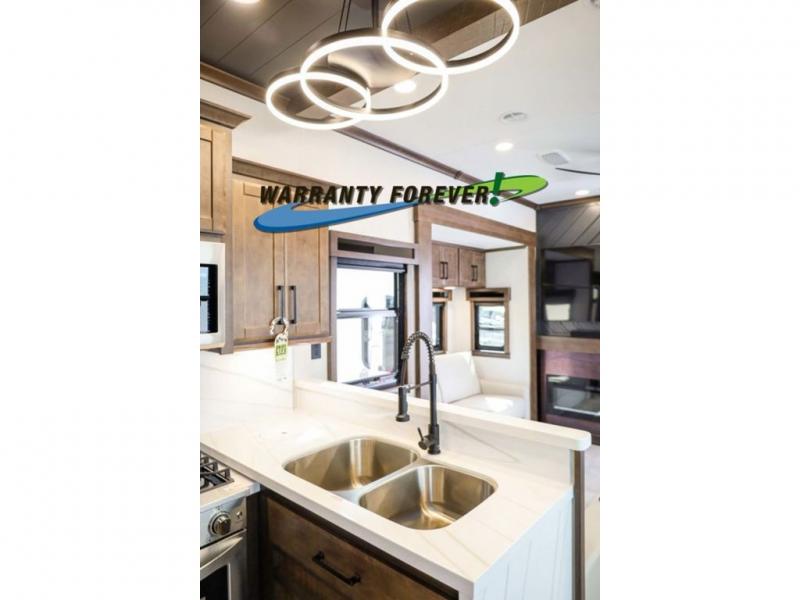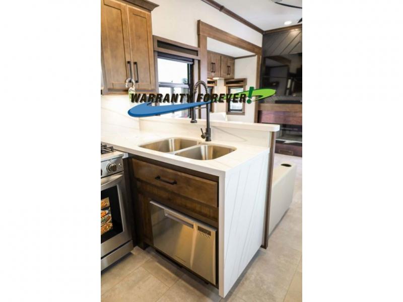 The Forest River RiverStone fifth wheels and toy haulers are luxurious units that have it all! You'll find an automatic six-point hydraulic level-up system to keep your unit in place, and there is preparation for a four-camera observation system. The TravlFi Journey XTR 4G/LTE router and WiFi extender will help you stay connected to the outside world, and you'll never have to overpack again since the Splendid “Astral” stackable washer and dryer will let you clean the small amount of clothes you've brought with you. Another high luxury is the Fischer Paykal dishwasher which will allow you to spend more time enjoying your camp life and less time cleaning up. Each unit is built with an LCI Road Armour suspension system, dual-pane frameless windows, a full docking station, a 200W solar panel, and a BMPro touch control system.