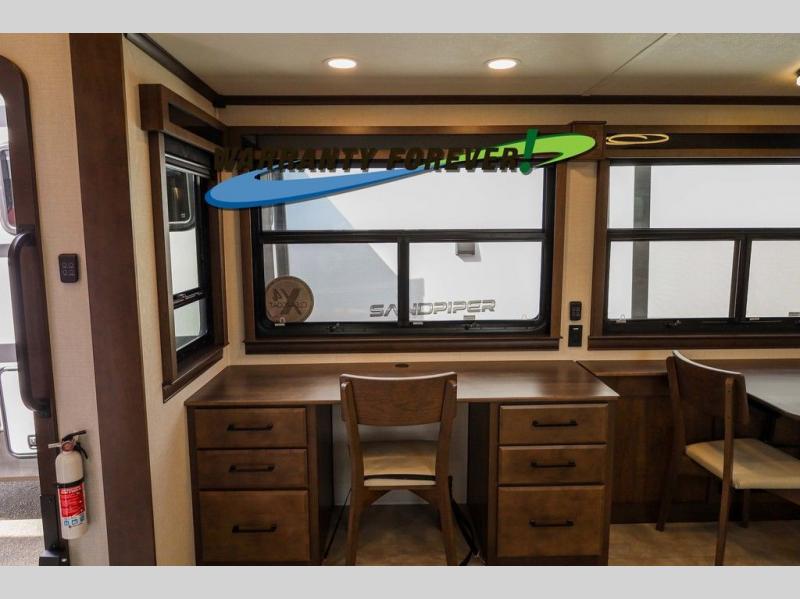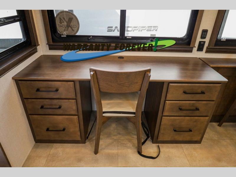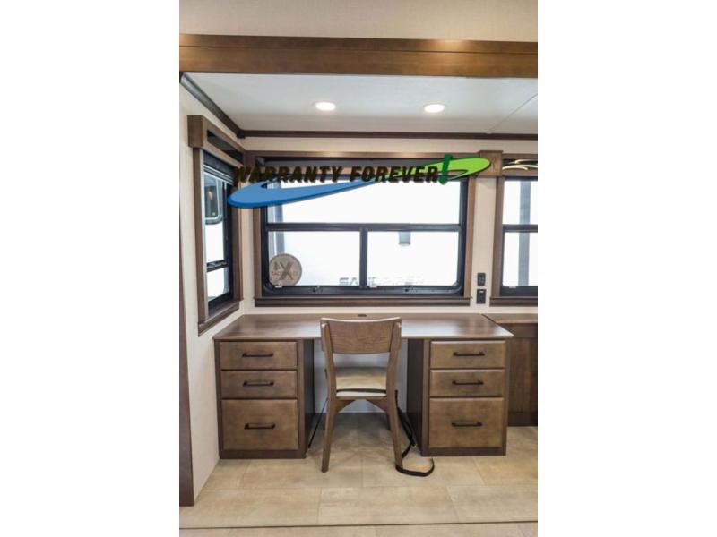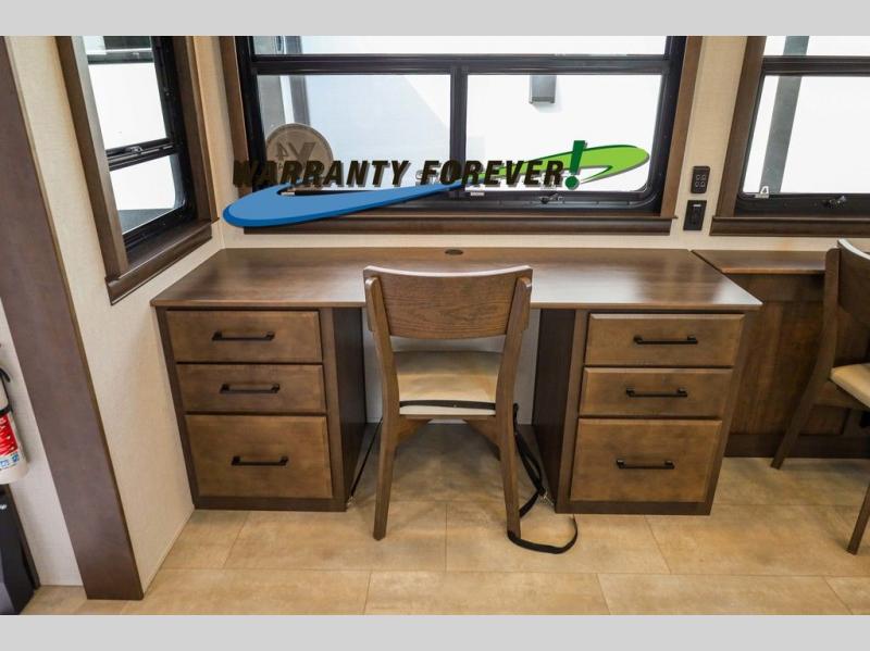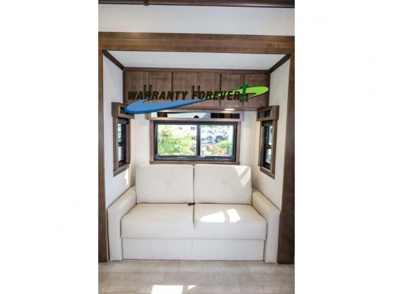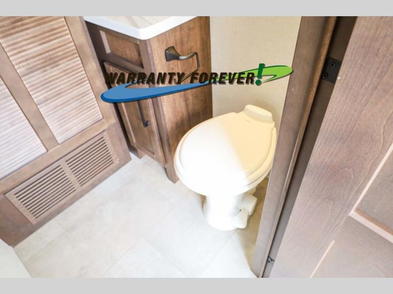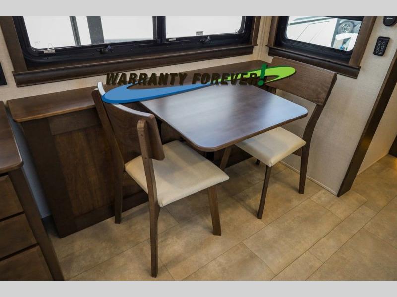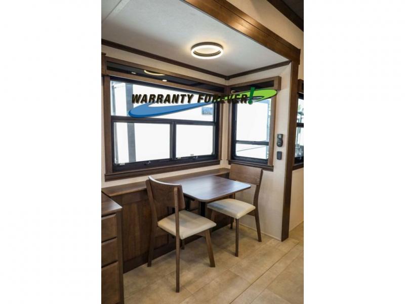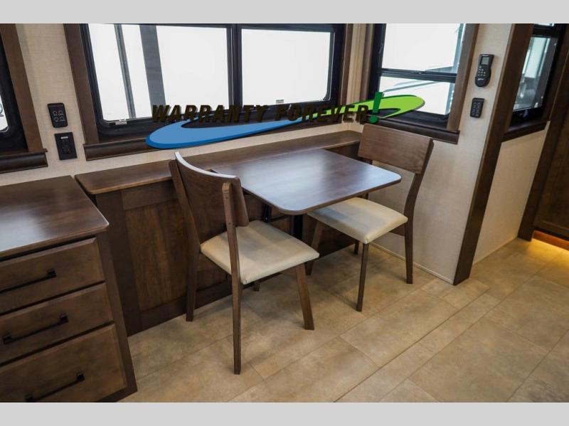 Show your family a good time with this RiverStone fifth wheel! You will get to stay in a super comfortable master suite at the front of this unit which has a dual-sink vanity in the full bathroom. The bedroom offers you a king-size bed that you can rest on while you watch the 40" LED TV across from you, and there is a half bathroom just outside the bedroom for your friends or family to use. If you've decided to bring work with you on the road, you'll be grateful to find a desk in the living area, and the pull-out dinette is a great place to sit down for meals. Work your magic in the kitchen and prepare something delicious on the four-burner range for everyone to eat.