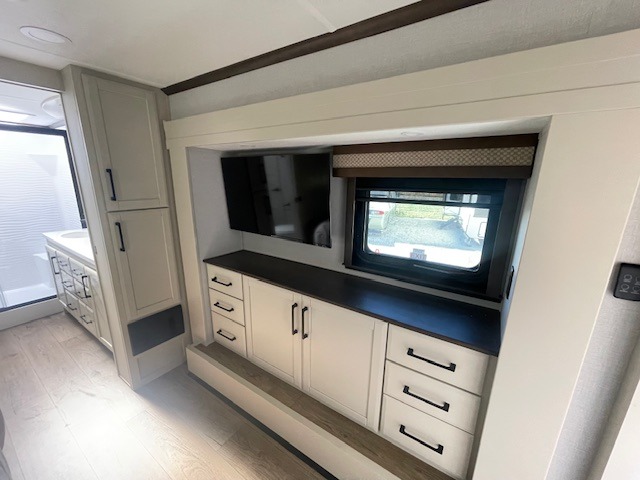 Show your family a good time with this RiverStone fifth wheel! You will get to stay in a super comfortable master suite at the front of this unit which has a dual-sink vanity in the full bathroom. The bedroom offers you a king-size bed that you can rest on while you watch the 40" LED TV across from you, and there is a half bathroom just outside the bedroom for your friends or family to use. If you've decided to bring work with you on the road, you'll be grateful to find a desk in the living area, and the pull-out dinette is a great place to sit down for meals. Work your magic in the kitchen and prepare something delicious on the four-burner range for everyone to eat.