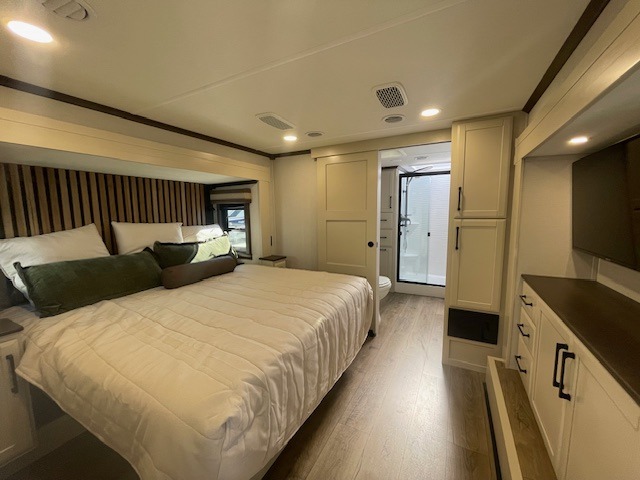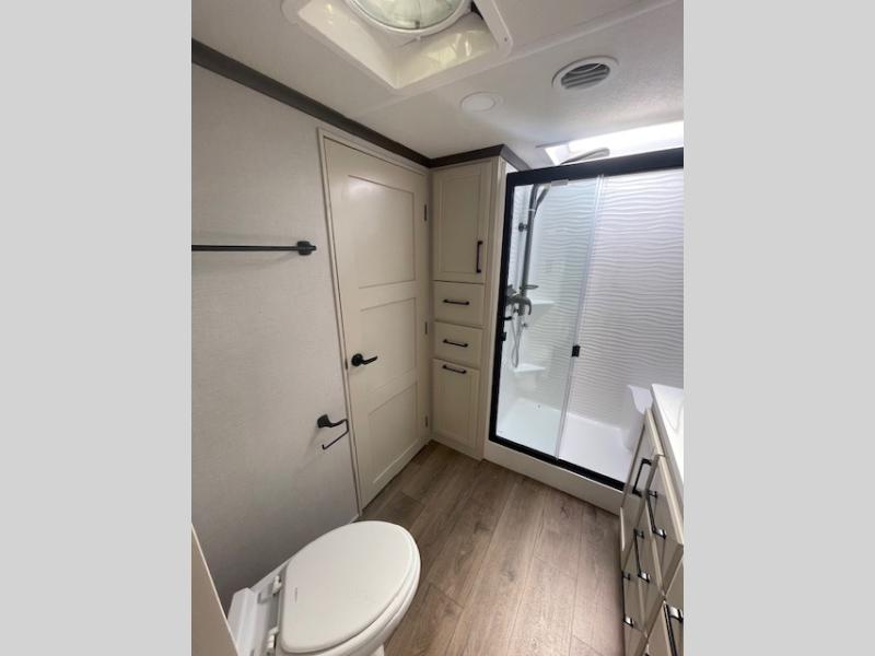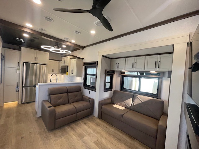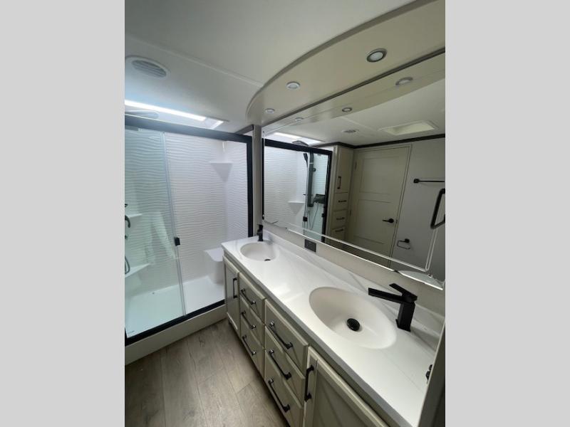 The Forest River RiverStone fifth wheels and toy haulers are luxurious units that have it all! You'll find an automatic six-point hydraulic level-up system to keep your unit in place, and there is preparation for a four-camera observation system. The TravlFi Journey XTR 4G/LTE router and WiFi extender will help you stay connected to the outside world, and you'll never have to overpack again since the Splendid “Astral” stackable washer and dryer will let you clean the small amount of clothes you've brought with you. Another high luxury is the Fischer Paykal dishwasher which will allow you to spend more time enjoying your camp life and less time cleaning up. Each unit is built with an LCI Road Armour suspension system, dual-pane frameless windows, a full docking station, a 200W solar panel, and a BMPro touch control system.