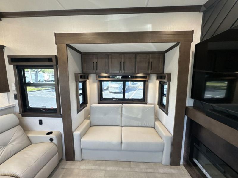 Show your family a good time with this RiverStone fifth wheel! You will get to stay in a super comfortable master suite at the front of this unit which has a dual-sink vanity in the full bathroom. The bedroom offers you a king-size bed that you can rest on while you watch the 40" LED TV across from you, and there is a half bathroom just outside the bedroom for your friends or family to use. If you've decided to bring work with you on the road, you'll be grateful to find a desk in the living area, and the pull-out dinette is a great place to sit down for meals. Work your magic in the kitchen and prepare something delicious on the four-burner range for everyone to eat.