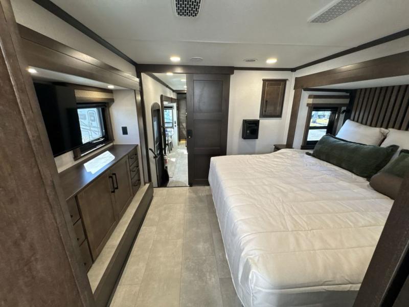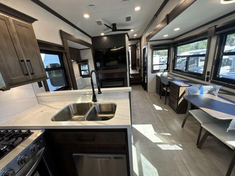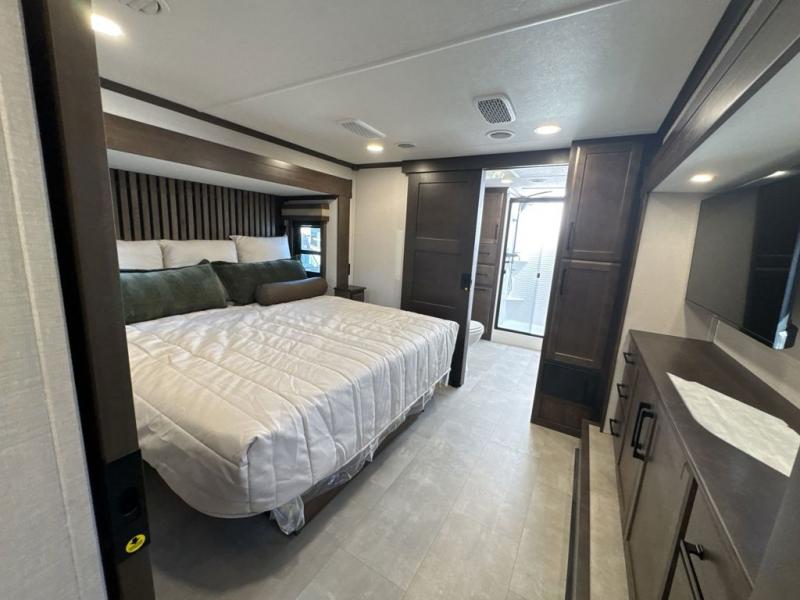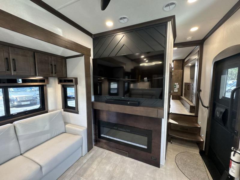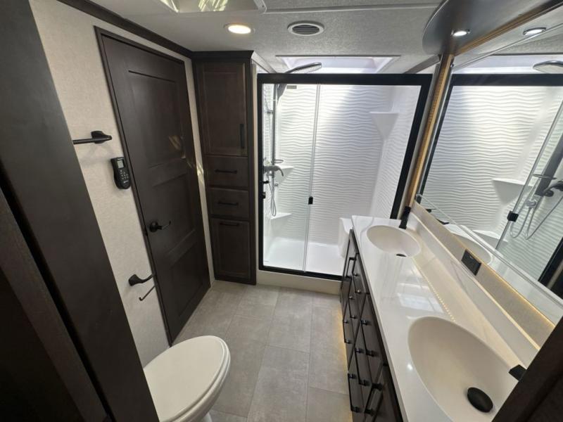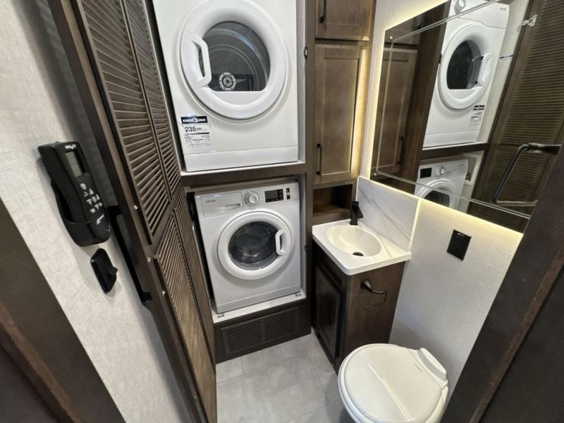 The Forest River RiverStone fifth wheels and toy haulers are luxurious units that have it all! You'll find an automatic six-point hydraulic level-up system to keep your unit in place, and there is preparation for a four-camera observation system. The TravlFi Journey XTR 4G/LTE router and WiFi extender will help you stay connected to the outside world, and you'll never have to overpack again since the Splendid “Astral” stackable washer and dryer will let you clean the small amount of clothes you've brought with you. Another high luxury is the Fischer Paykal dishwasher which will allow you to spend more time enjoying your camp life and less time cleaning up. Each unit is built with an LCI Road Armour suspension system, dual-pane frameless windows, a full docking station, a 200W solar panel, and a BMPro touch control system.