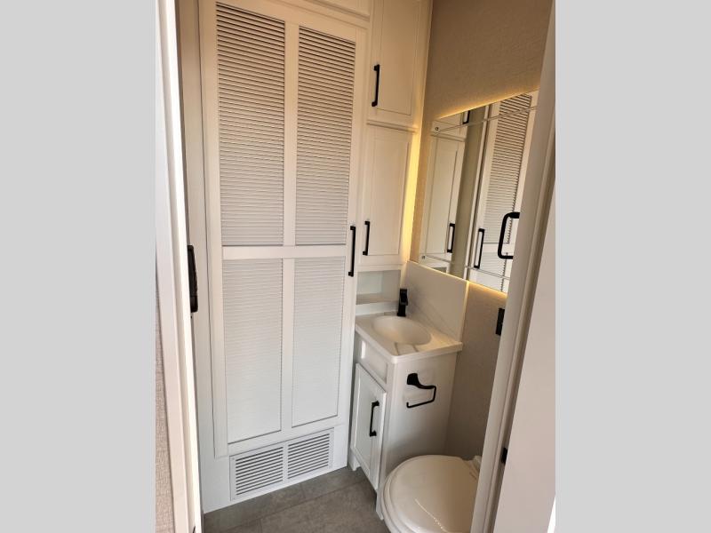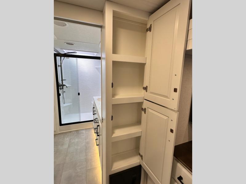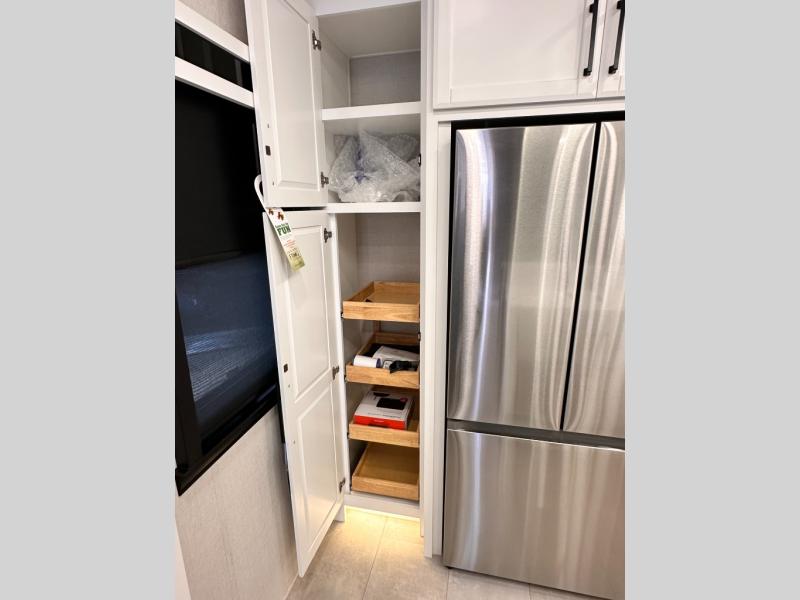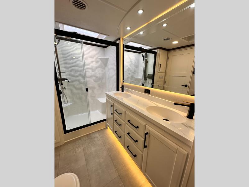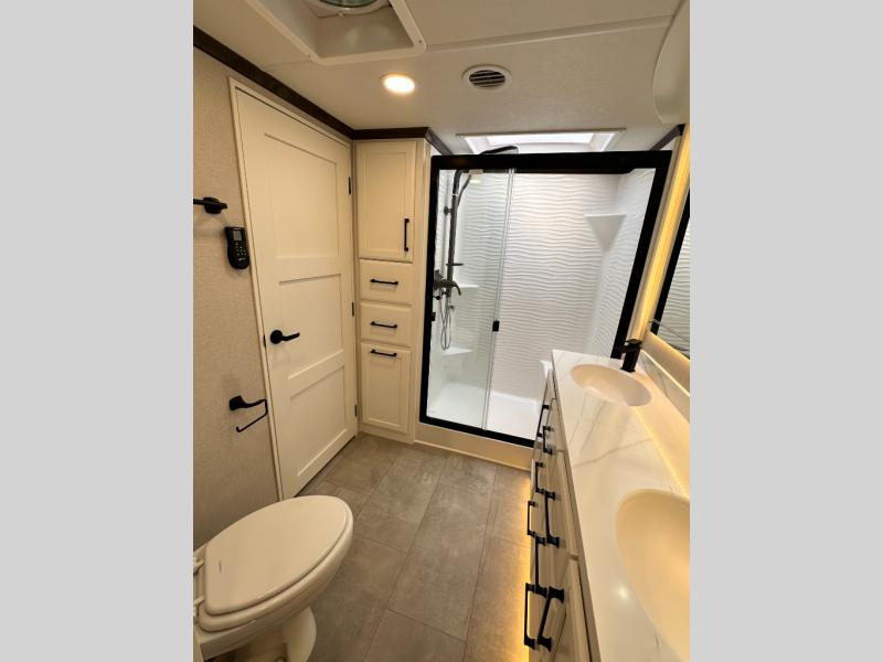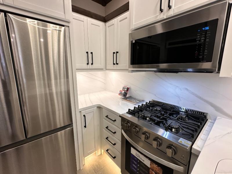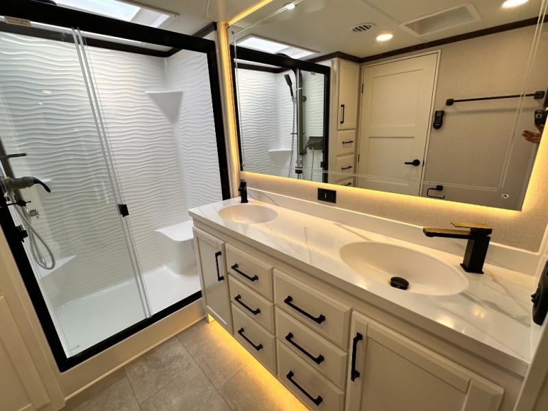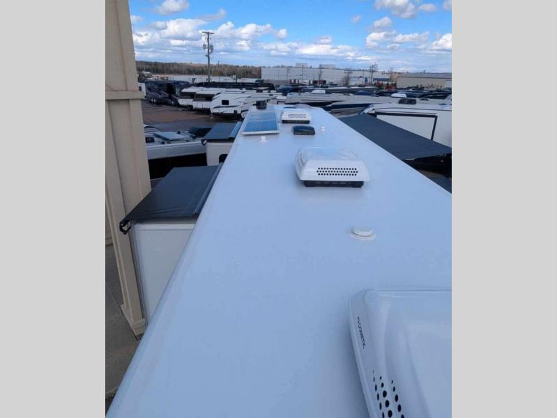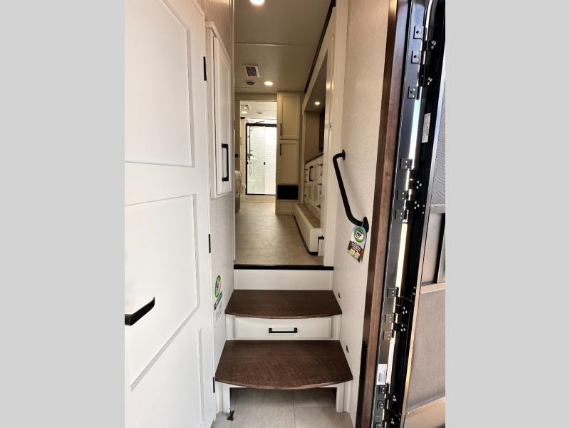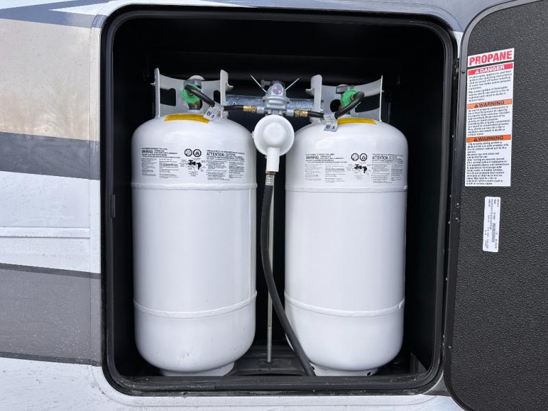 The Forest River RiverStone fifth wheels and toy haulers are luxurious units that have it all! You'll find an automatic six-point hydraulic level-up system to keep your unit in place, and there is preparation for a four-camera observation system. The TravlFi Journey XTR 4G/LTE router and WiFi extender will help you stay connected to the outside world, and you'll never have to overpack again since the Splendid “Astral” stackable washer and dryer will let you clean the small amount of clothes you've brought with you. Another high luxury is the Fischer Paykal dishwasher which will allow you to spend more time enjoying your camp life and less time cleaning up. Each unit is built with an LCI Road Armour suspension system, dual-pane frameless windows, a full docking station, a 200W solar panel, and a BMPro touch control system.