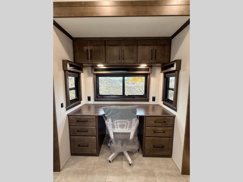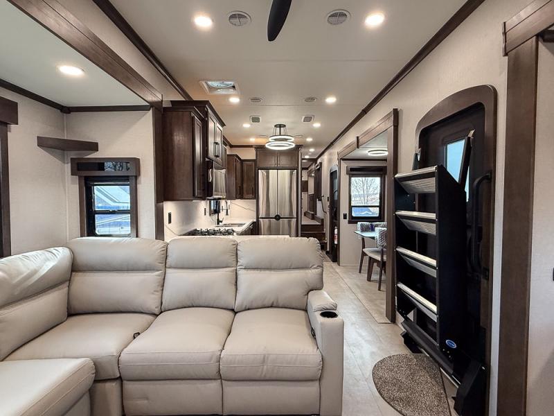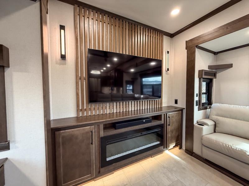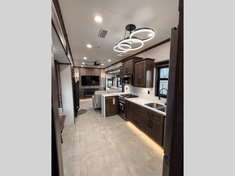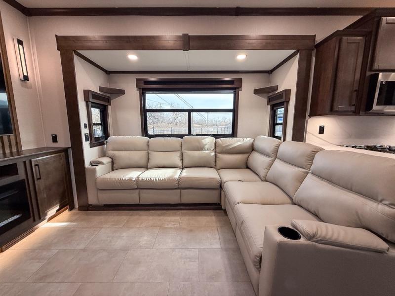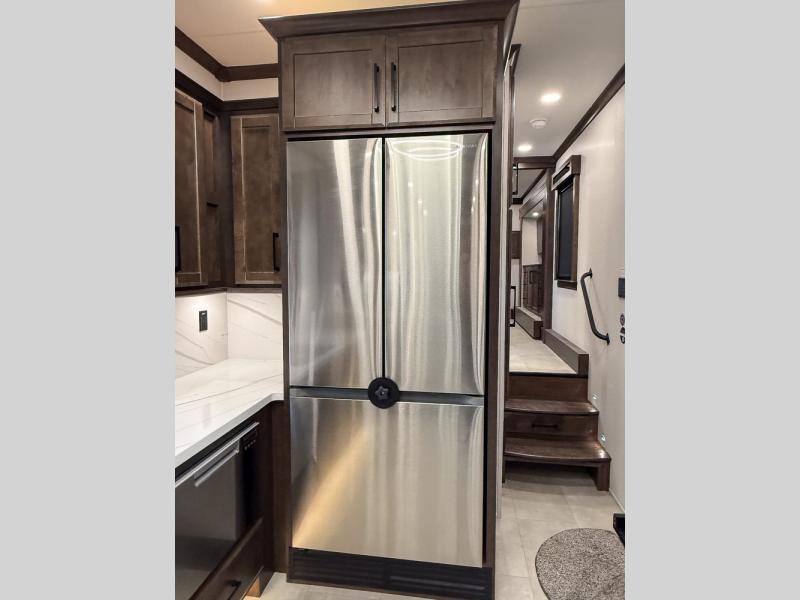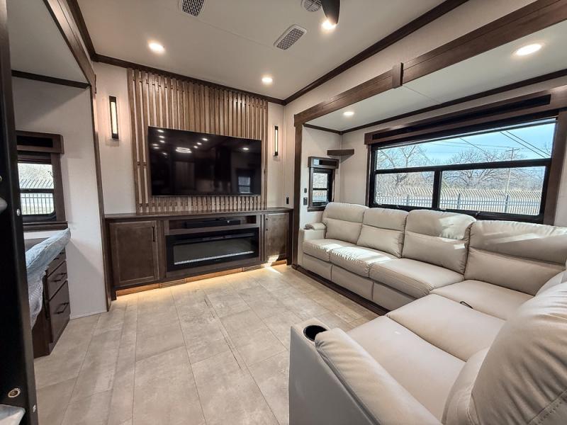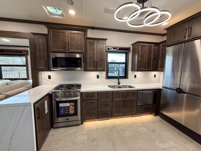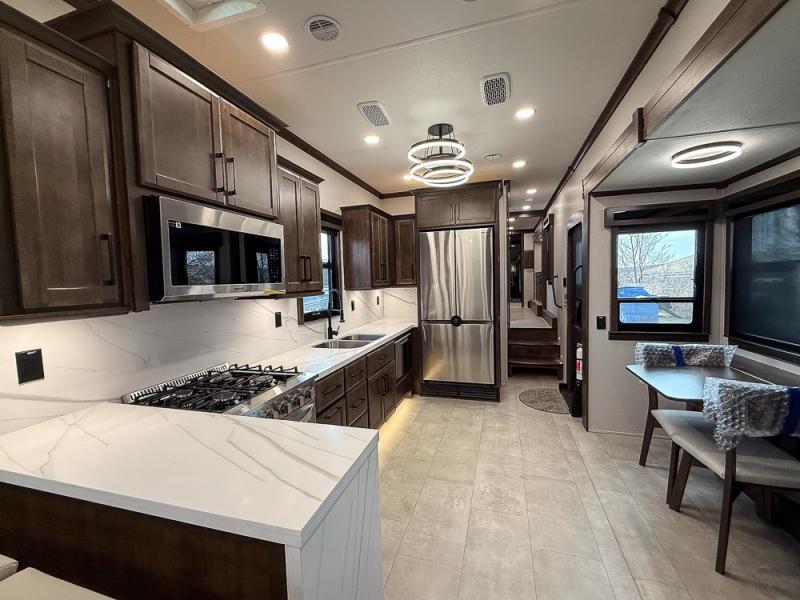 Step into luxury with this fifth wheel, where a high-end design, smart amenities, and functional living combine for an unmatched fifth wheel experience. As you enter you will find yourself in a spacious Kitchen for serious cooking: solid surface countertops, a full 18 cu. ft. french door refrigerator with ice maker, large stainless steel sink and residential-style faucet. Find yourself five slides that will create room for comfortable seating while you cozy up by the fireplace and watch your favorite movie or be as productive as you'd like with the slide out desk space. After a long day of travelling you will surely love to the front bedroom featuring a 72 x 80 king bed to finish your day with a good night's sleep.
