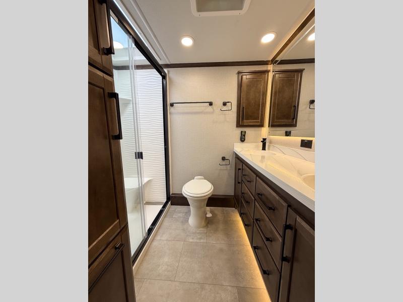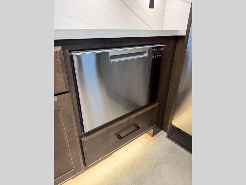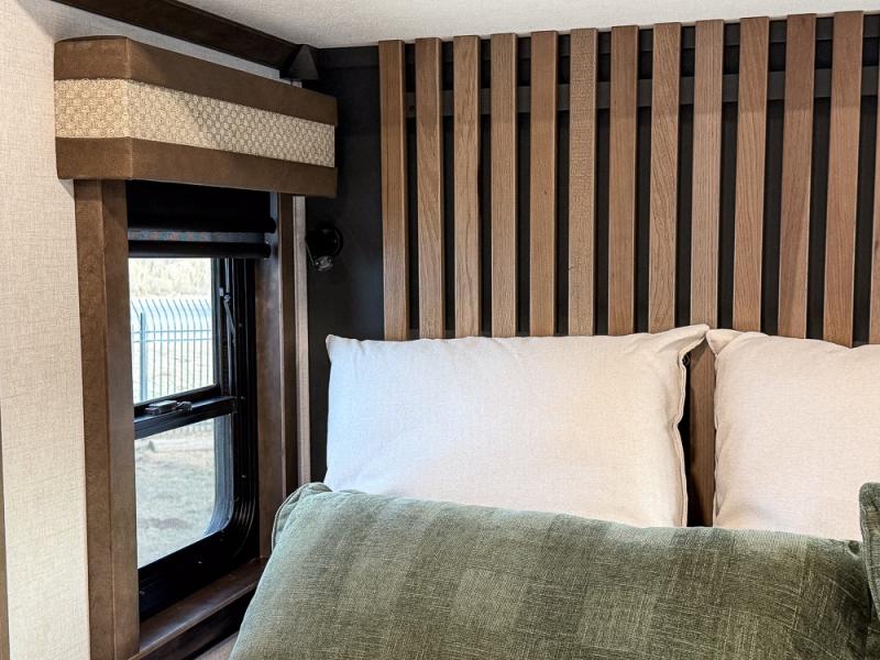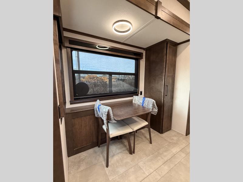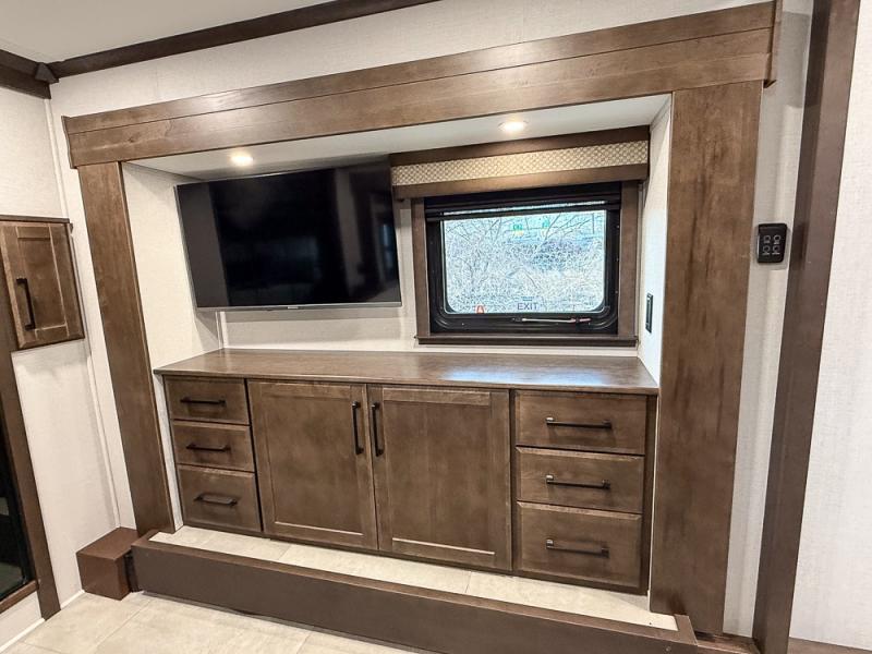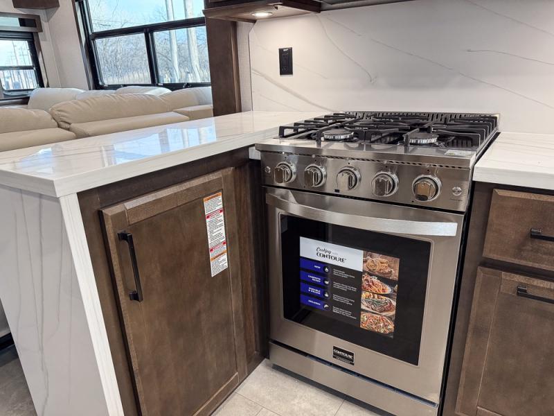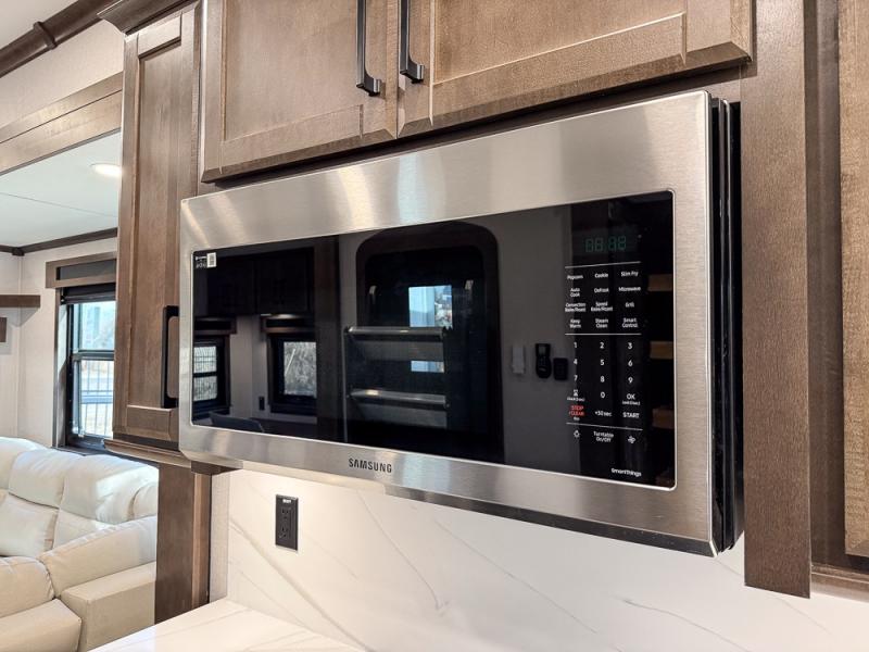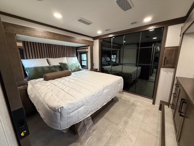 Step into luxury with this fifth wheel, where a high-end design, smart amenities, and functional living combine for an unmatched fifth wheel experience. As you enter you will find yourself in a spacious Kitchen for serious cooking: solid surface countertops, a full 18 cu. ft. french door refrigerator with ice maker, large stainless steel sink and residential-style faucet. Find yourself five slides that will create room for comfortable seating while you cozy up by the fireplace and watch your favorite movie or be as productive as you'd like with the slide out desk space. After a long day of travelling you will surely love to the front bedroom featuring a 72 x 80 king bed to finish your day with a good night's sleep.