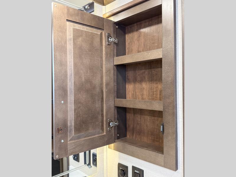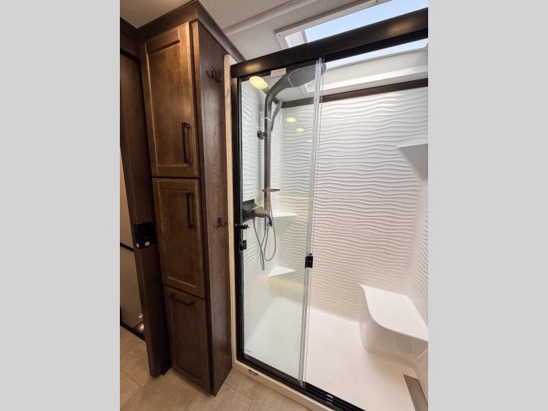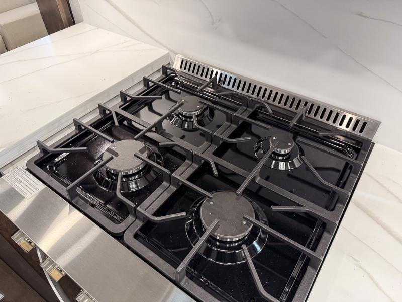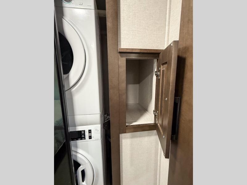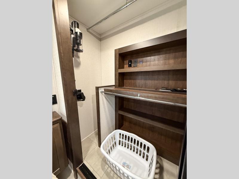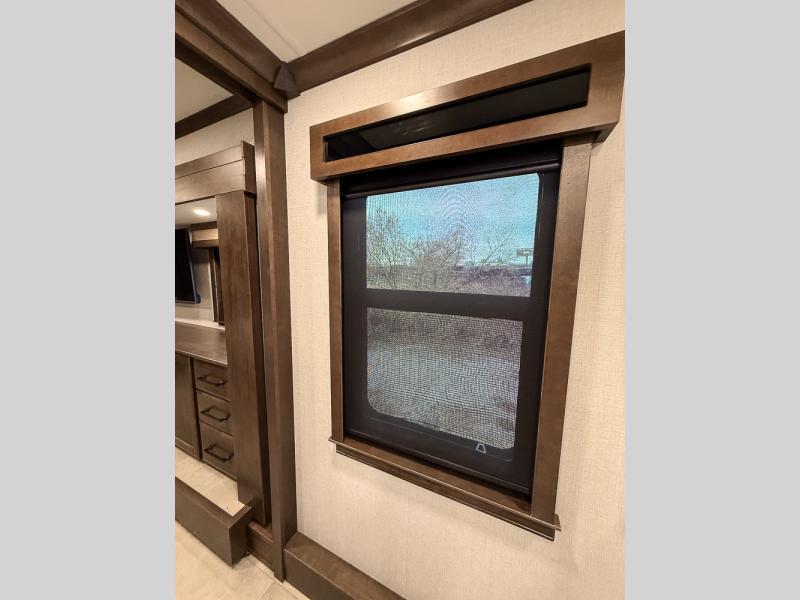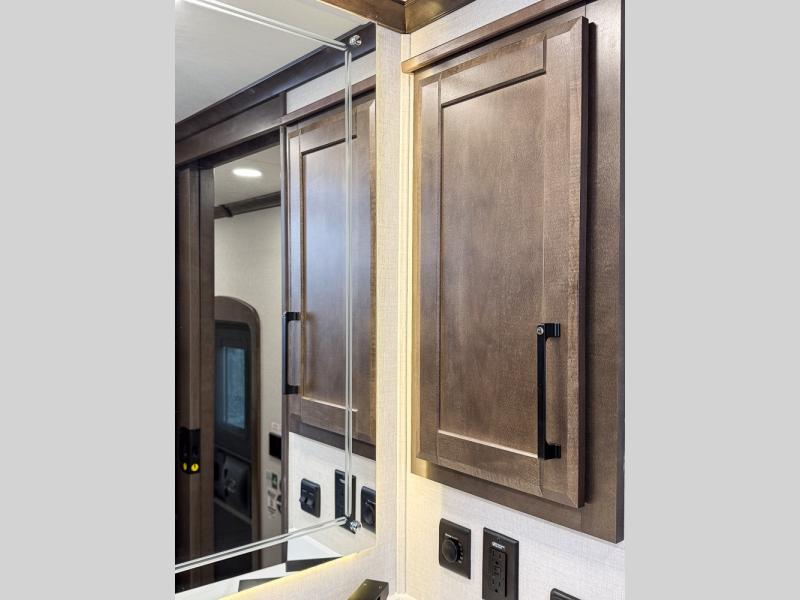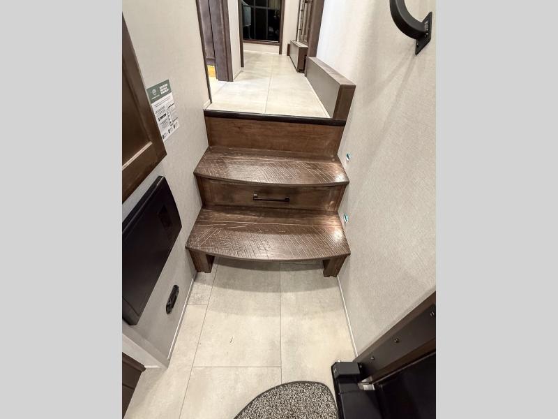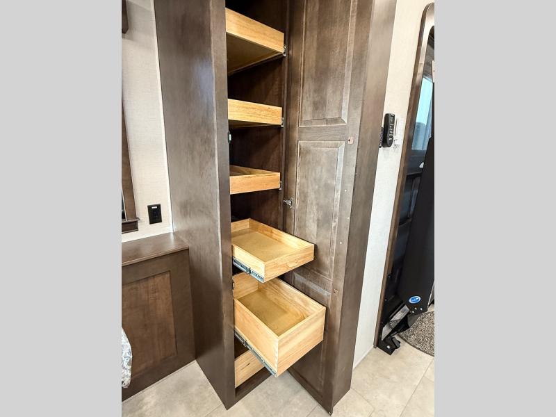 Step into luxury with this fifth wheel, where a high-end design, smart amenities, and functional living combine for an unmatched fifth wheel experience. As you enter you will find yourself in a spacious Kitchen for serious cooking: solid surface countertops, a full 18 cu. ft. french door refrigerator with ice maker, large stainless steel sink and residential-style faucet. Find yourself five slides that will create room for comfortable seating while you cozy up by the fireplace and watch your favorite movie or be as productive as you'd like with the slide out desk space. After a long day of travelling you will surely love to the front bedroom featuring a 72 x 80 king bed to finish your day with a good night's sleep.