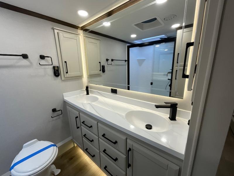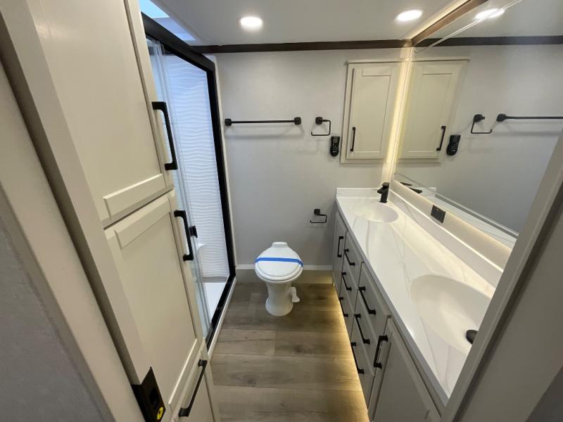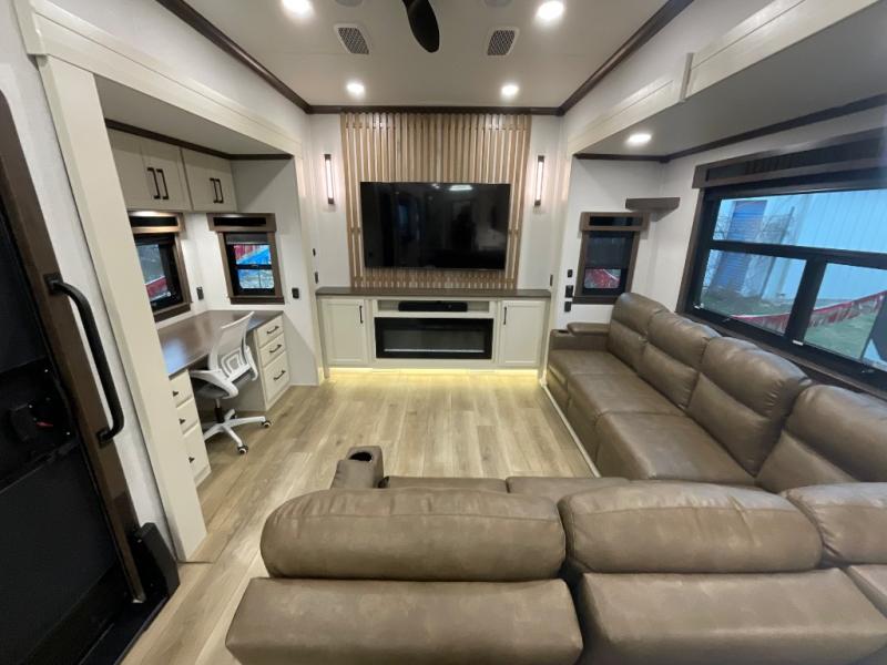 Step into luxury with this fifth wheel, where a high-end design, smart amenities, and functional living combine for an unmatched fifth wheel experience. As you enter you will find yourself in a spacious Kitchen for serious cooking: solid surface countertops, a full 18 cu. ft. french door refrigerator with ice maker, large stainless steel sink and residential-style faucet. Find yourself five slides that will create room for comfortable seating while you cozy up by the fireplace and watch your favorite movie or be as productive as you'd like with the slide out desk space. After a long day of travelling you will surely love to the front bedroom featuring a 72 x 80 king bed to finish your day with a good night's sleep.