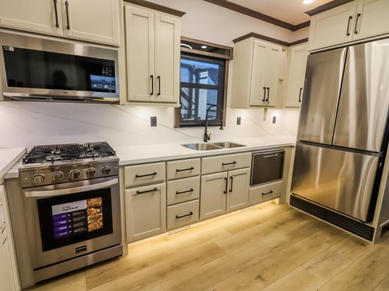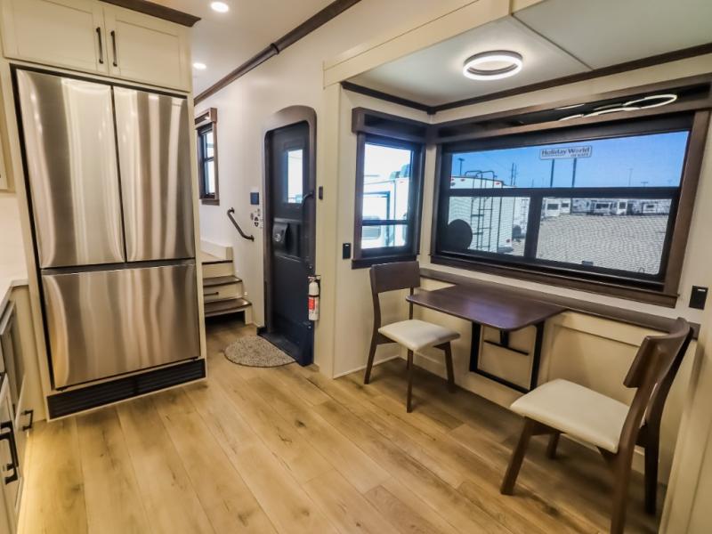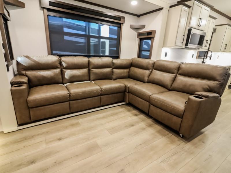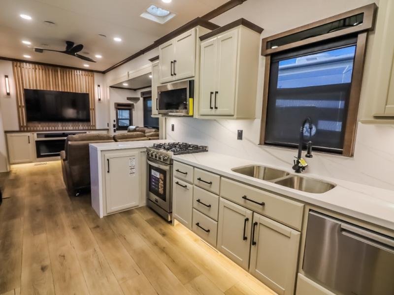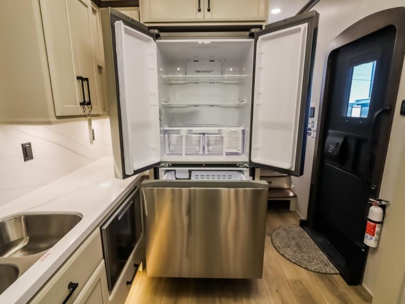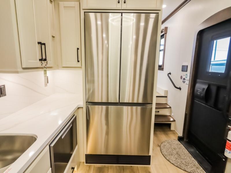 Step into luxury with this fifth wheel, where a high-end design, smart amenities, and functional living combine for an unmatched fifth wheel experience. As you enter you will find yourself in a spacious Kitchen for serious cooking: solid surface countertops, a full 18 cu. ft. french door refrigerator with ice maker, large stainless steel sink and residential-style faucet. Find yourself five slides that will create room for comfortable seating while you cozy up by the fireplace and watch your favorite movie or be as productive as you'd like with the slide out desk space. After a long day of travelling you will surely love to the front bedroom featuring a 72 x 80 king bed to finish your day with a good night's sleep.