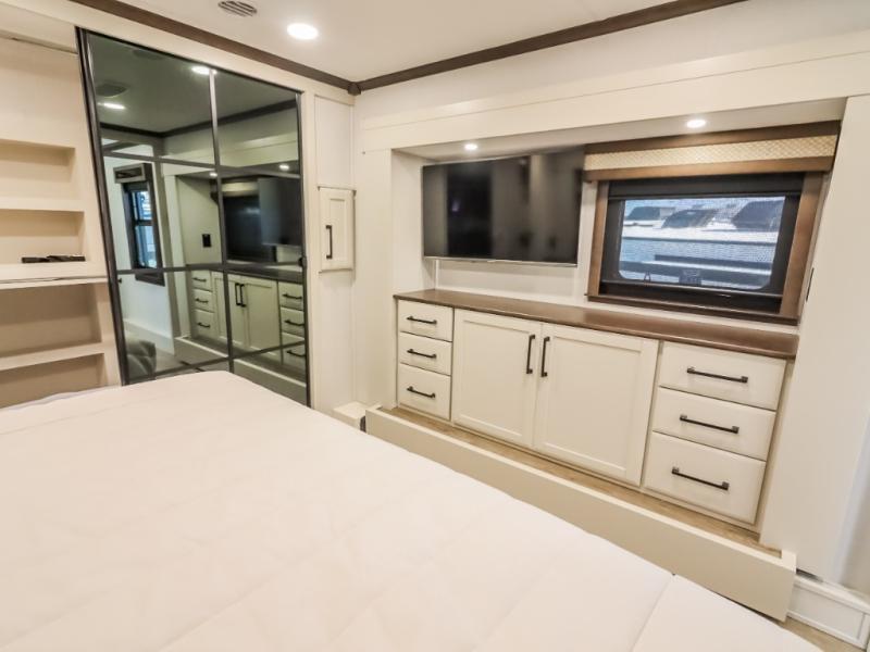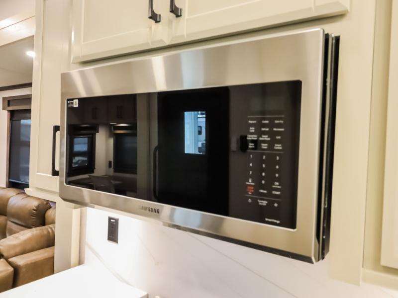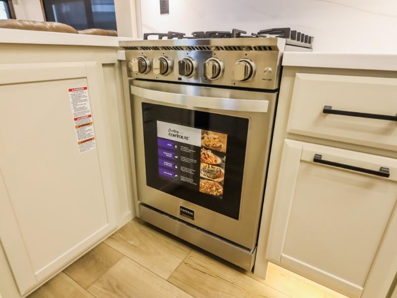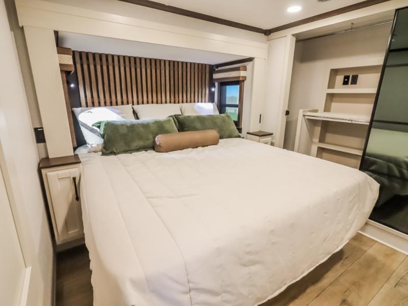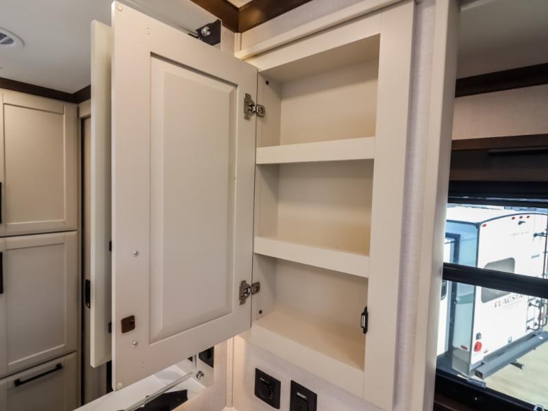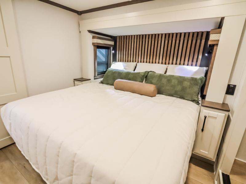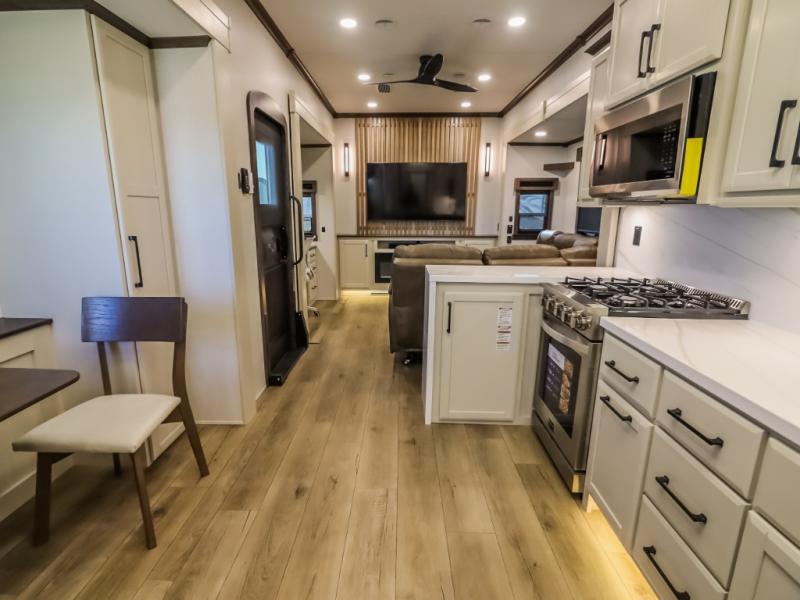 Step into luxury with this fifth wheel, where a high-end design, smart amenities, and functional living combine for an unmatched fifth wheel experience. As you enter you will find yourself in a spacious Kitchen for serious cooking: solid surface countertops, a full 18 cu. ft. french door refrigerator with ice maker, large stainless steel sink and residential-style faucet. Find yourself five slides that will create room for comfortable seating while you cozy up by the fireplace and watch your favorite movie or be as productive as you'd like with the slide out desk space. After a long day of travelling you will surely love to the front bedroom featuring a 72 x 80 king bed to finish your day with a good night's sleep.