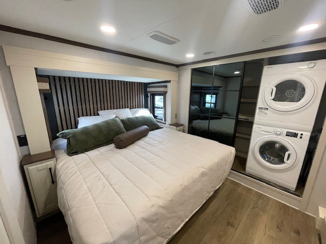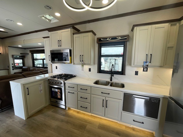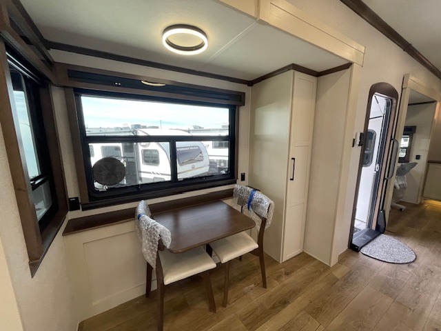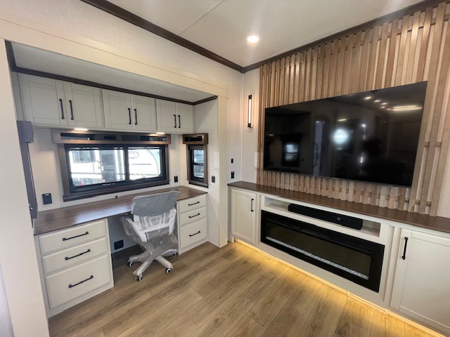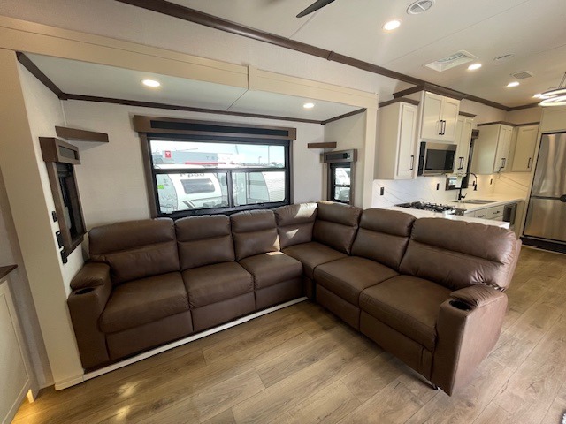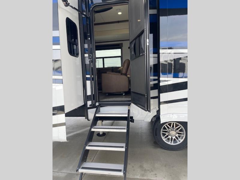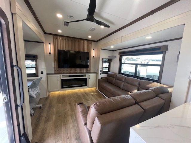 Step into luxury with this fifth wheel, where a high-end design, smart amenities, and functional living combine for an unmatched fifth wheel experience. As you enter you will find yourself in a spacious Kitchen for serious cooking: solid surface countertops, a full 18 cu. ft. french door refrigerator with ice maker, large stainless steel sink and residential-style faucet. Find yourself five slides that will create room for comfortable seating while you cozy up by the fireplace and watch your favorite movie or be as productive as you'd like with the slide out desk space. After a long day of travelling you will surely love to the front bedroom featuring a 72 x 80 king bed to finish your day with a good night's sleep.