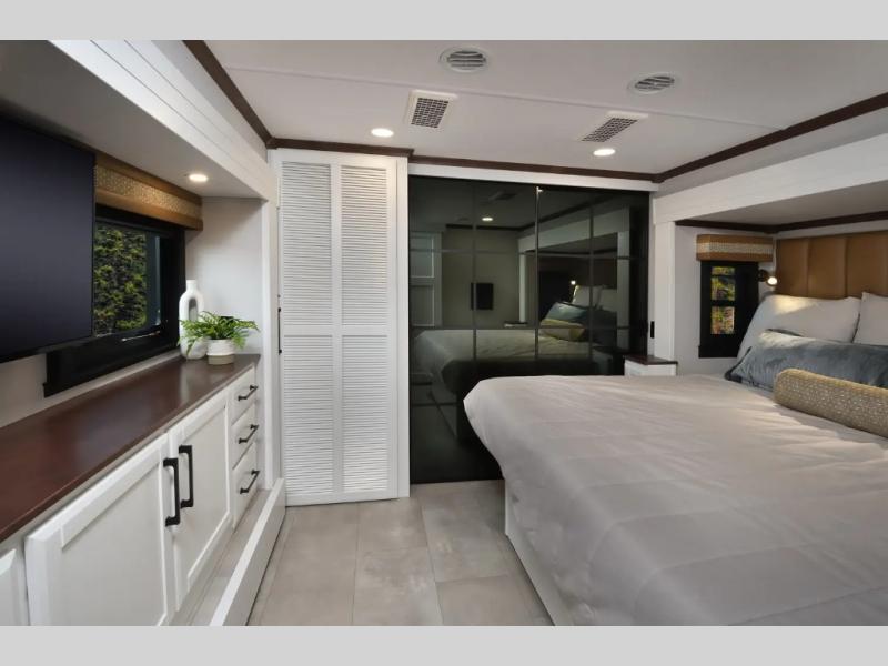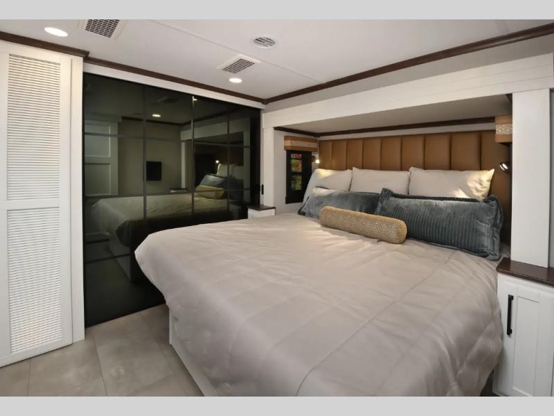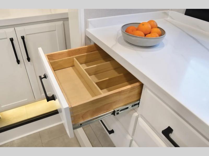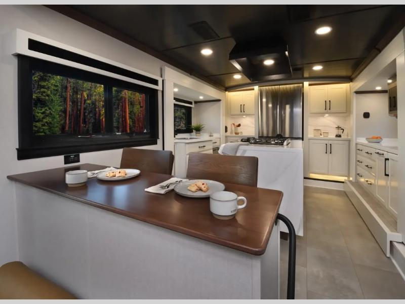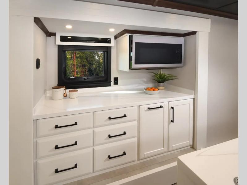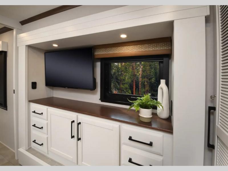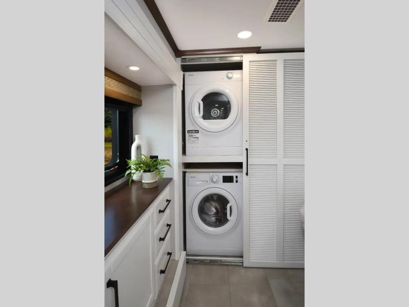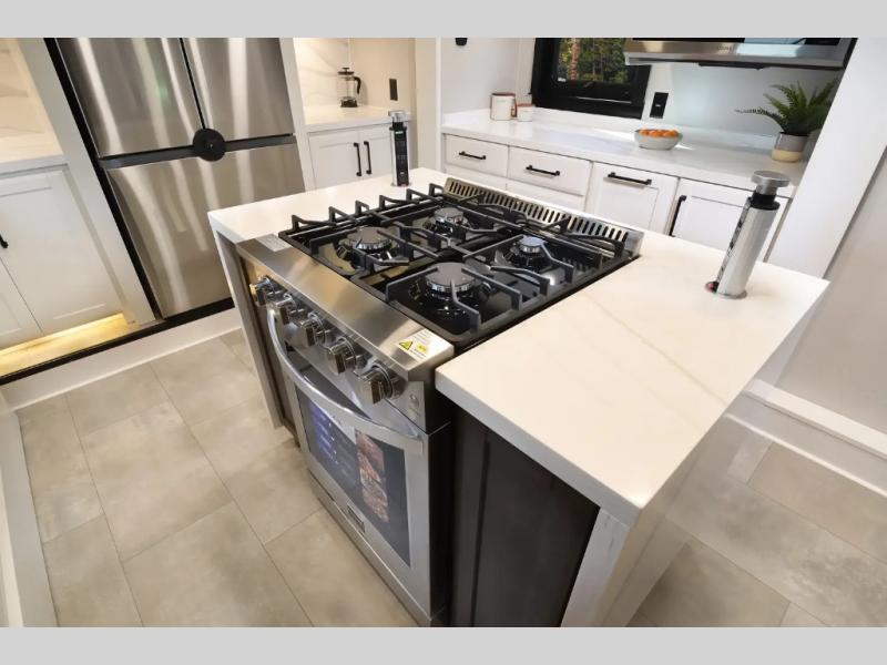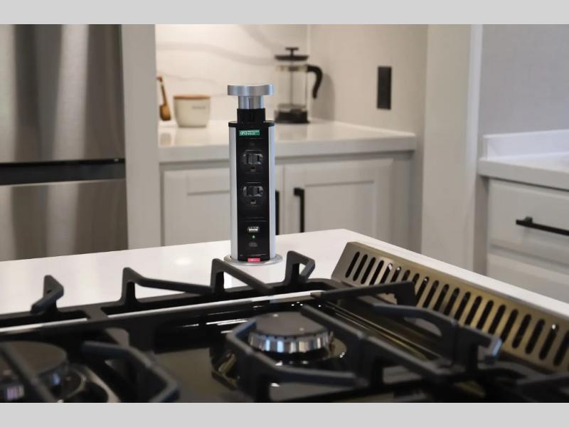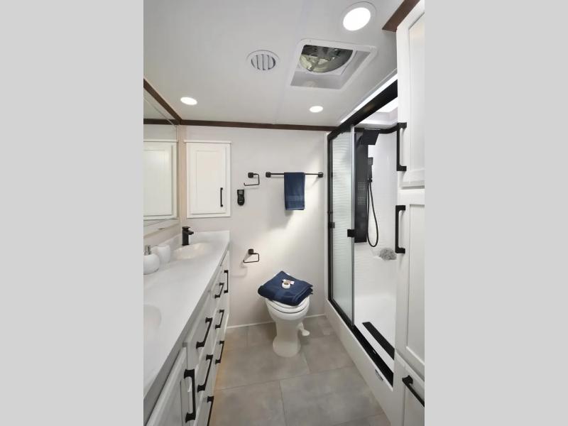The Forest River RiverStone fifth wheels and toy haulers are luxurious units that have it all! You'll find an automatic six-point hydraulic level-up system to keep your unit in place, and there is preparation for a four-camera observation system. The King Wi-Fi Max router and omni-directional Wi-Fi antenna/extender will help you stay connected to the outside world, and you'll never have to overpack again since the Splendid “Astral” stackable washer and dryer will let you clean the small amount of clothes you've brought with you. Another high luxury is the Fischer Paykal dishwasher which will allow you to spend more time enjoying your camp life and less time cleaning up. Each unit is built with a Trail-Aire Road Armour suspension system, dual-pane frameless windows, a full docking station, a 190W solar panel, and a Firefly integrated touch control system.