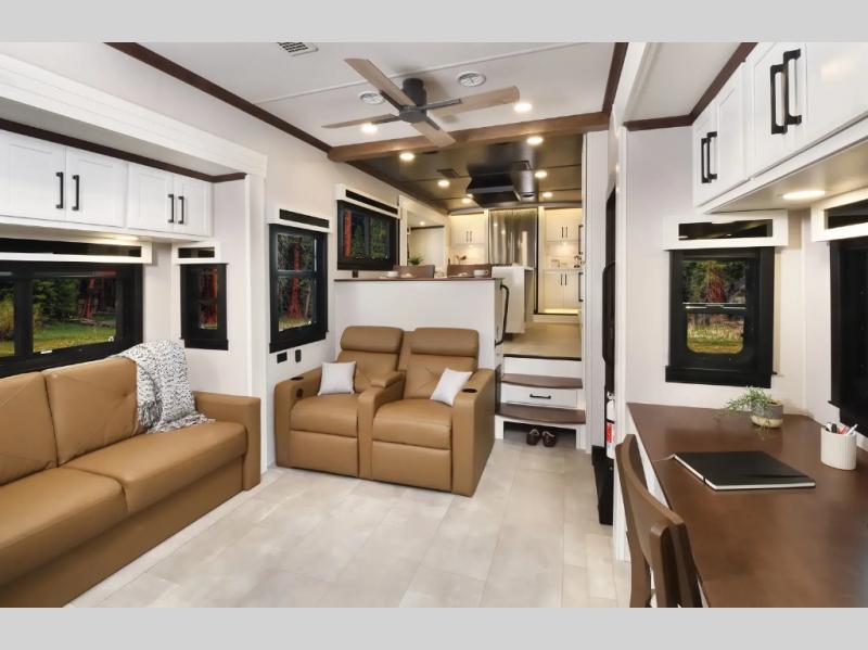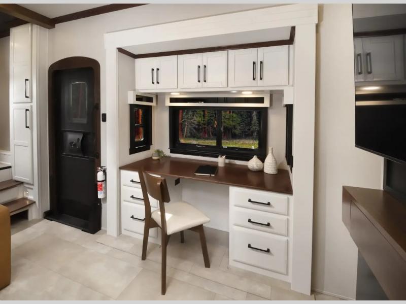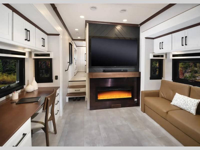 You will feel right at home in this fifth wheel! The rear private bedroom has a 72" x 80" king bed slide for a good night's rest, a rear large wardrobe with the washer and dryer next to it, and even a dresser with a 40" LED TV. Two can get ready at once in the full bathroom with the dual sink vanity then head to either the desk slide to get some work done or whip up some scrambled eggs on the three burner cooktop at the island in the front kitchen. The kitchen even has a dishwasher for easy clean up and two bar stools at the high top dinette that overlooks the middle living area. Relax each night in true comfort on either the E-Z Glide sofa bed slide or the theater seating across from the entertainment center which has a fireplace and 65" Samsung LED Smart TV to watch your favorite movies!