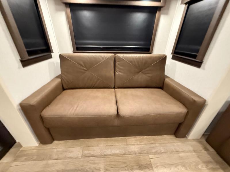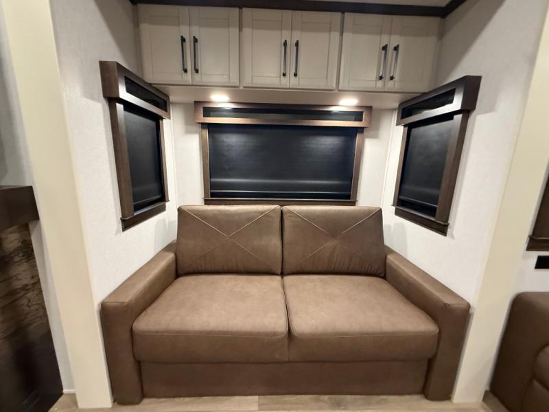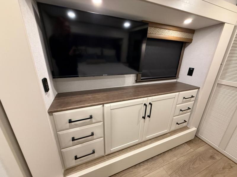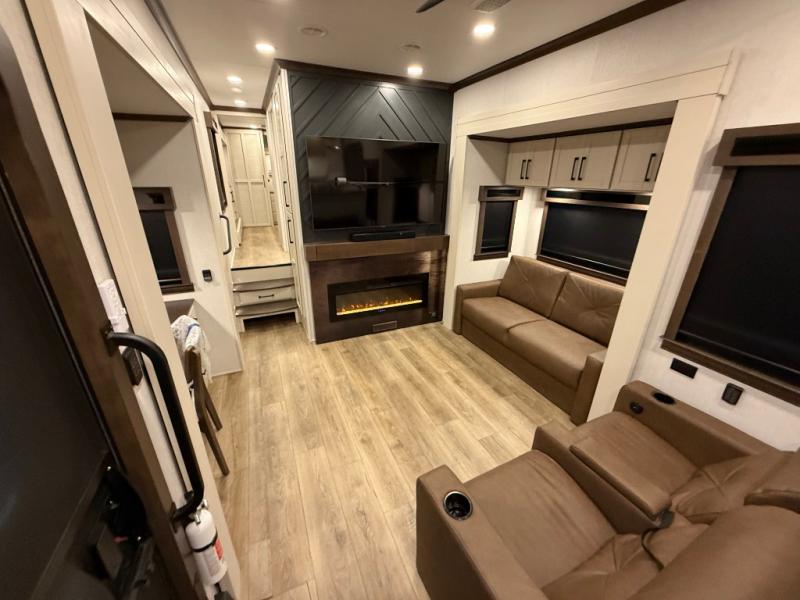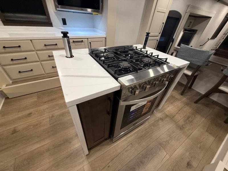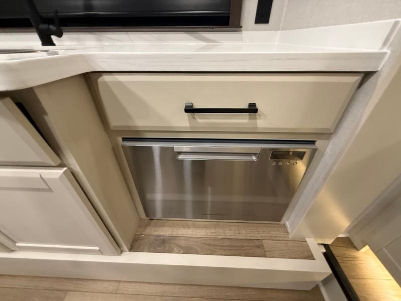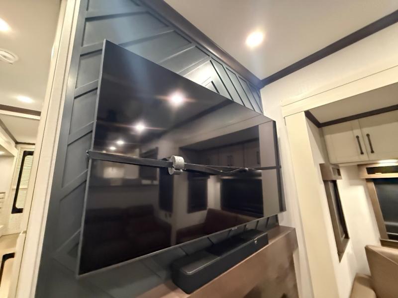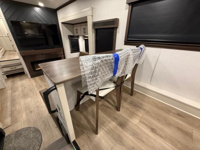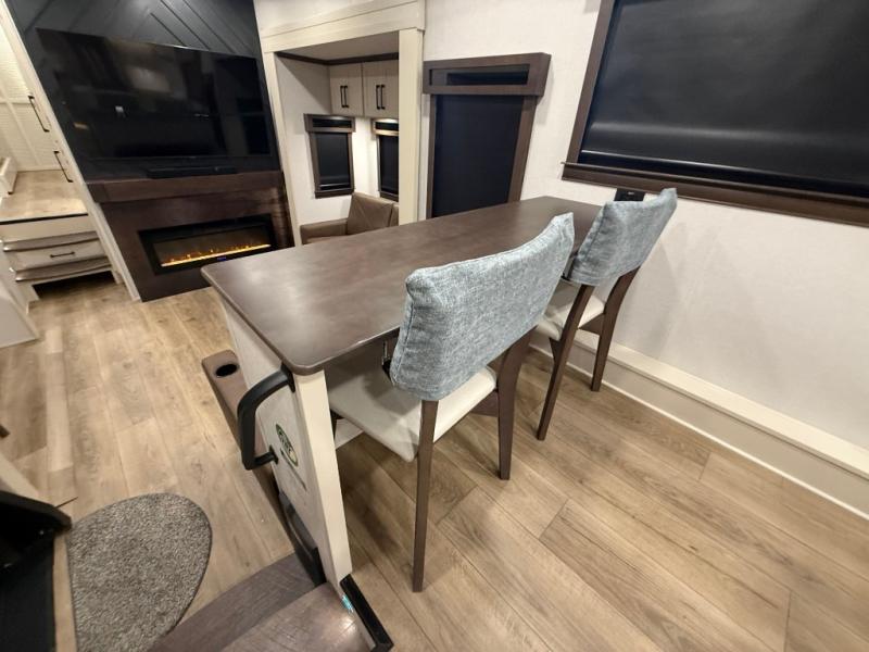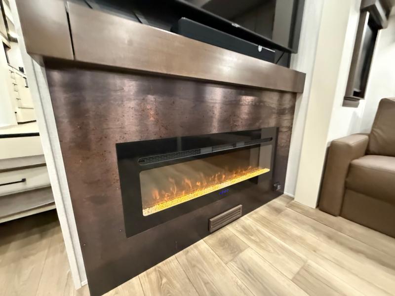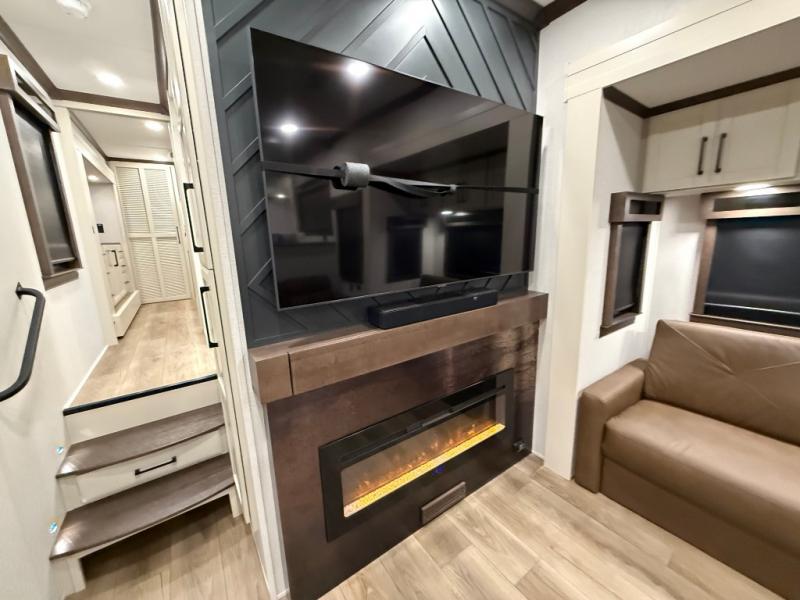 You will feel right at home in this fifth wheel! The rear private bedroom has a 72" x 80" king bed slide for a good night's rest, a rear large wardrobe with the washer and dryer next to it, and even a dresser with a 40" LED TV. And two can get ready at once in the full bathroom with the dual sink vanity. You can then head to either the desk slide to get some work done or whip up some scrambled eggs on the three burner cooktop at the island in the front kitchen. The kitchen even has a dishwasher for easy clean up and two bar stools at the high top dinette that overlooks the middle living area. Relax each night in true comfort on either the E-Z Glide sofa bed slide or the theater seating across from the entertainment center which has a fireplace and 65" Samsung LED Smart TV to watch your favorite movies!