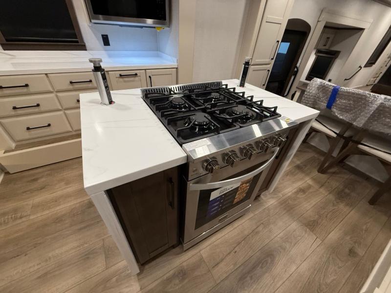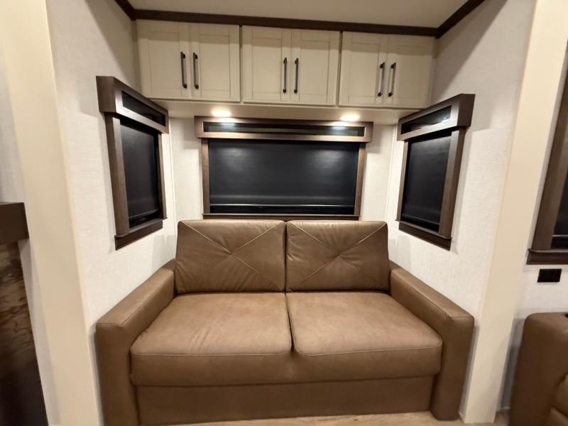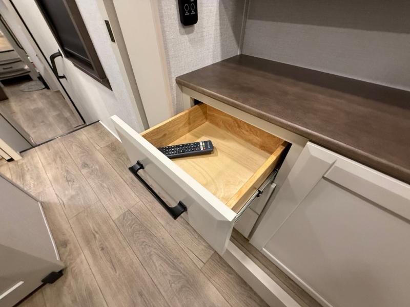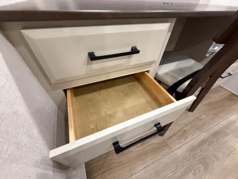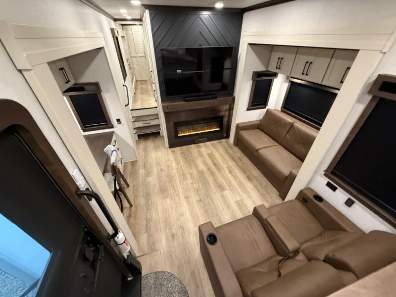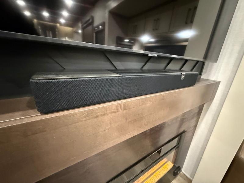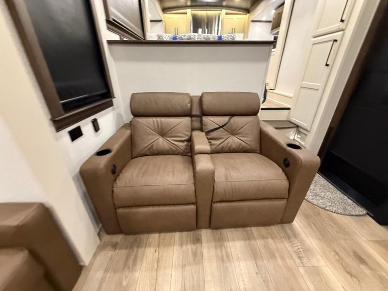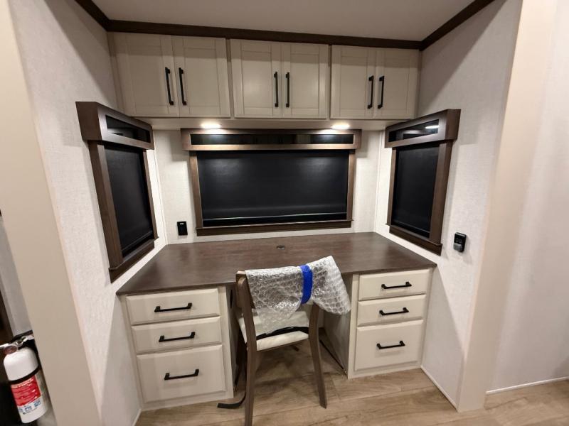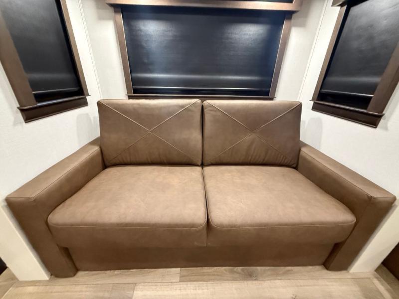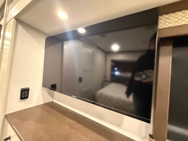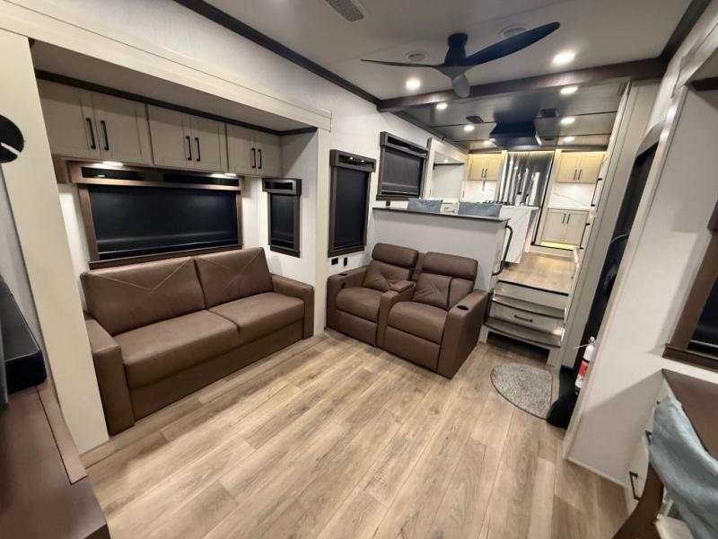 You will feel right at home in this fifth wheel! The rear private bedroom has a 72" x 80" king bed slide for a good night's rest, a rear large wardrobe with the washer and dryer next to it, and even a dresser with a 40" LED TV. And two can get ready at once in the full bathroom with the dual sink vanity. You can then head to either the desk slide to get some work done or whip up some scrambled eggs on the three burner cooktop at the island in the front kitchen. The kitchen even has a dishwasher for easy clean up and two bar stools at the high top dinette that overlooks the middle living area. Relax each night in true comfort on either the E-Z Glide sofa bed slide or the theater seating across from the entertainment center which has a fireplace and 65" Samsung LED Smart TV to watch your favorite movies!