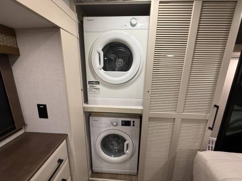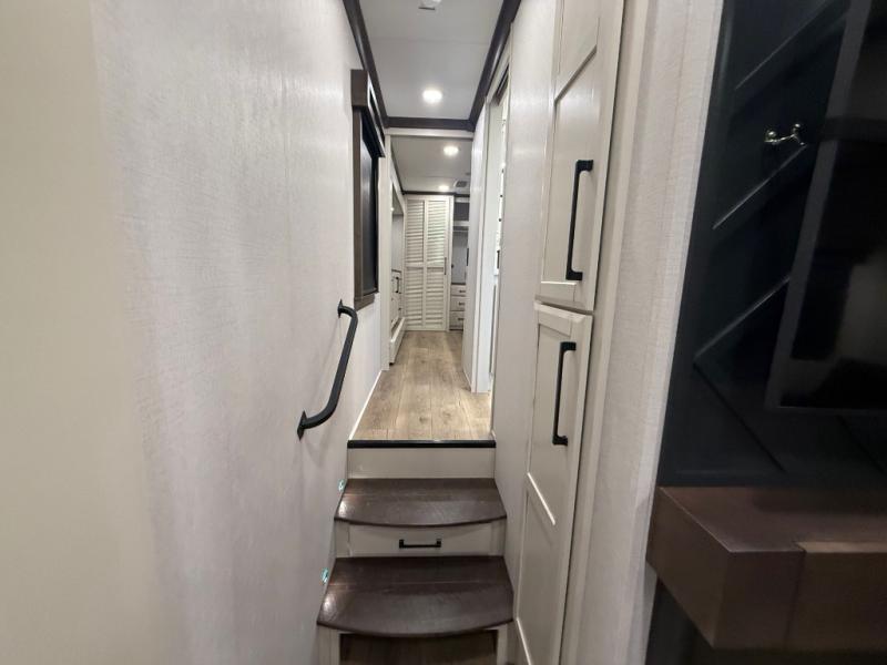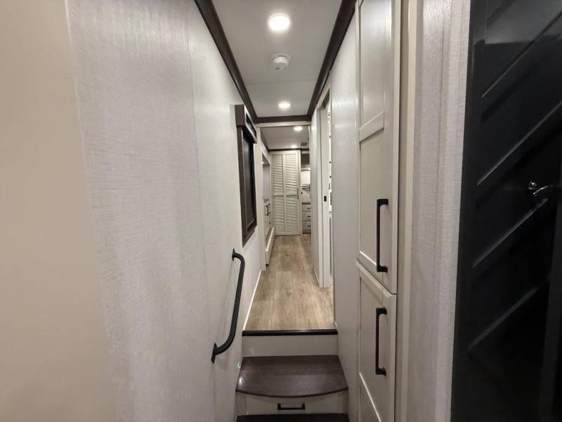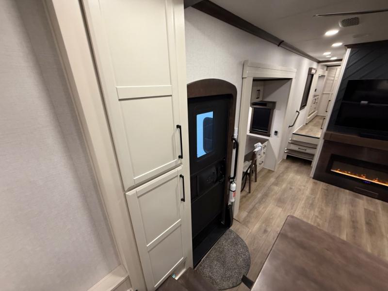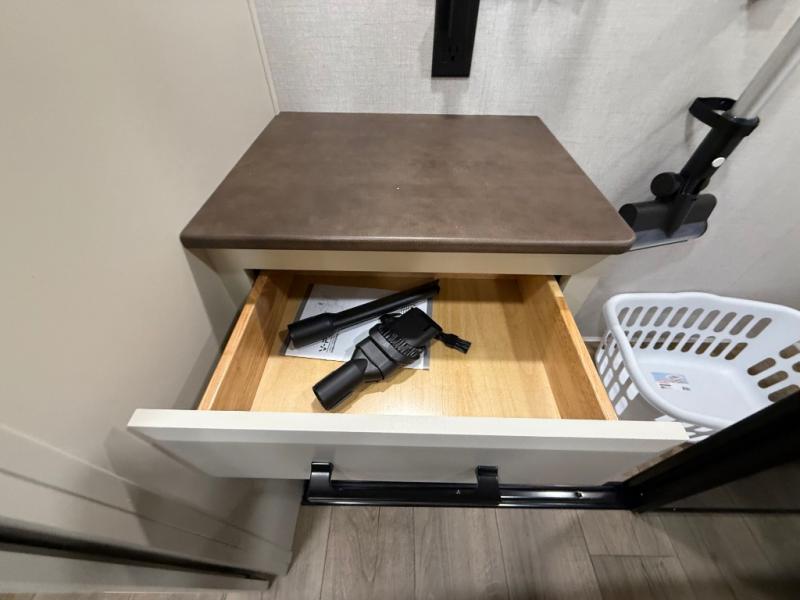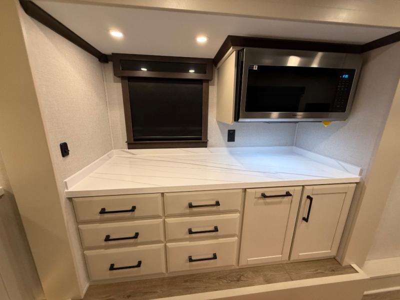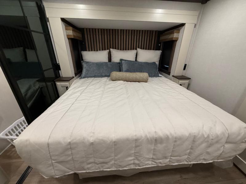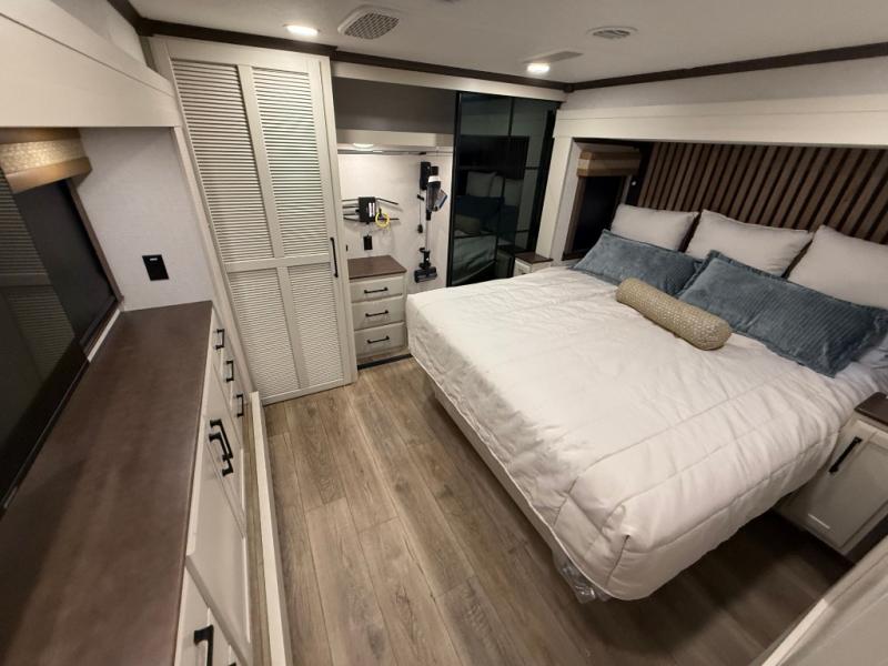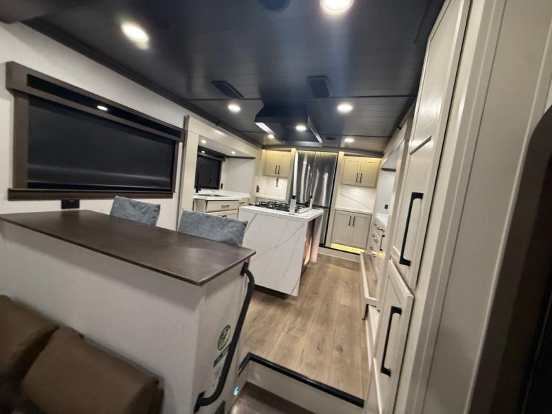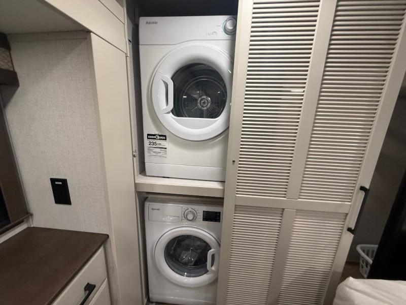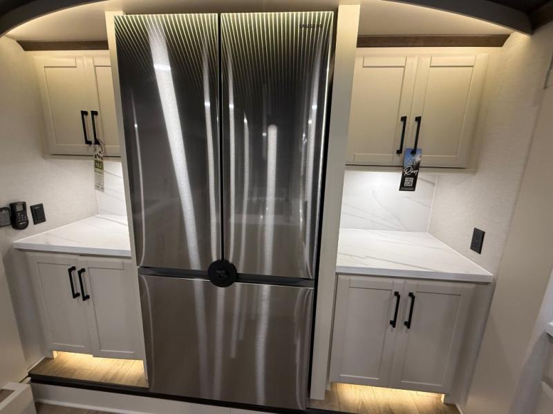 You will feel right at home in this fifth wheel! The rear private bedroom has a 72" x 80" king bed slide for a good night's rest, a rear large wardrobe with the washer and dryer next to it, and even a dresser with a 40" LED TV. And two can get ready at once in the full bathroom with the dual sink vanity. You can then head to either the desk slide to get some work done or whip up some scrambled eggs on the three burner cooktop at the island in the front kitchen. The kitchen even has a dishwasher for easy clean up and two bar stools at the high top dinette that overlooks the middle living area. Relax each night in true comfort on either the E-Z Glide sofa bed slide or the theater seating across from the entertainment center which has a fireplace and 65" Samsung LED Smart TV to watch your favorite movies!