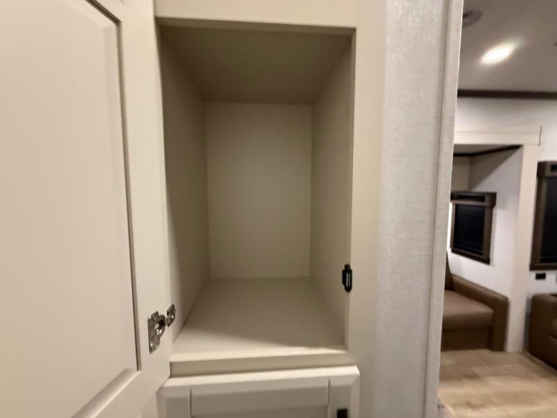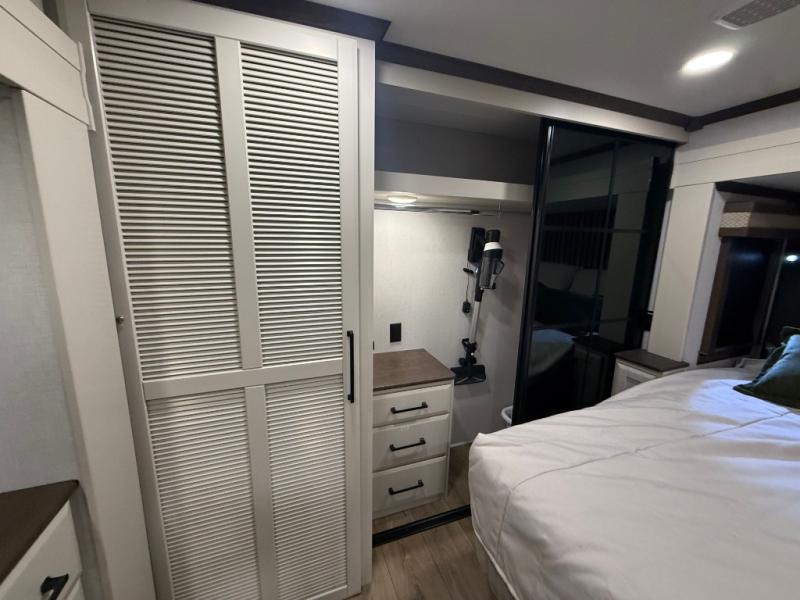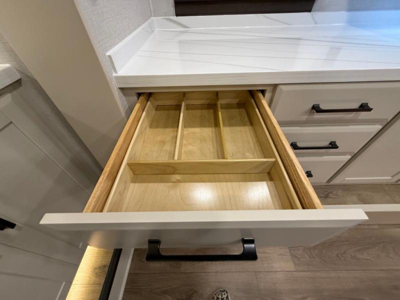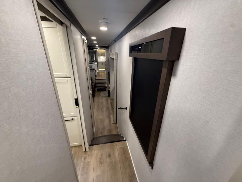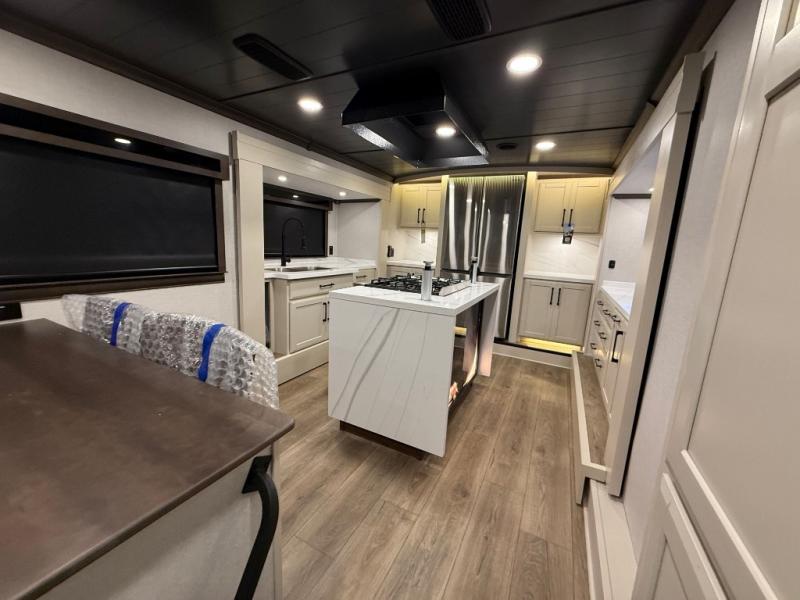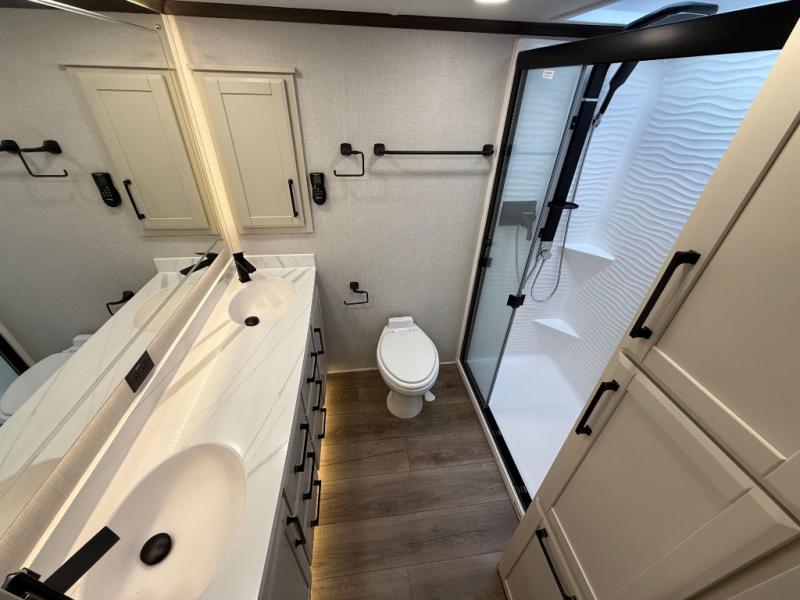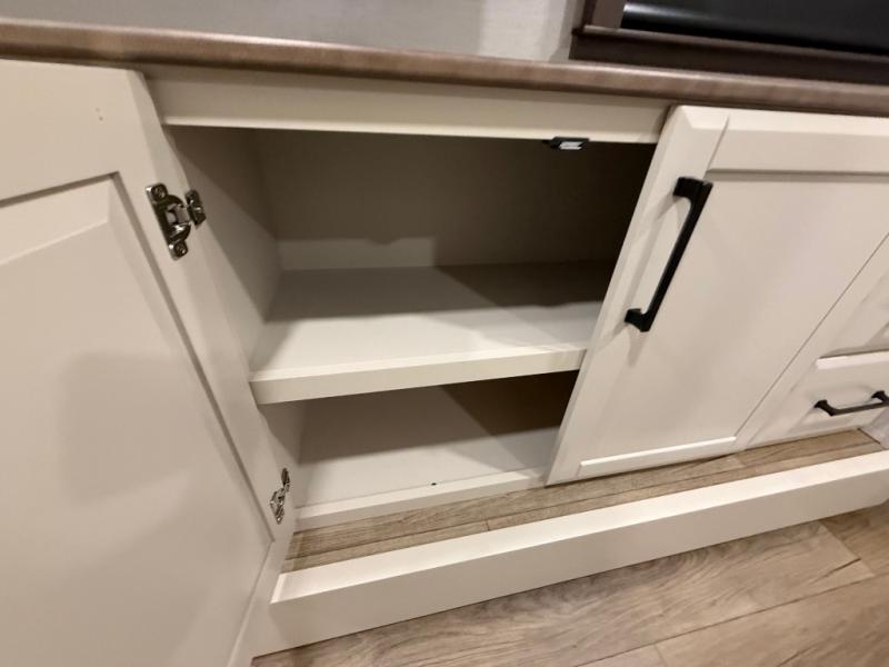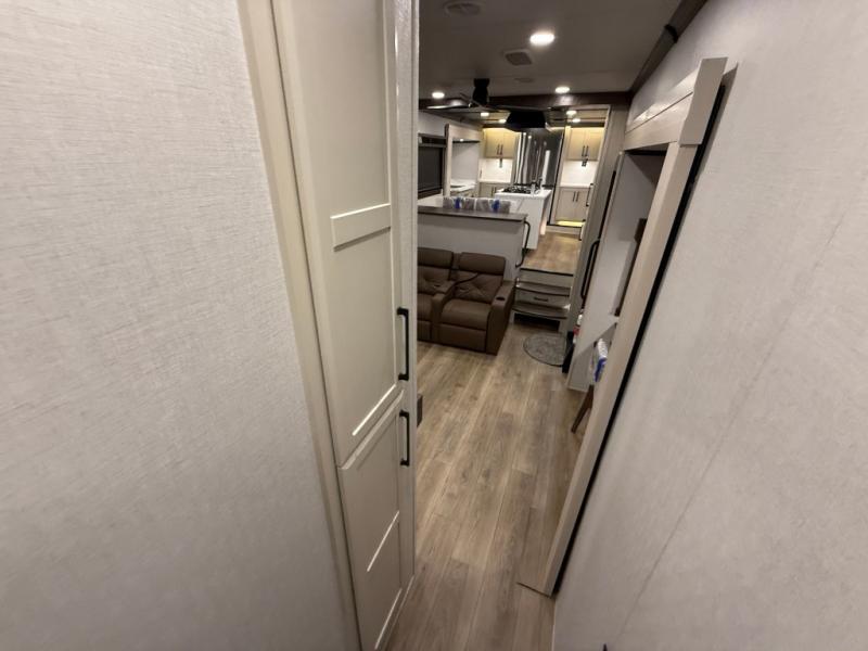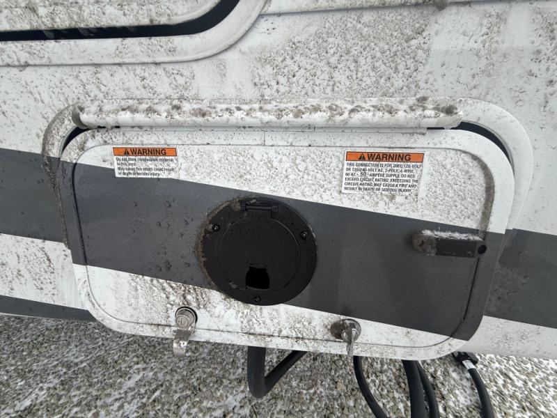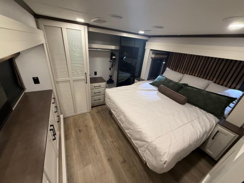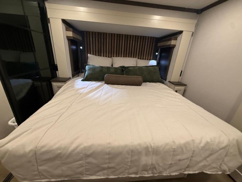 You will feel right at home in this fifth wheel! The rear private bedroom has a 72" x 80" king bed slide for a good night's rest, a rear large wardrobe with the washer and dryer next to it, and even a dresser with a 40" LED TV. And two can get ready at once in the full bathroom with the dual sink vanity. You can then head to either the desk slide to get some work done or whip up some scrambled eggs on the three burner cooktop at the island in the front kitchen. The kitchen even has a dishwasher for easy clean up and two bar stools at the high top dinette that overlooks the middle living area. Relax each night in true comfort on either the E-Z Glide sofa bed slide or the theater seating across from the entertainment center which has a fireplace and 65" Samsung LED Smart TV to watch your favorite movies!