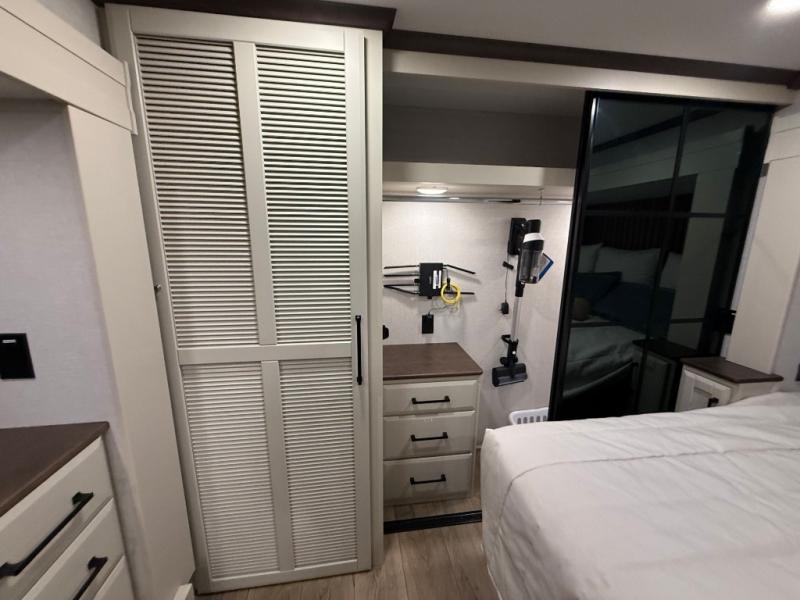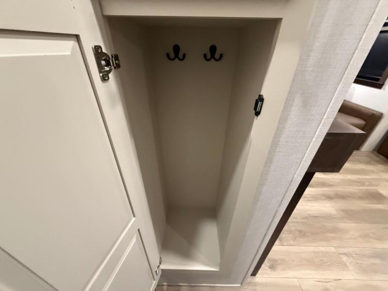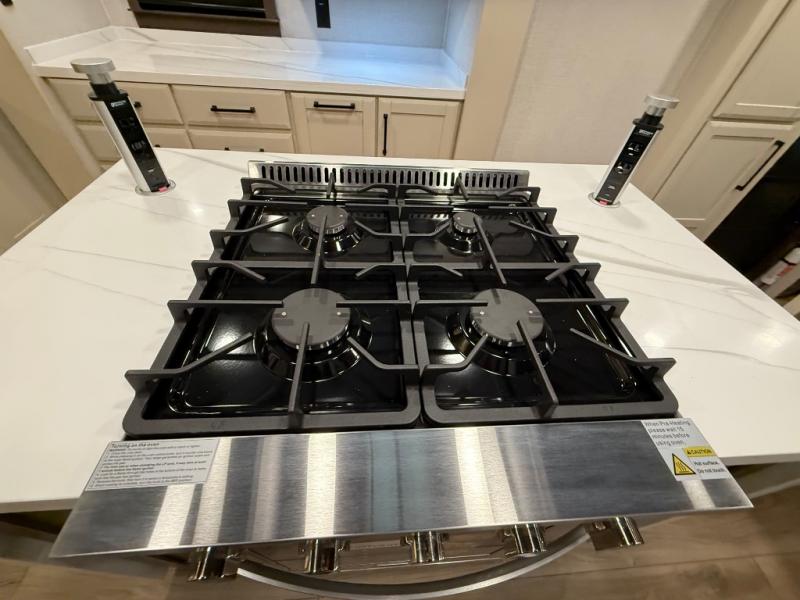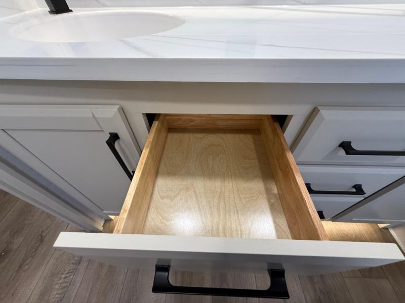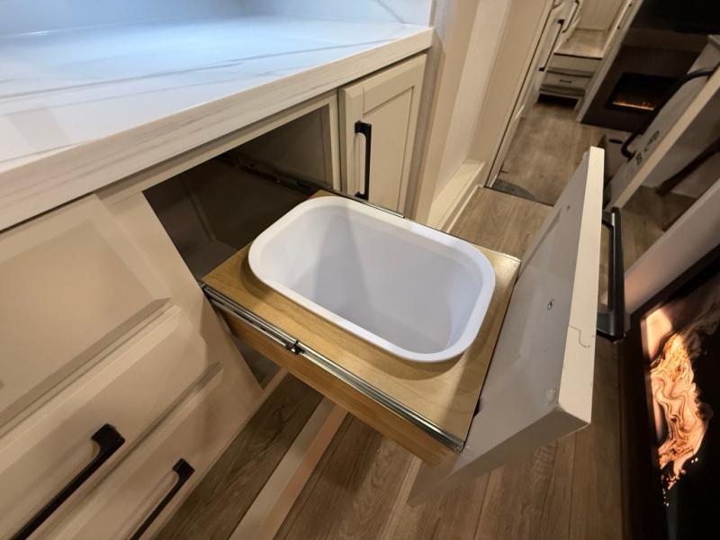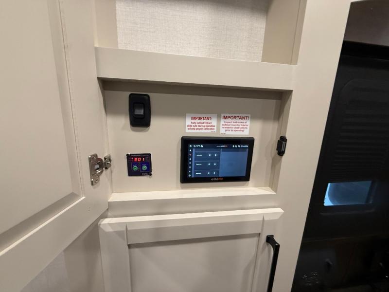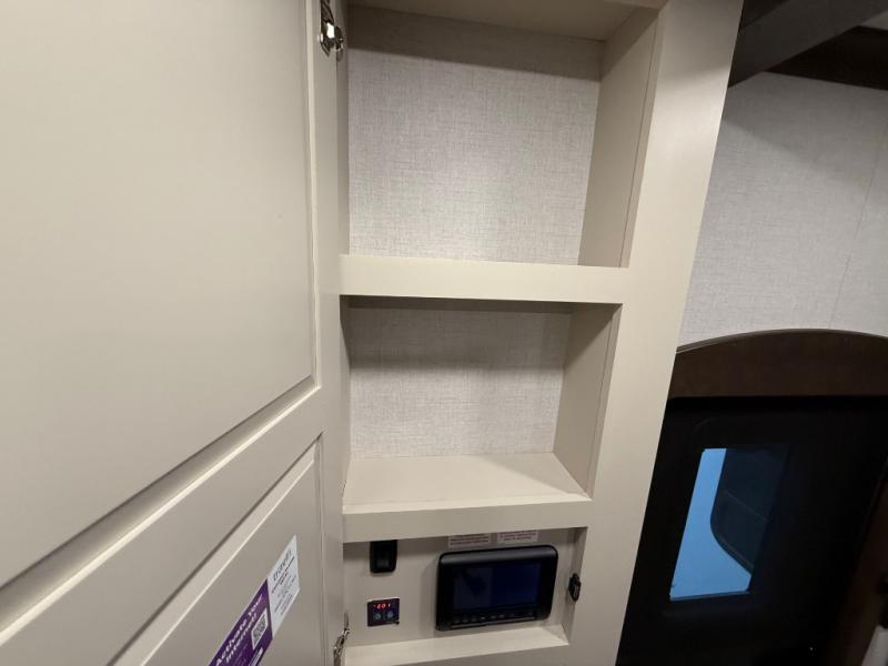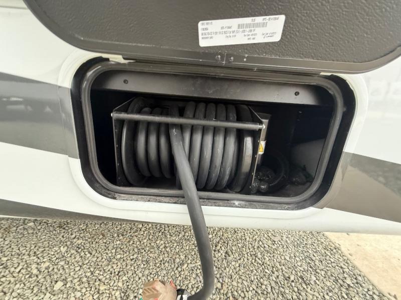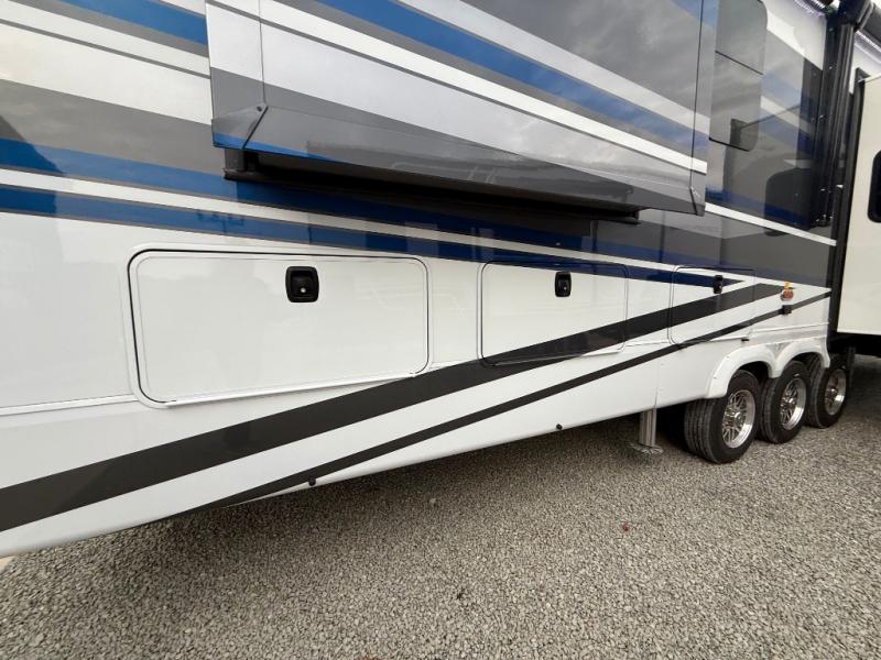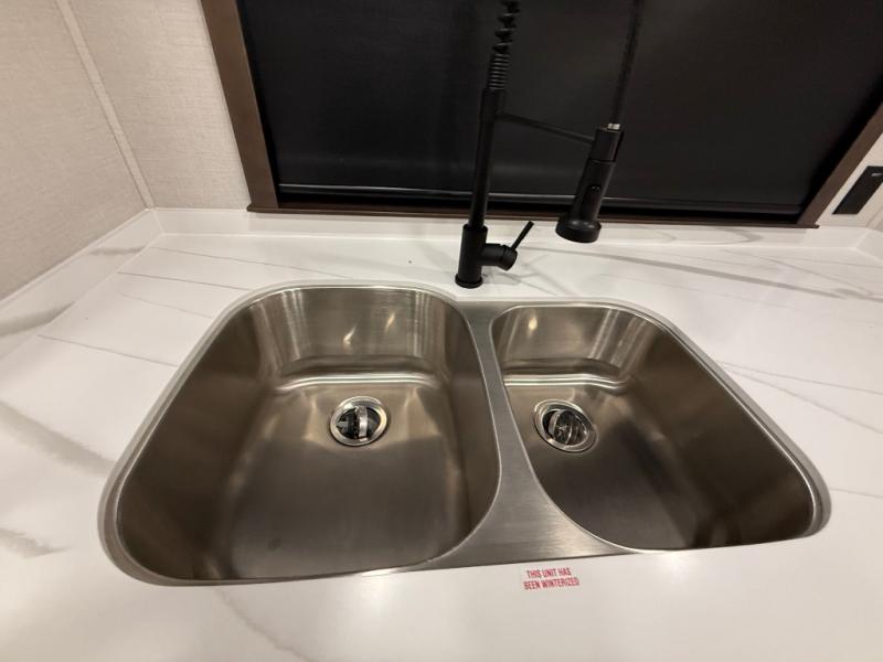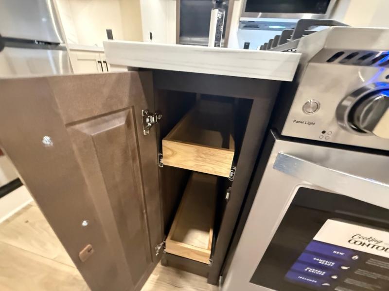 You will feel right at home in this fifth wheel! The rear private bedroom has a 72" x 80" king bed slide for a good night's rest, a rear large wardrobe with the washer and dryer next to it, and even a dresser with a 40" LED TV. And two can get ready at once in the full bathroom with the dual sink vanity. You can then head to either the desk slide to get some work done or whip up some scrambled eggs on the three burner cooktop at the island in the front kitchen. The kitchen even has a dishwasher for easy clean up and two bar stools at the high top dinette that overlooks the middle living area. Relax each night in true comfort on either the E-Z Glide sofa bed slide or the theater seating across from the entertainment center which has a fireplace and 65" Samsung LED Smart TV to watch your favorite movies!