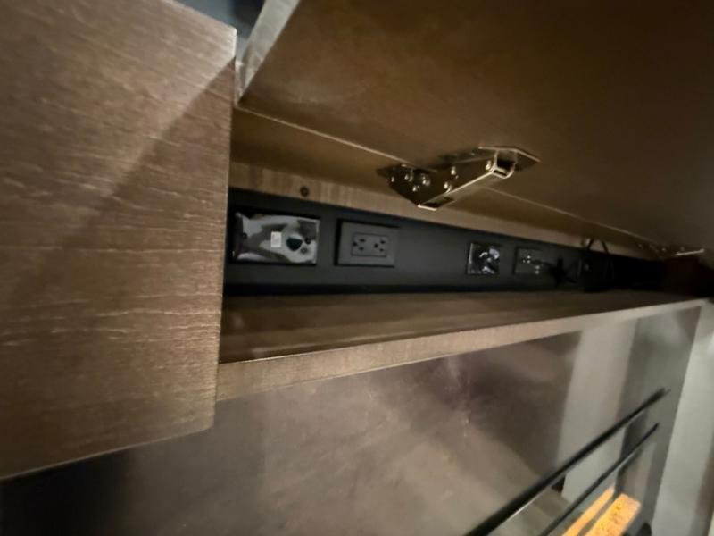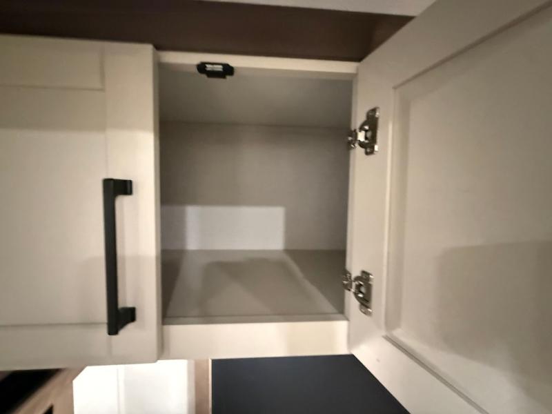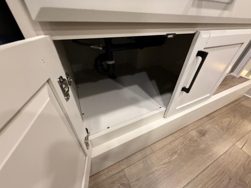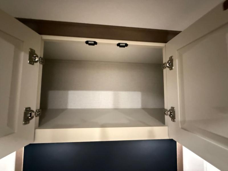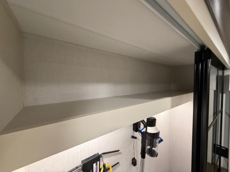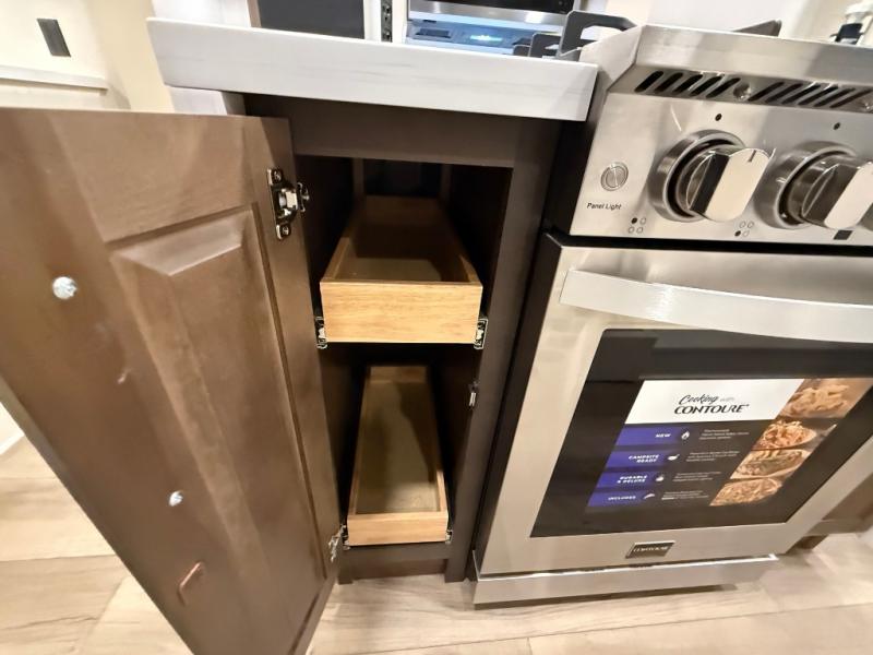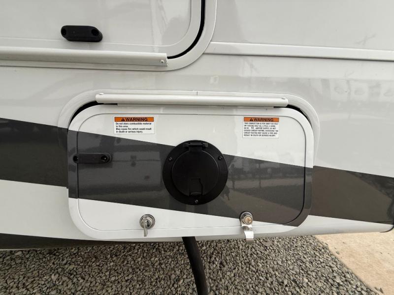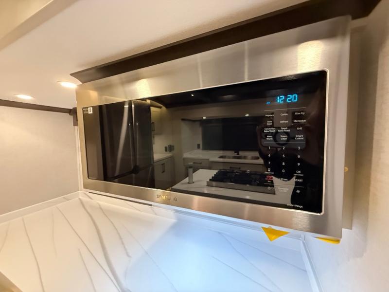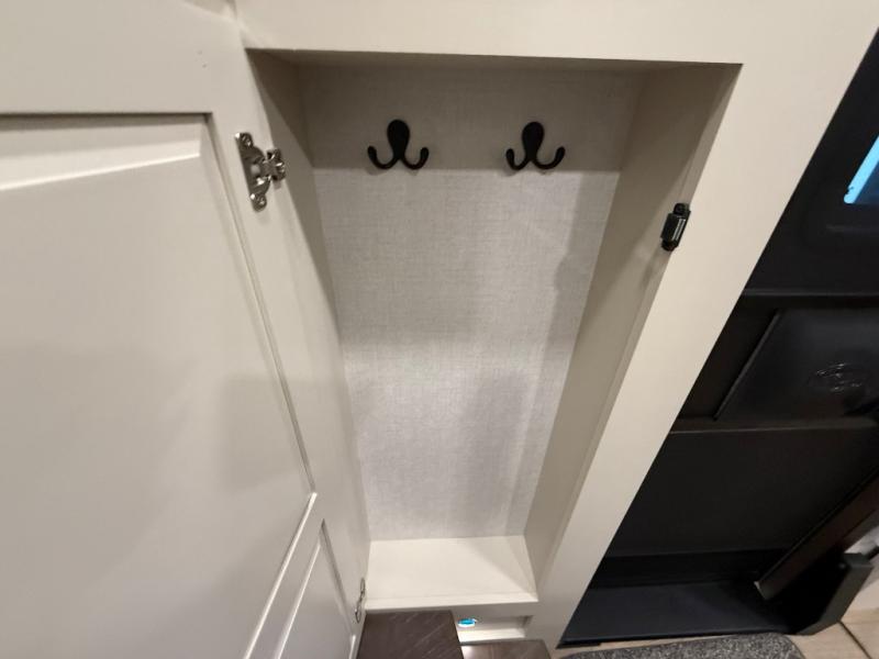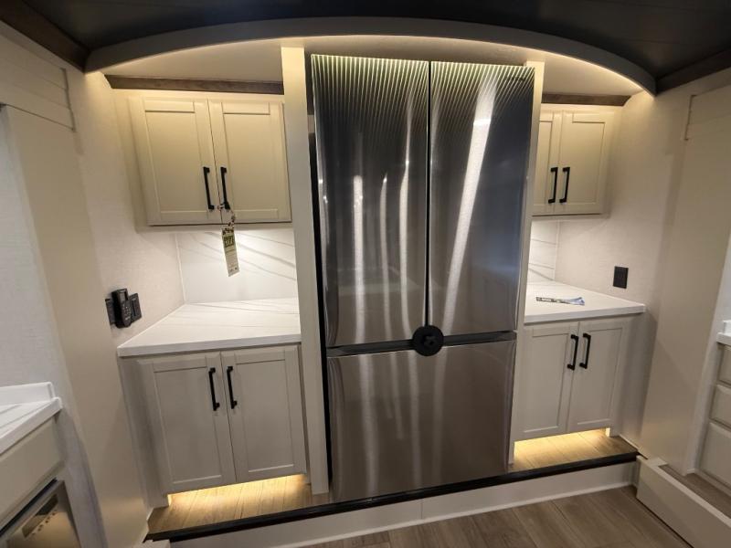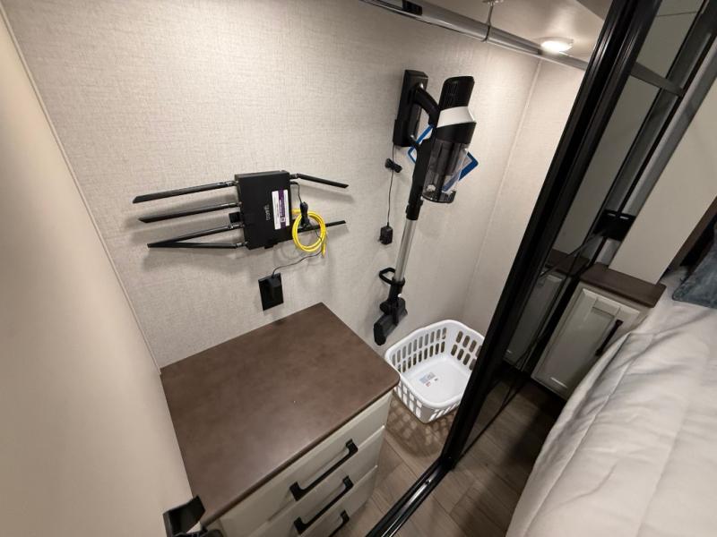 You will feel right at home in this fifth wheel! The rear private bedroom has a 72" x 80" king bed slide for a good night's rest, a rear large wardrobe with the washer and dryer next to it, and even a dresser with a 40" LED TV. And two can get ready at once in the full bathroom with the dual sink vanity. You can then head to either the desk slide to get some work done or whip up some scrambled eggs on the three burner cooktop at the island in the front kitchen. The kitchen even has a dishwasher for easy clean up and two bar stools at the high top dinette that overlooks the middle living area. Relax each night in true comfort on either the E-Z Glide sofa bed slide or the theater seating across from the entertainment center which has a fireplace and 65" Samsung LED Smart TV to watch your favorite movies!