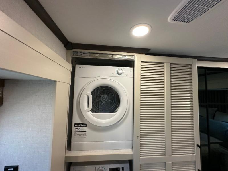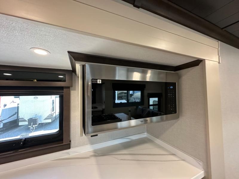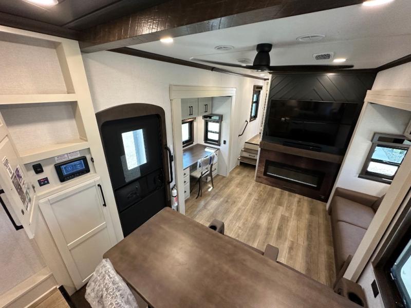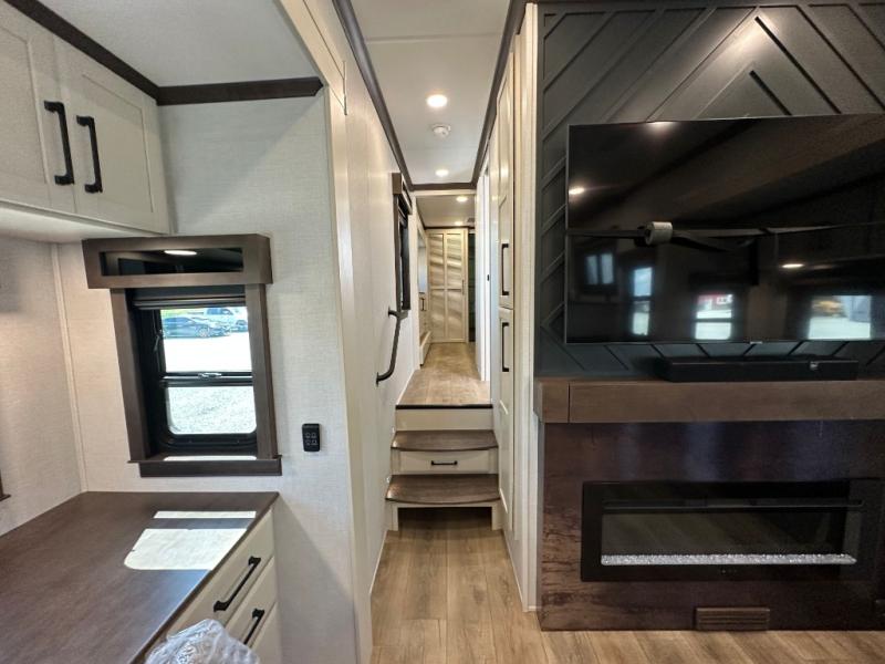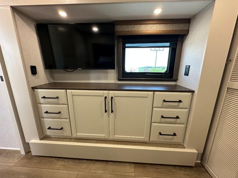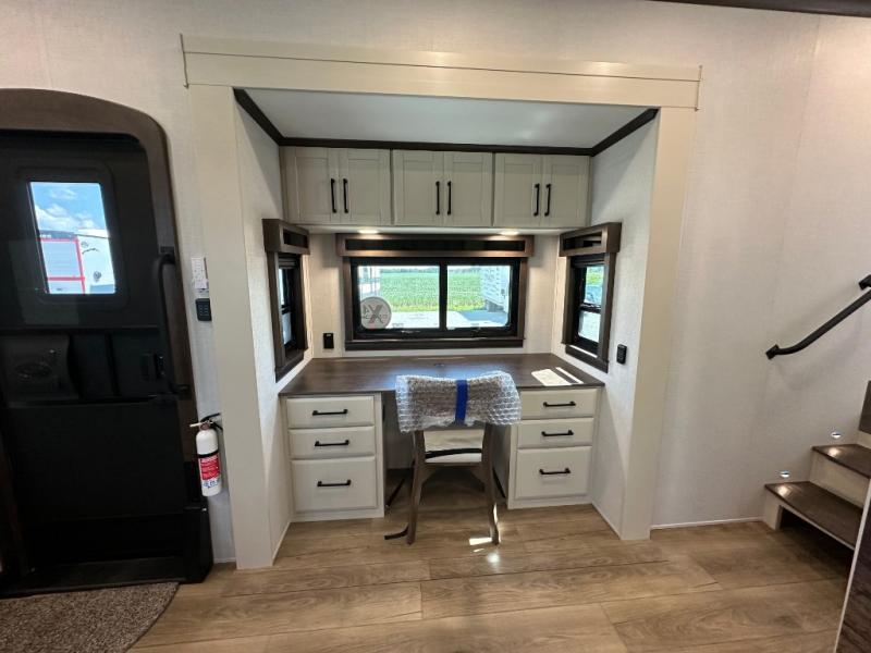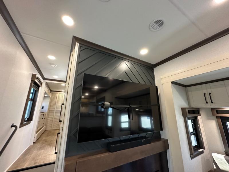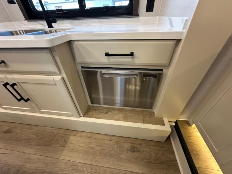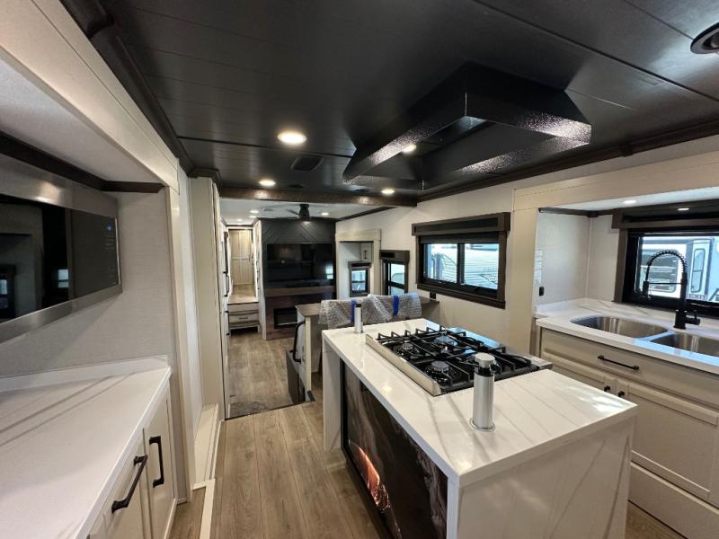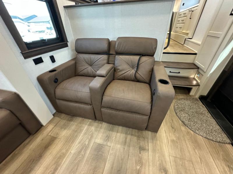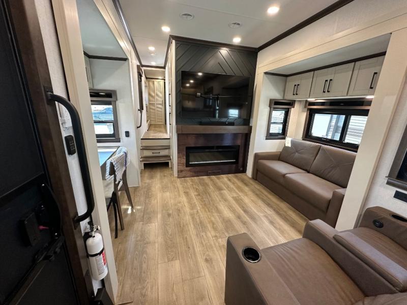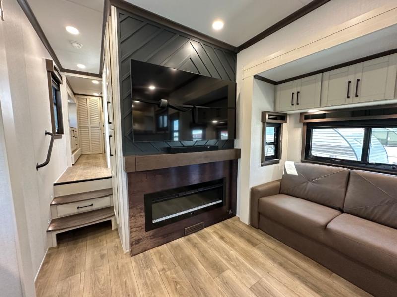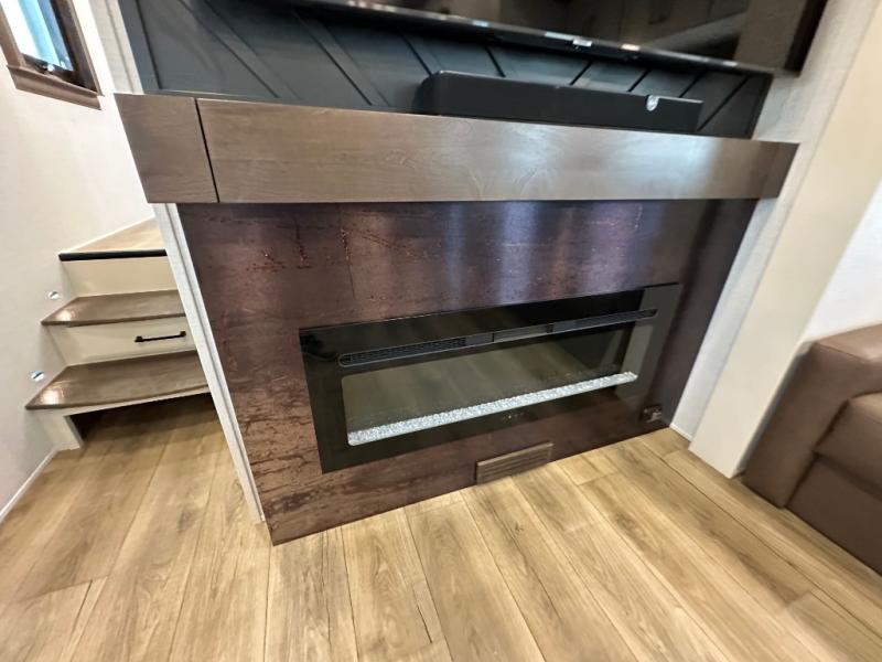 You will feel right at home in this fifth wheel! The rear private bedroom has a 72" x 80" king bed slide for a good night's rest, a rear large wardrobe with the washer and dryer next to it, and even a dresser with a 40" LED TV. And two can get ready at once in the full bathroom with the dual sink vanity. You can then head to either the desk slide to get some work done or whip up some scrambled eggs on the three burner cooktop at the island in the front kitchen. The kitchen even has a dishwasher for easy clean up and two bar stools at the high top dinette that overlooks the middle living area. Relax each night in true comfort on either the E-Z Glide sofa bed slide or the theater seating across from the entertainment center which has a fireplace and 65" Samsung LED Smart TV to watch your favorite movies!