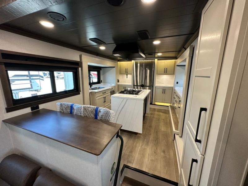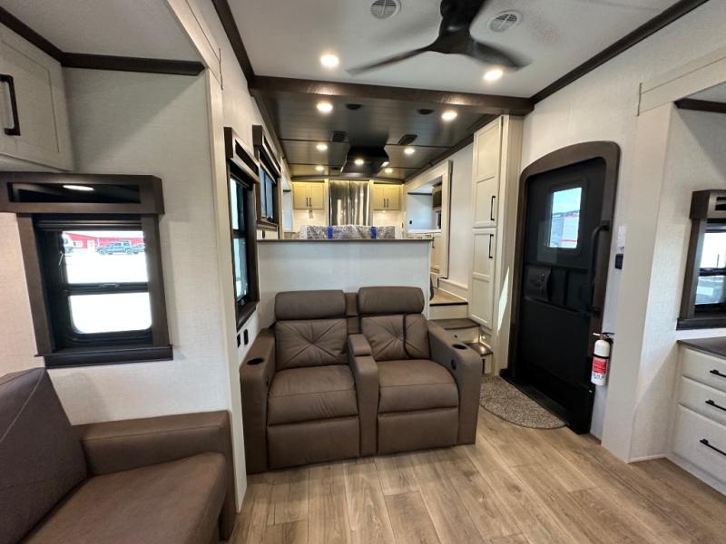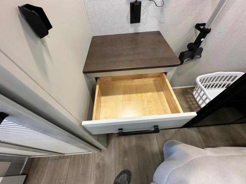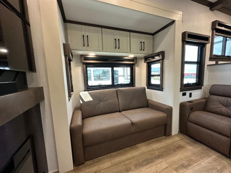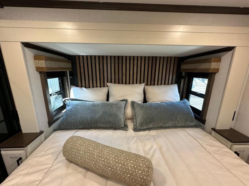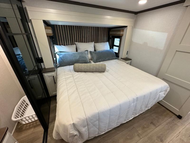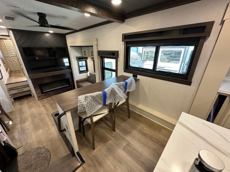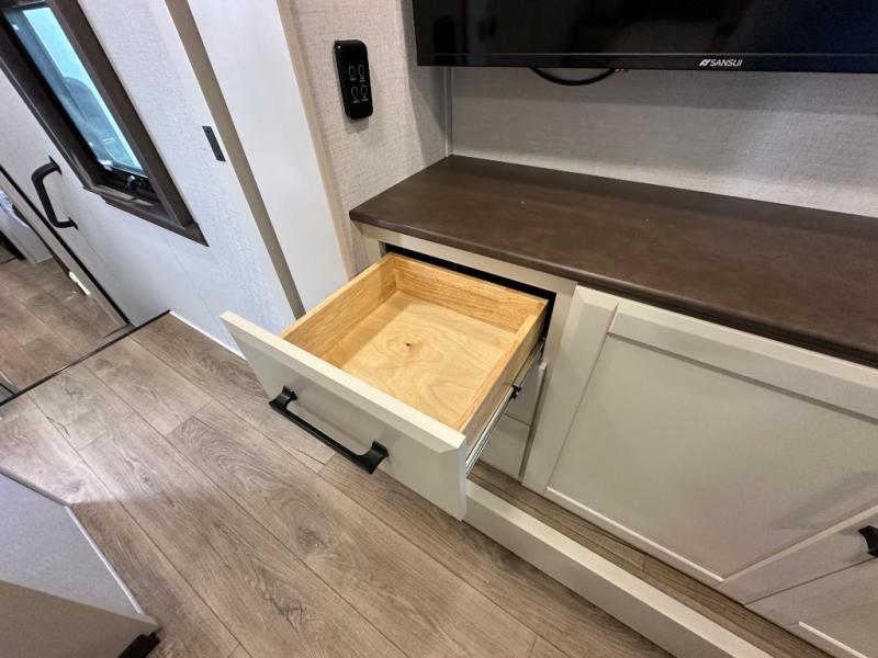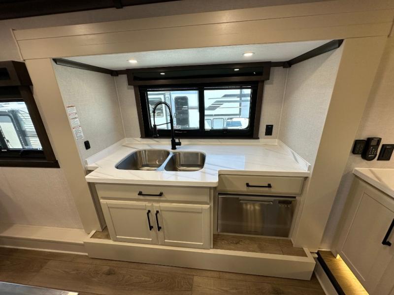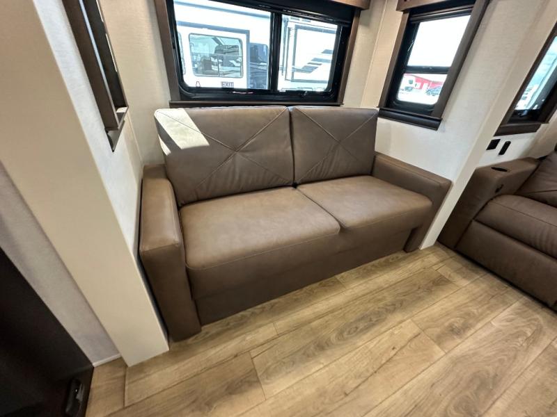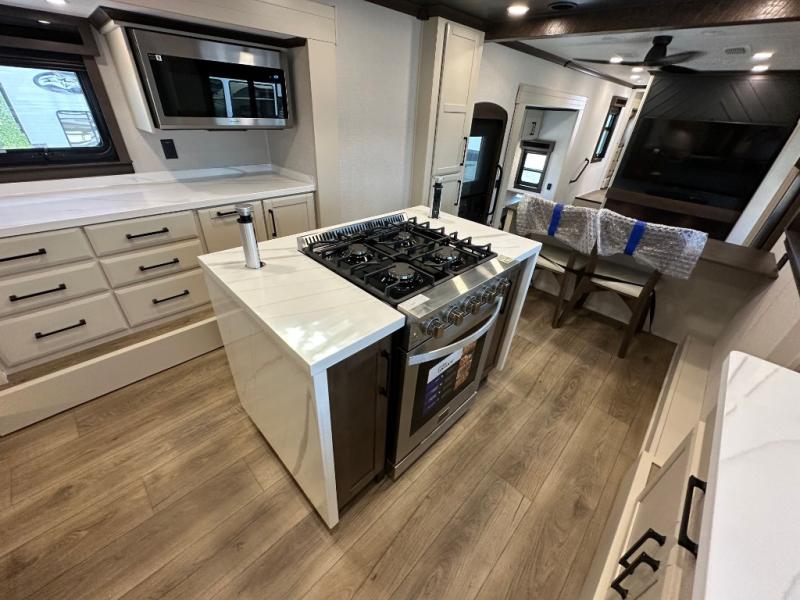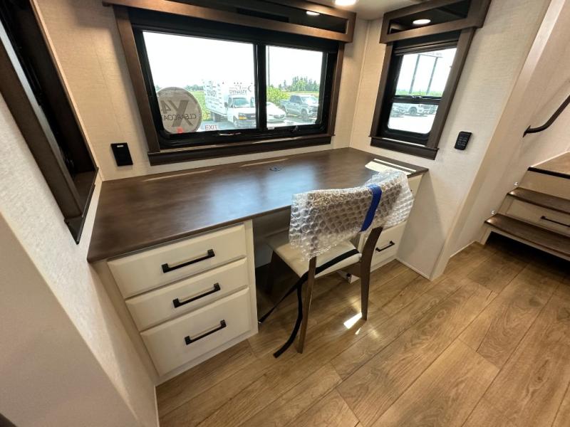 You will feel right at home in this fifth wheel! The rear private bedroom has a 72" x 80" king bed slide for a good night's rest, a rear large wardrobe with the washer and dryer next to it, and even a dresser with a 40" LED TV. And two can get ready at once in the full bathroom with the dual sink vanity. You can then head to either the desk slide to get some work done or whip up some scrambled eggs on the three burner cooktop at the island in the front kitchen. The kitchen even has a dishwasher for easy clean up and two bar stools at the high top dinette that overlooks the middle living area. Relax each night in true comfort on either the E-Z Glide sofa bed slide or the theater seating across from the entertainment center which has a fireplace and 65" Samsung LED Smart TV to watch your favorite movies!