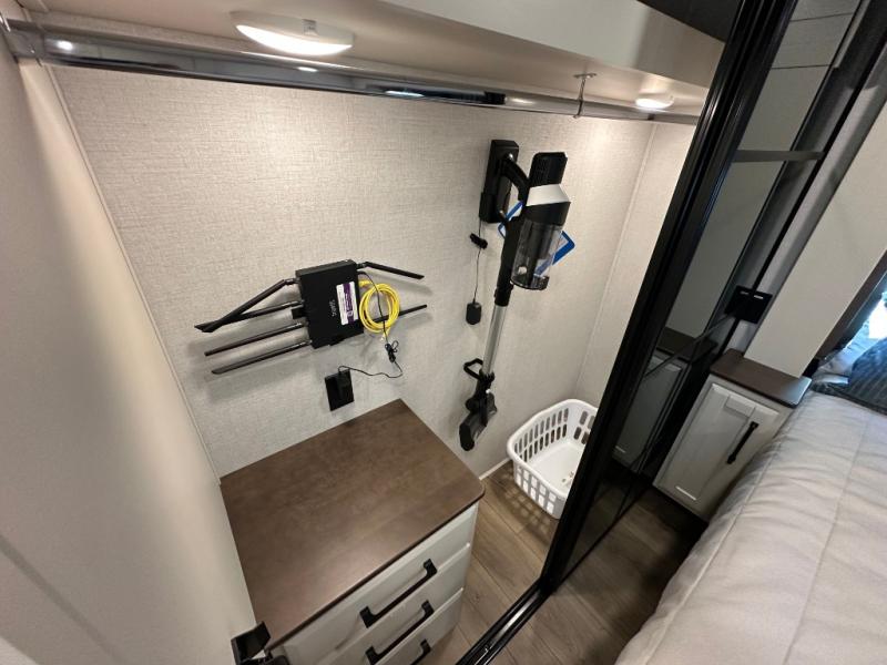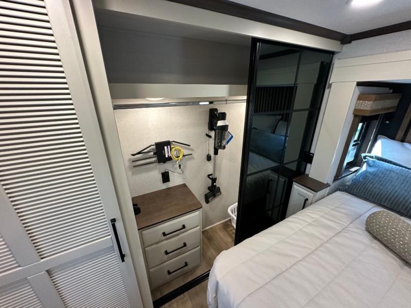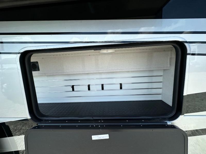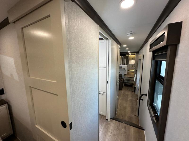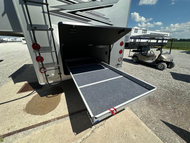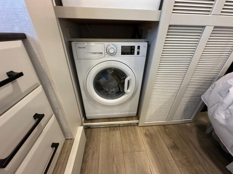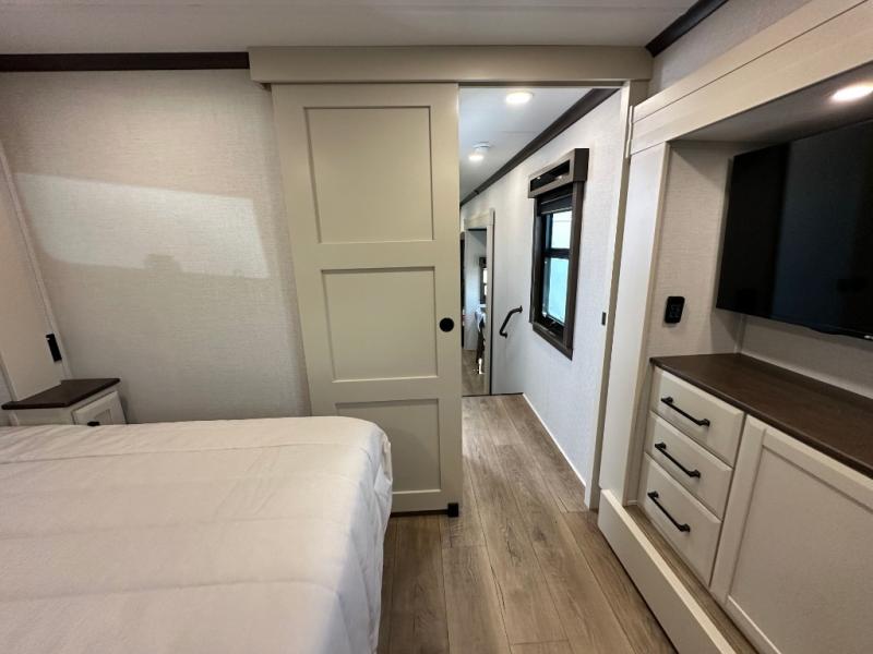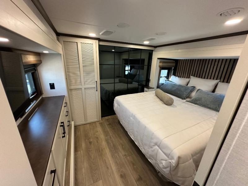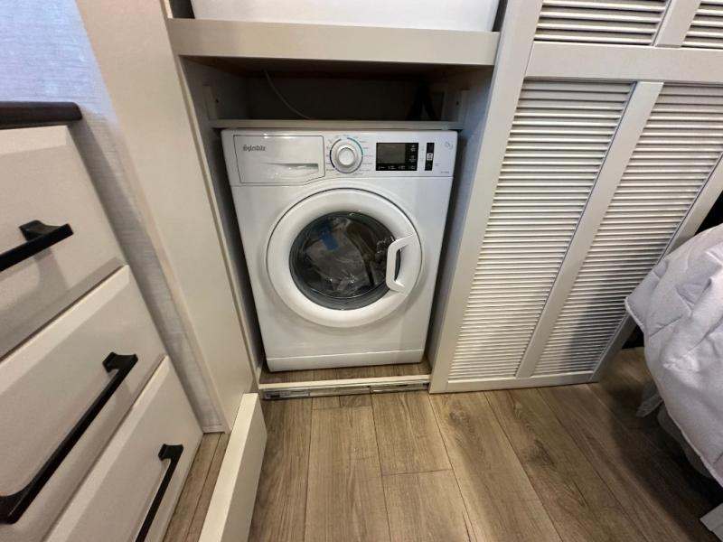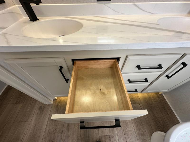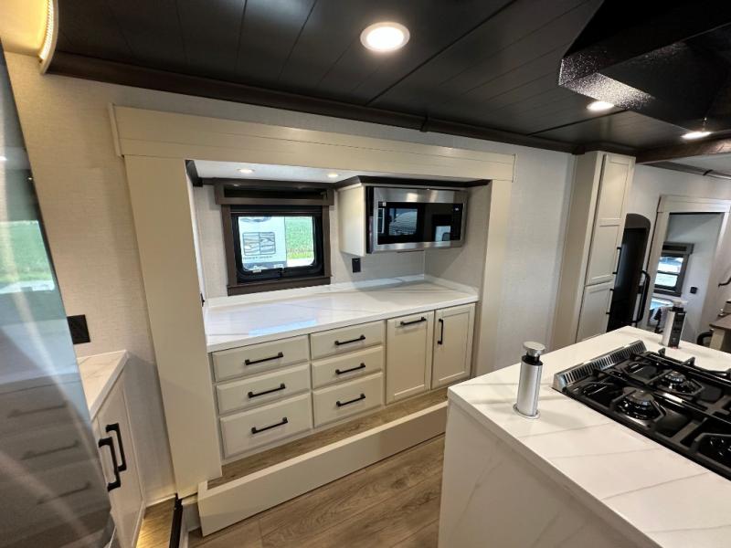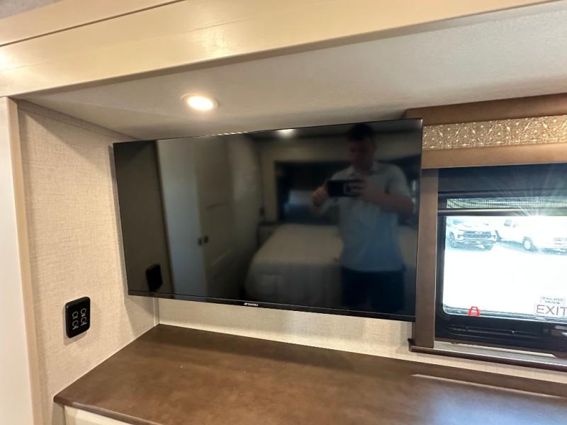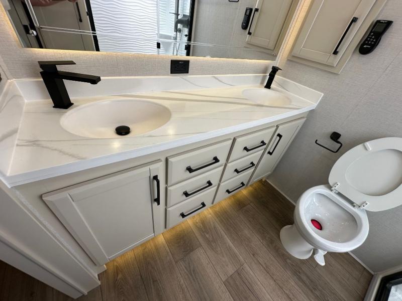 You will feel right at home in this fifth wheel! The rear private bedroom has a 72" x 80" king bed slide for a good night's rest, a rear large wardrobe with the washer and dryer next to it, and even a dresser with a 40" LED TV. And two can get ready at once in the full bathroom with the dual sink vanity. You can then head to either the desk slide to get some work done or whip up some scrambled eggs on the three burner cooktop at the island in the front kitchen. The kitchen even has a dishwasher for easy clean up and two bar stools at the high top dinette that overlooks the middle living area. Relax each night in true comfort on either the E-Z Glide sofa bed slide or the theater seating across from the entertainment center which has a fireplace and 65" Samsung LED Smart TV to watch your favorite movies!