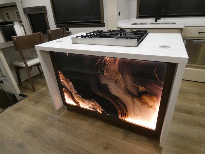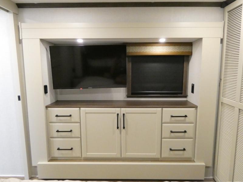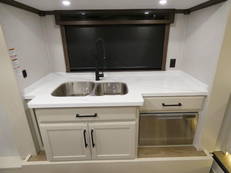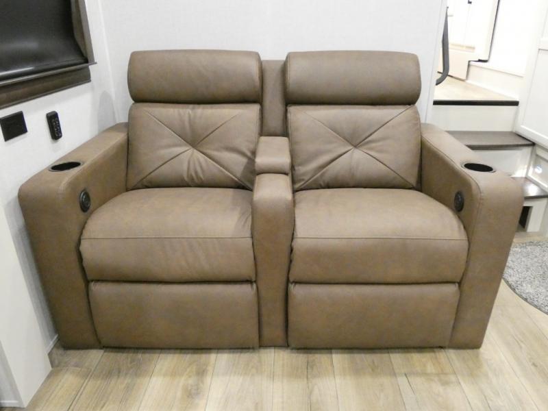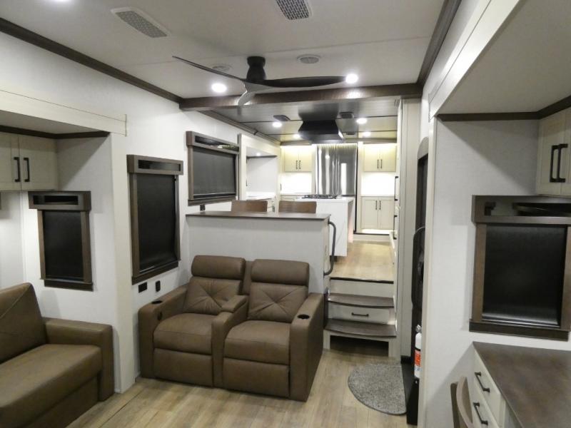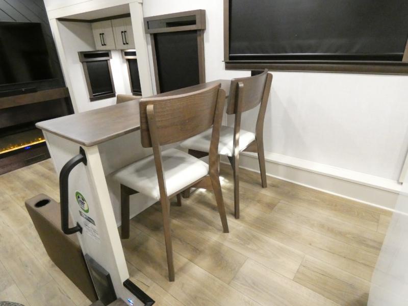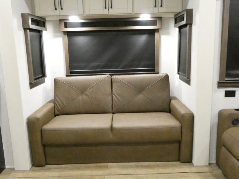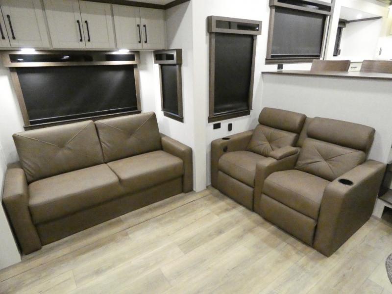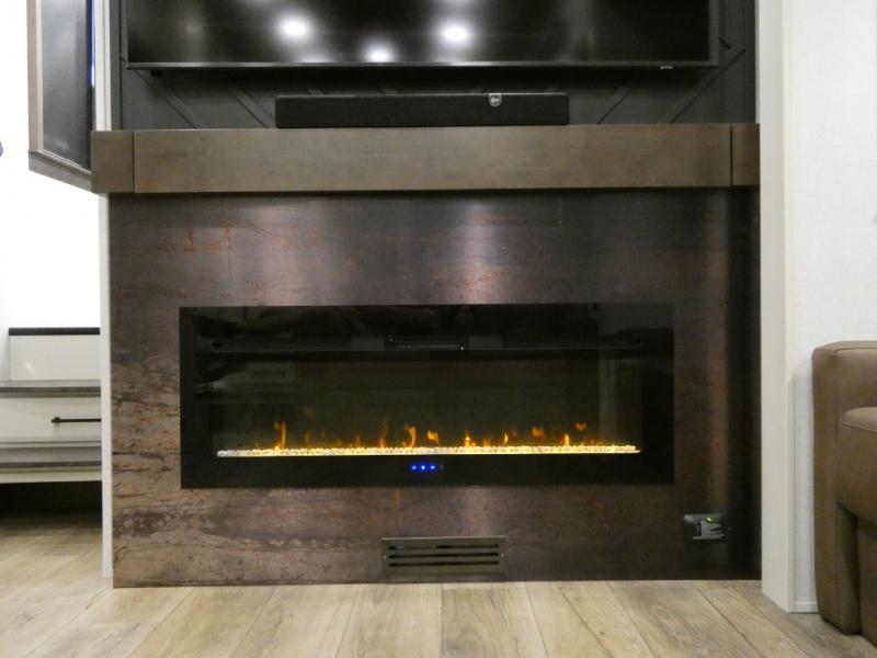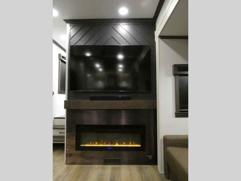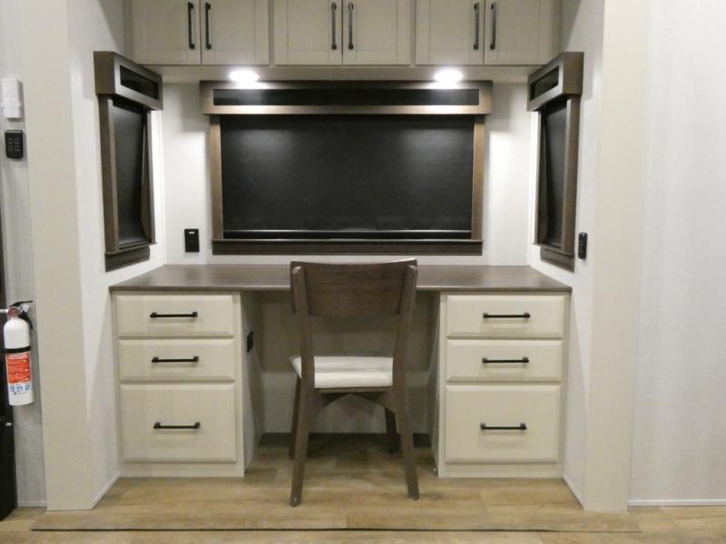 You will feel right at home in this fifth wheel! The rear private bedroom has a 72" x 80" king bed slide for a good night's rest, a rear large wardrobe with the washer and dryer next to it, and even a dresser with a 40" LED TV. And two can get ready at once in the full bathroom with the dual sink vanity. You can then head to either the desk slide to get some work done or whip up some scrambled eggs on the three burner cooktop at the island in the front kitchen. The kitchen even has a dishwasher for easy clean up and two bar stools at the high top dinette that overlooks the middle living area. Relax each night in true comfort on either the E-Z Glide sofa bed slide or the theater seating across from the entertainment center which has a fireplace and 65" Samsung LED Smart TV to watch your favorite movies!