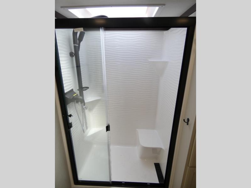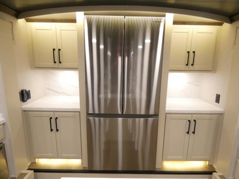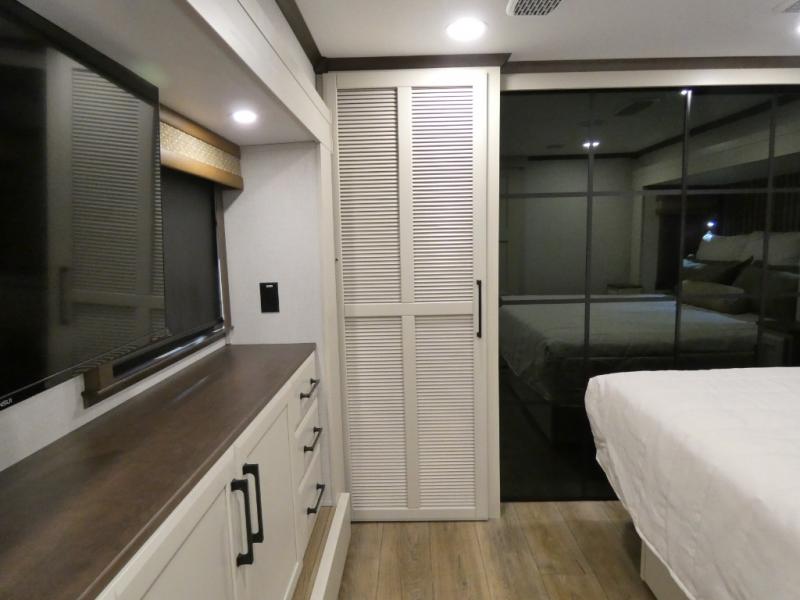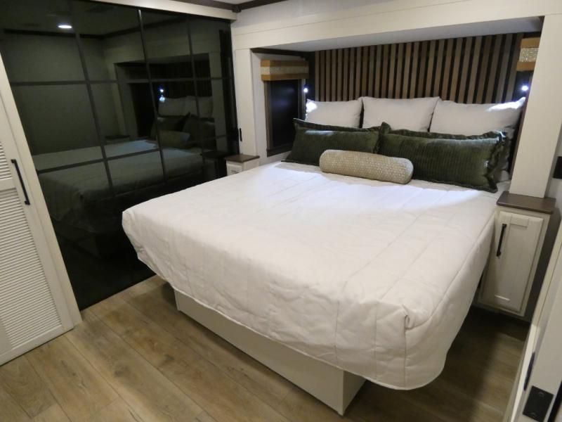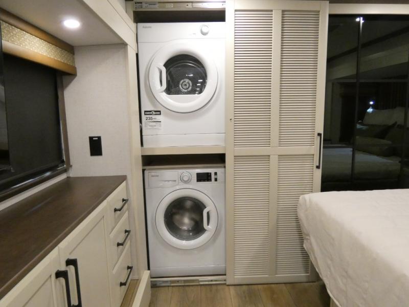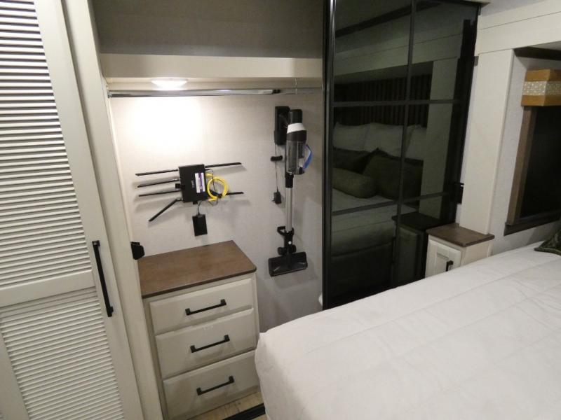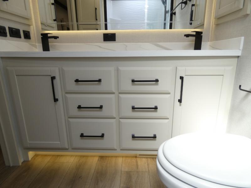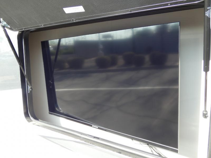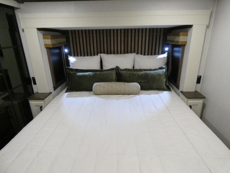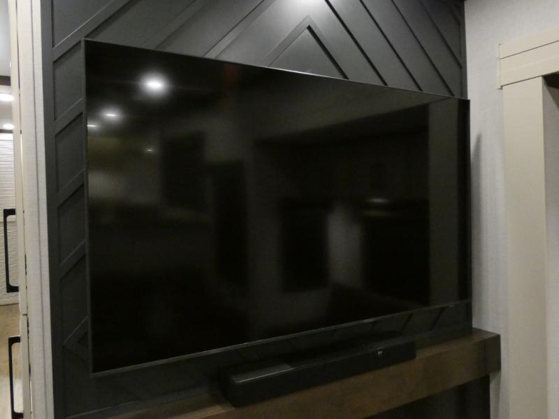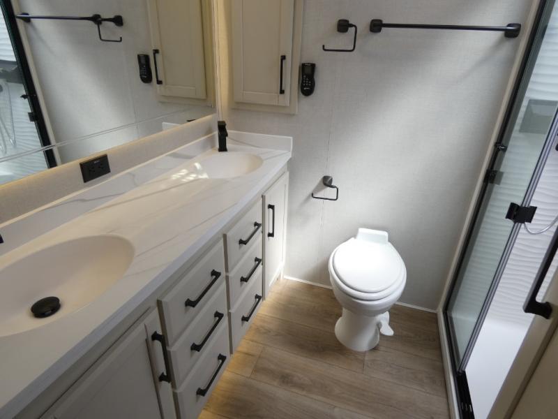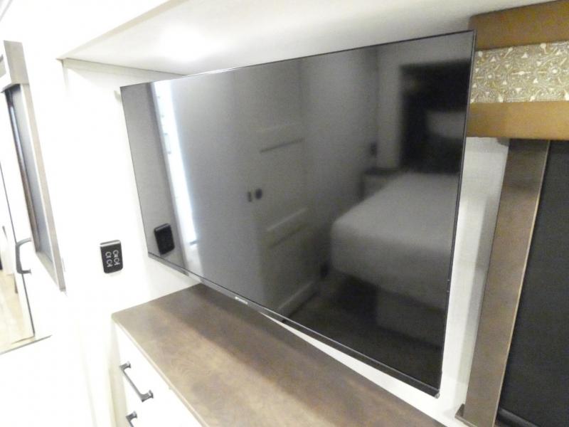 You will feel right at home in this fifth wheel! The rear private bedroom has a 72" x 80" king bed slide for a good night's rest, a rear large wardrobe with the washer and dryer next to it, and even a dresser with a 40" LED TV. And two can get ready at once in the full bathroom with the dual sink vanity. You can then head to either the desk slide to get some work done or whip up some scrambled eggs on the three burner cooktop at the island in the front kitchen. The kitchen even has a dishwasher for easy clean up and two bar stools at the high top dinette that overlooks the middle living area. Relax each night in true comfort on either the E-Z Glide sofa bed slide or the theater seating across from the entertainment center which has a fireplace and 65" Samsung LED Smart TV to watch your favorite movies!