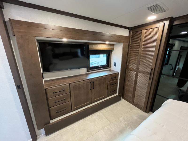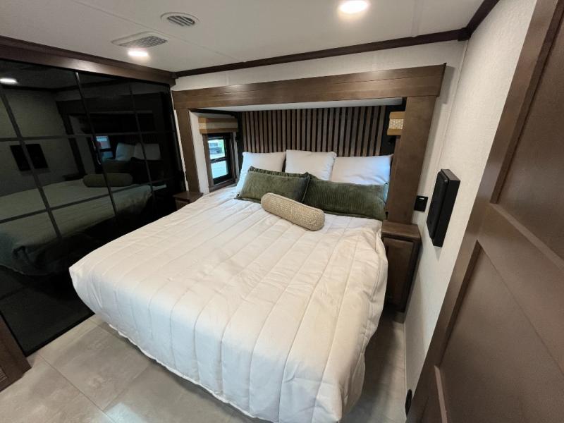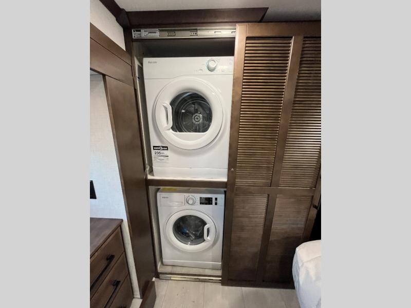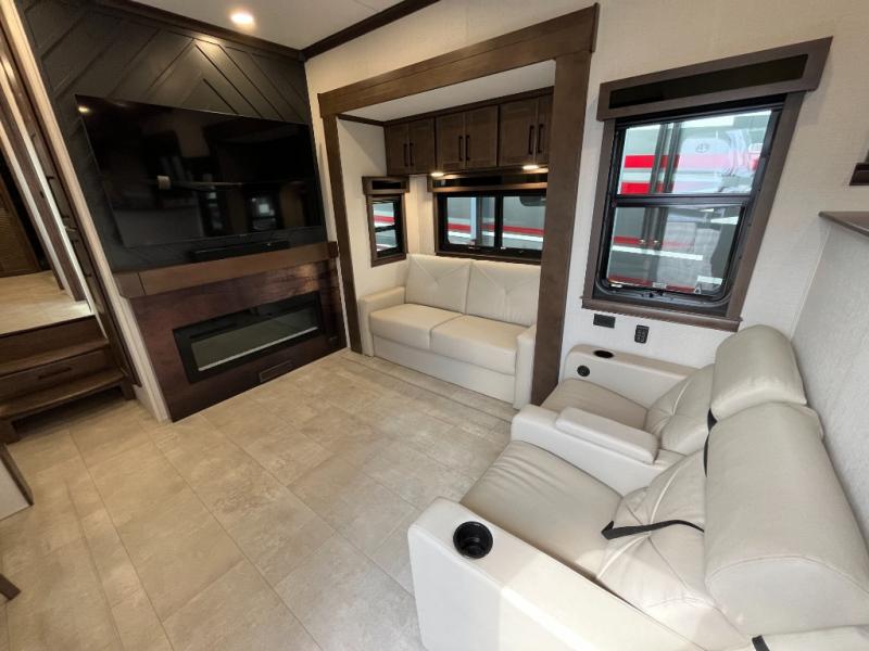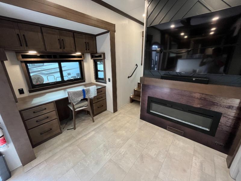 You will feel right at home in this fifth wheel! The rear private bedroom has a 72" x 80" king bed slide for a good night's rest, a rear large wardrobe with the washer and dryer next to it, and even a dresser with a 40" LED TV. And two can get ready at once in the full bathroom with the dual sink vanity. You can then head to either the desk slide to get some work done or whip up some scrambled eggs on the three burner cooktop at the island in the front kitchen. The kitchen even has a dishwasher for easy clean up and two bar stools at the high top dinette that overlooks the middle living area. Relax each night in true comfort on either the E-Z Glide sofa bed slide or the theater seating across from the entertainment center which has a fireplace and 65" Samsung LED Smart TV to watch your favorite movies!