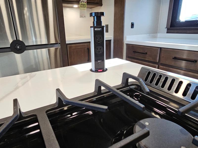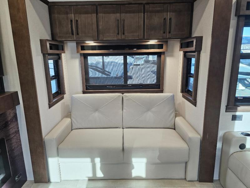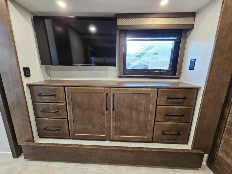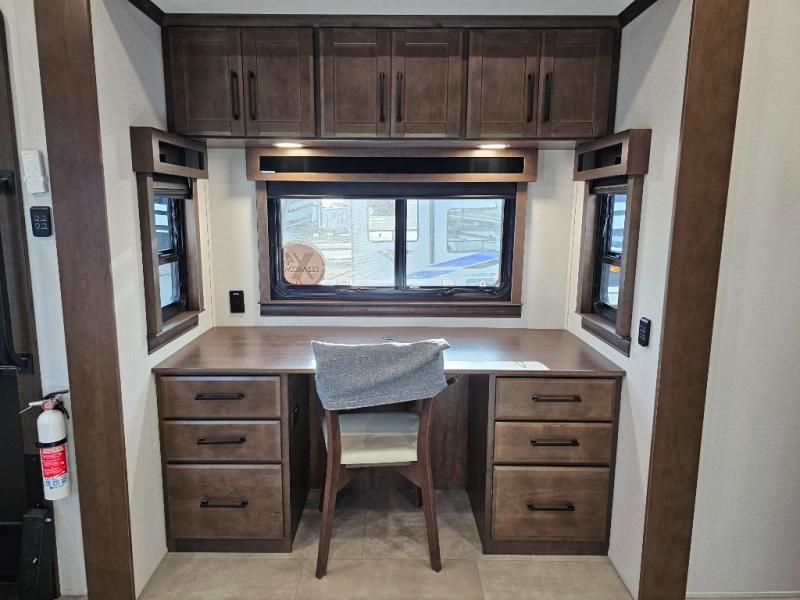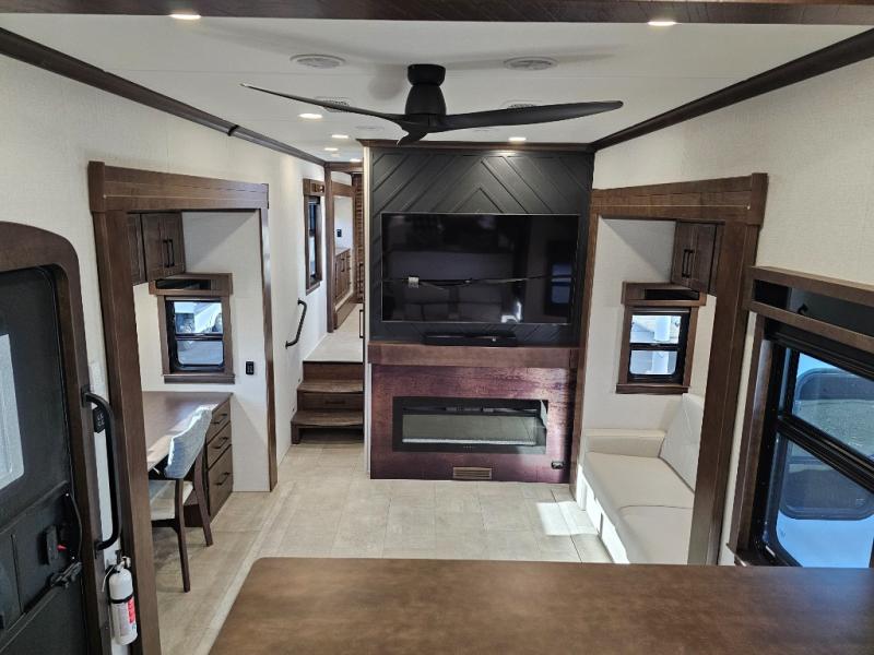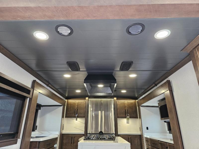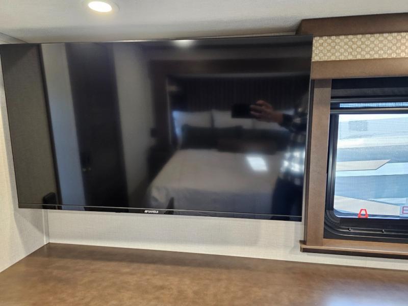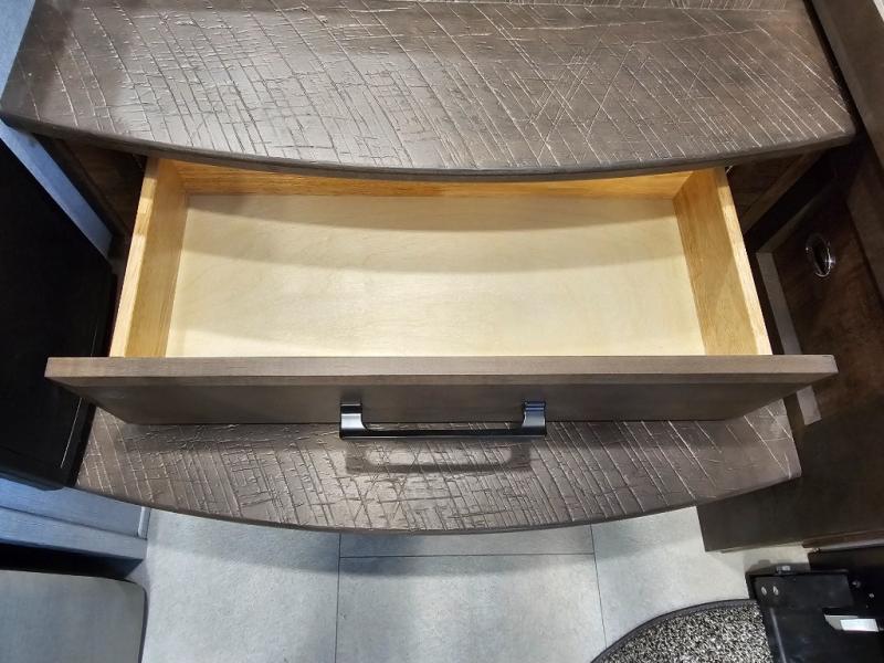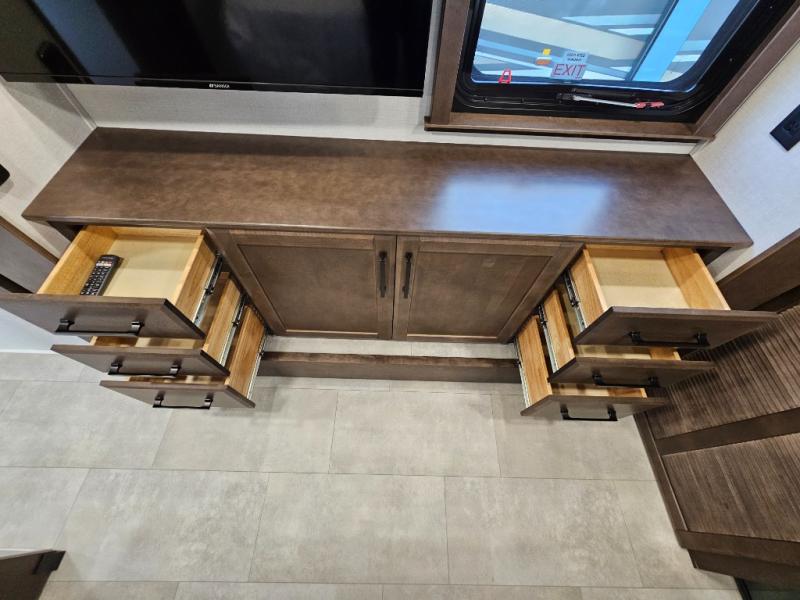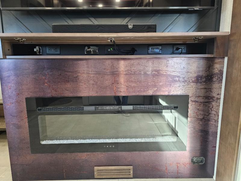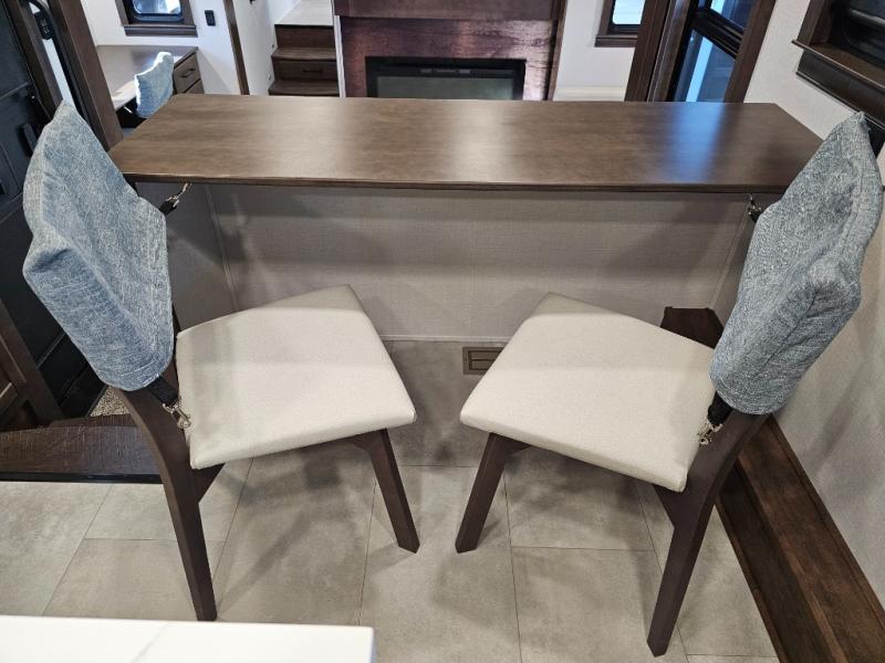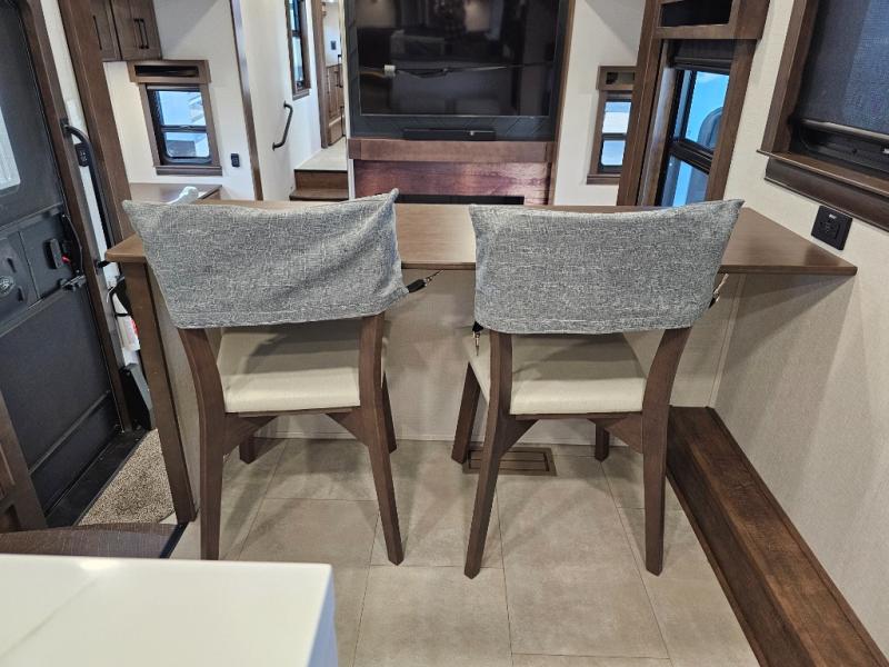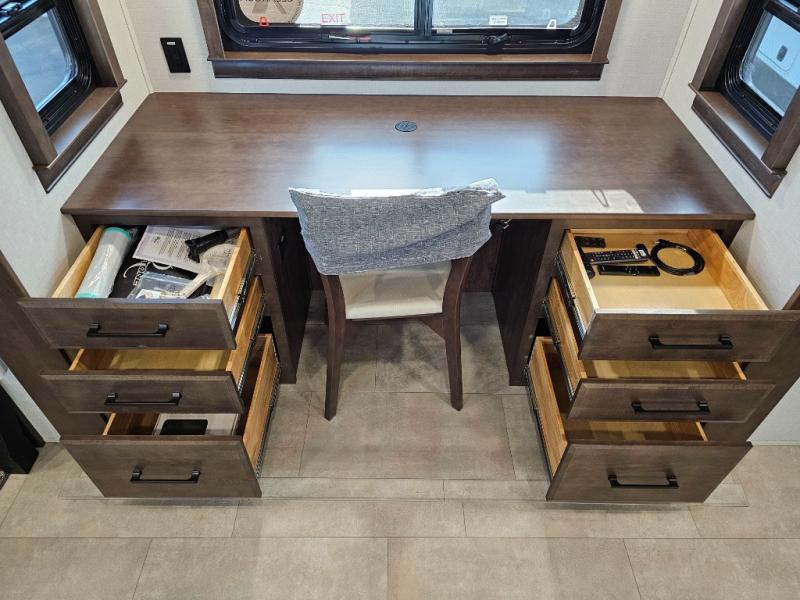 You will feel right at home in this fifth wheel! The rear private bedroom has a 72" x 80" king bed slide for a good night's rest, a rear large wardrobe with the washer and dryer next to it, and even a dresser with a 40" LED TV. And two can get ready at once in the full bathroom with the dual sink vanity. You can then head to either the desk slide to get some work done or whip up some scrambled eggs on the three burner cooktop at the island in the front kitchen. The kitchen even has a dishwasher for easy clean up and two bar stools at the high top dinette that overlooks the middle living area. Relax each night in true comfort on either the E-Z Glide sofa bed slide or the theater seating across from the entertainment center which has a fireplace and 65" Samsung LED Smart TV to watch your favorite movies!