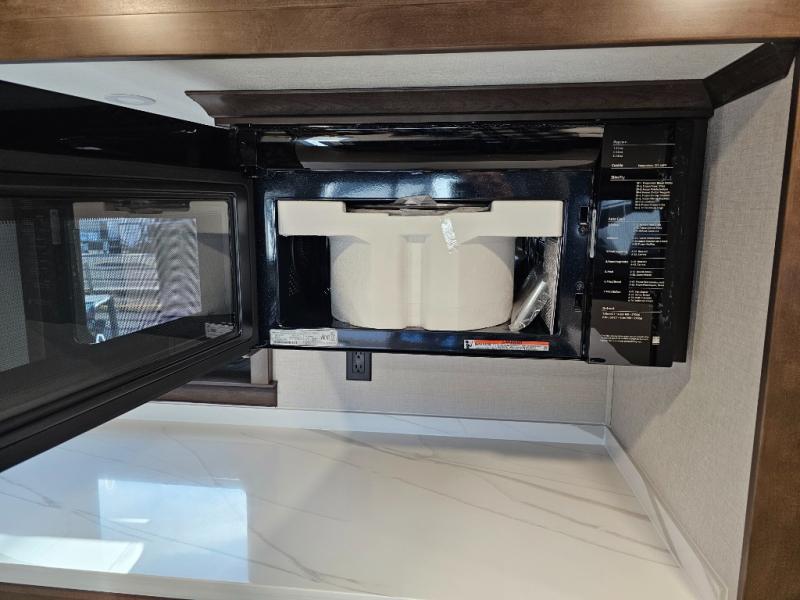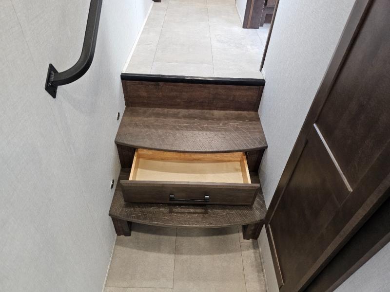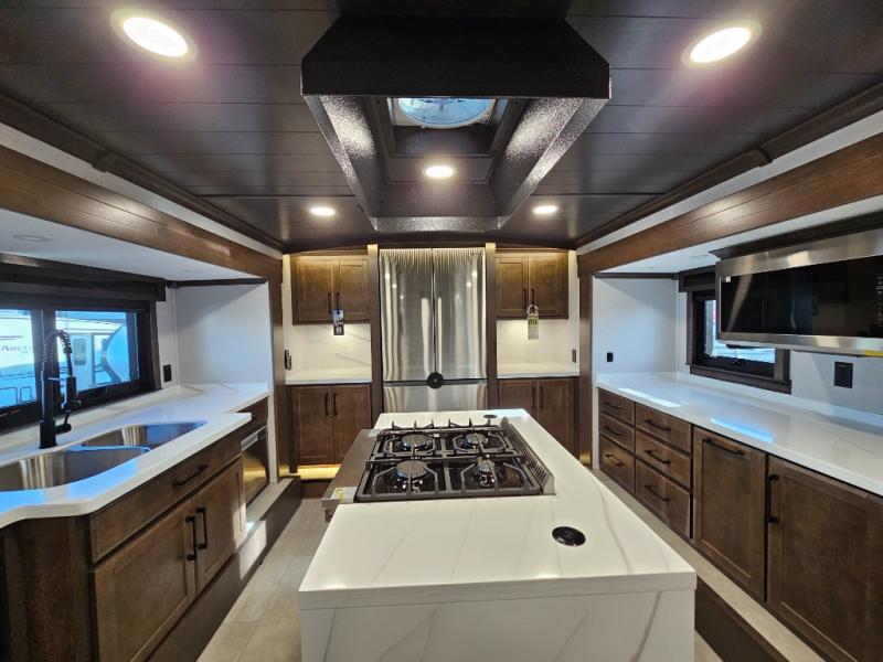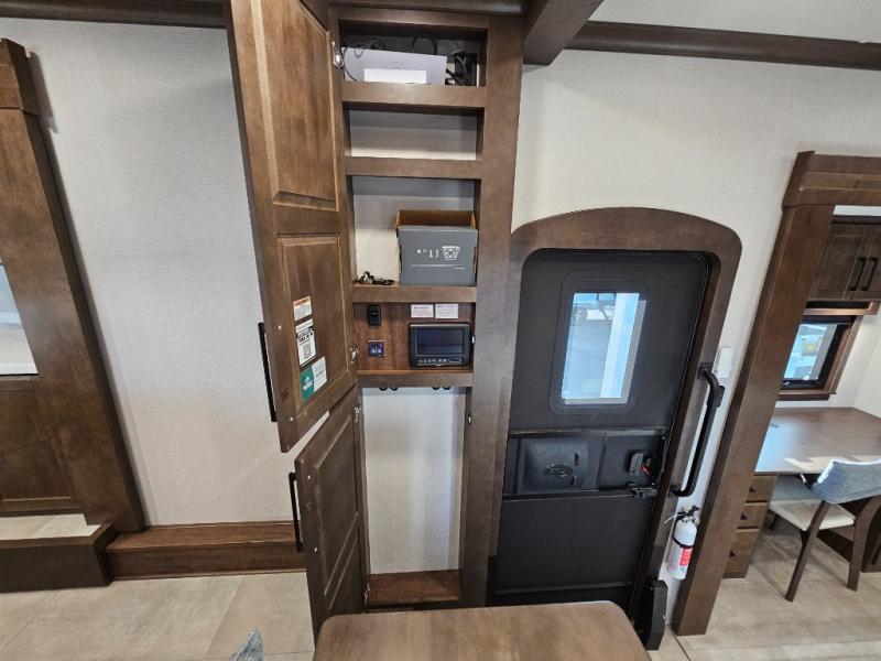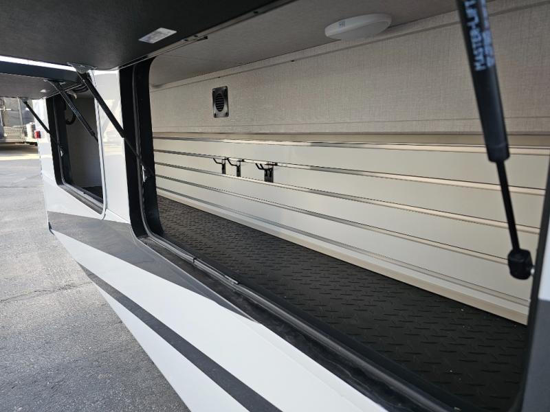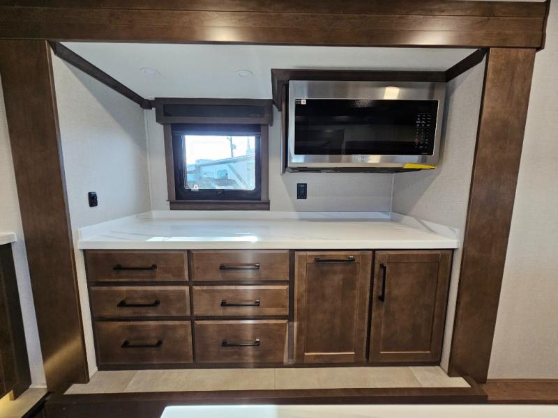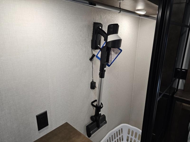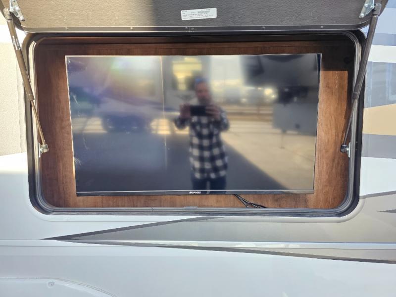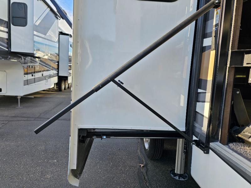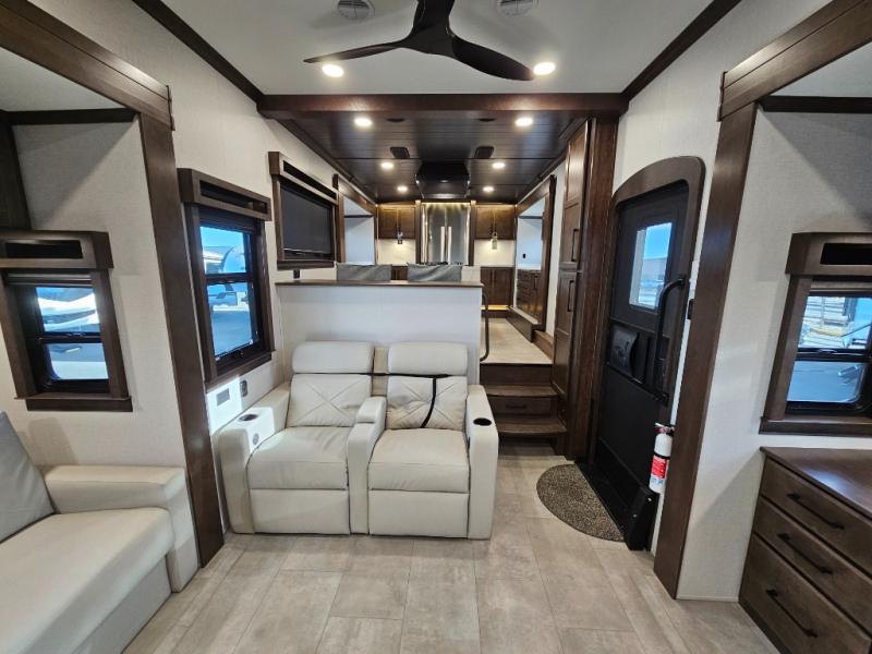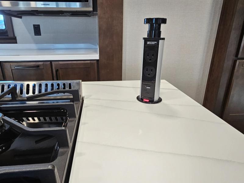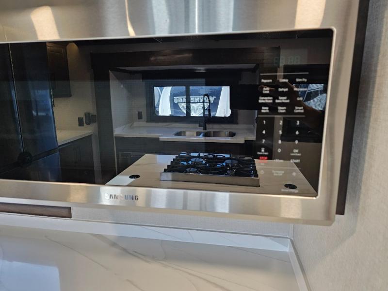 You will feel right at home in this fifth wheel! The rear private bedroom has a 72" x 80" king bed slide for a good night's rest, a rear large wardrobe with the washer and dryer next to it, and even a dresser with a 40" LED TV. And two can get ready at once in the full bathroom with the dual sink vanity. You can then head to either the desk slide to get some work done or whip up some scrambled eggs on the three burner cooktop at the island in the front kitchen. The kitchen even has a dishwasher for easy clean up and two bar stools at the high top dinette that overlooks the middle living area. Relax each night in true comfort on either the E-Z Glide sofa bed slide or the theater seating across from the entertainment center which has a fireplace and 65" Samsung LED Smart TV to watch your favorite movies!