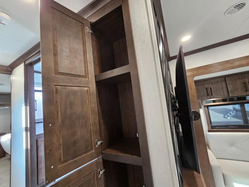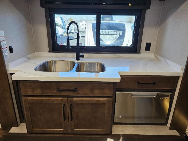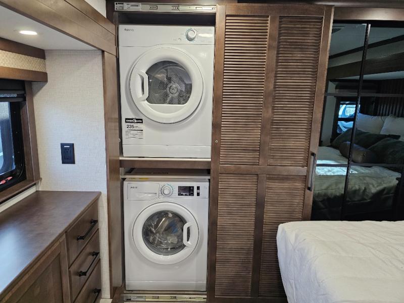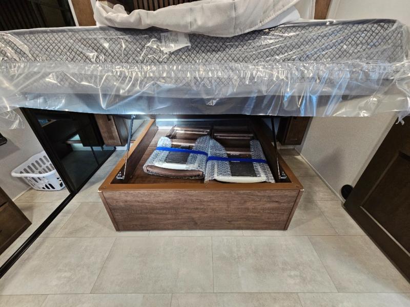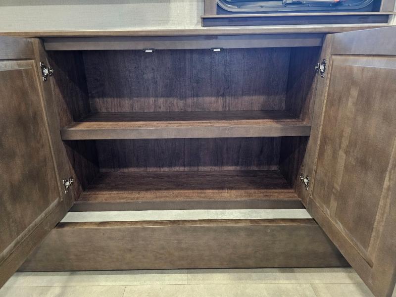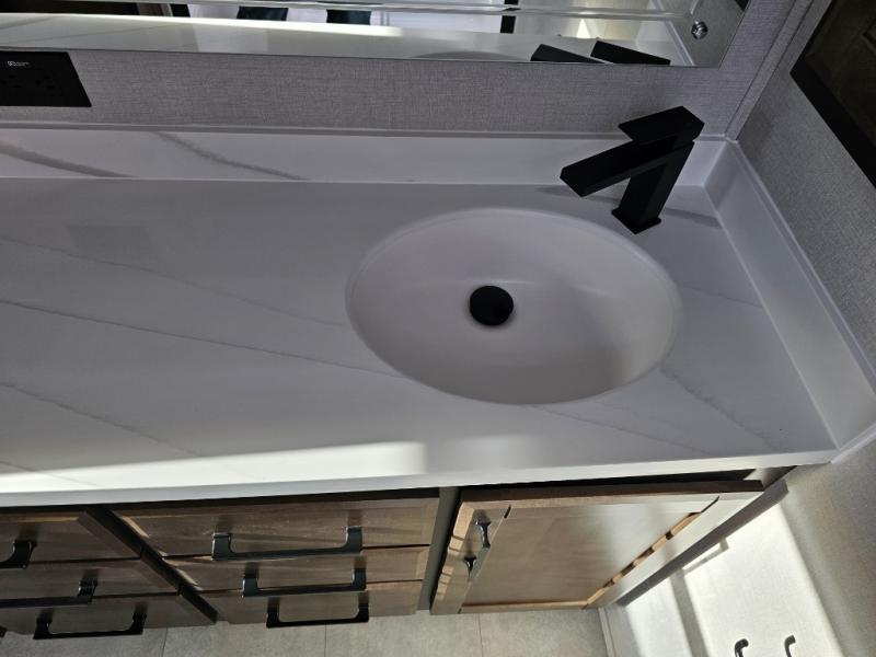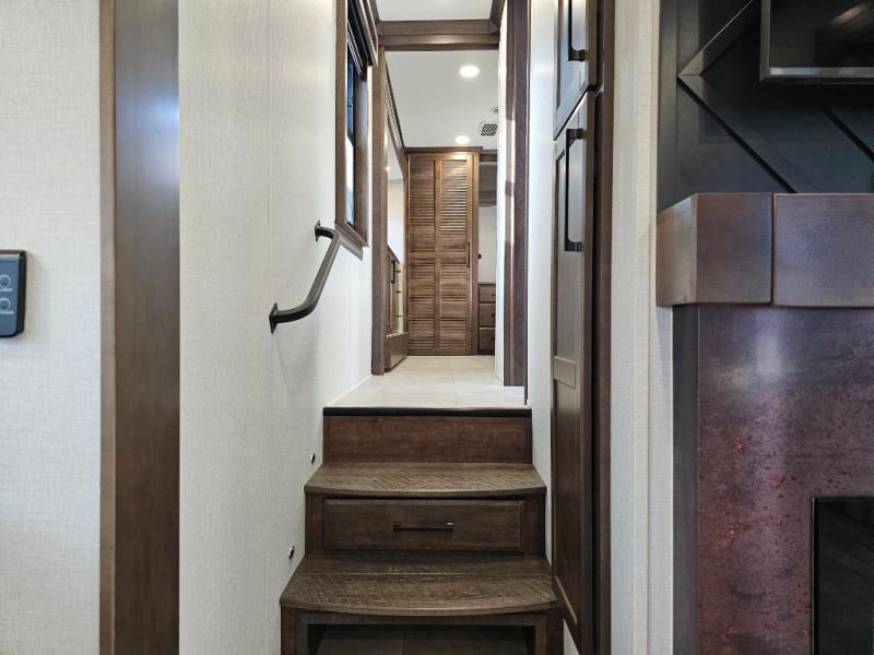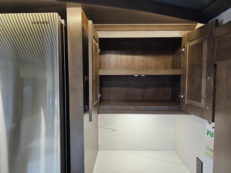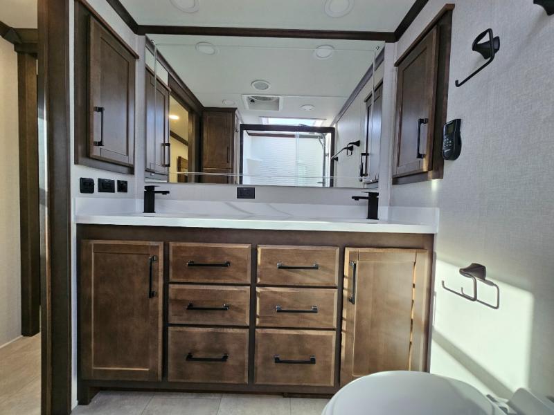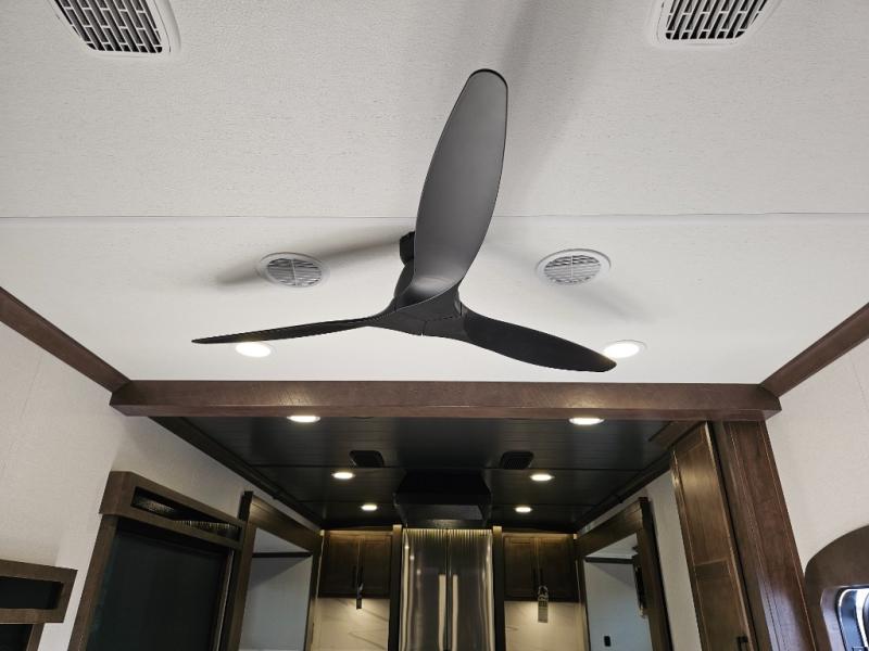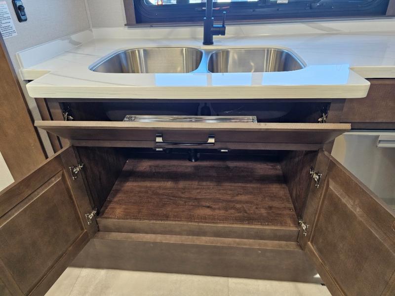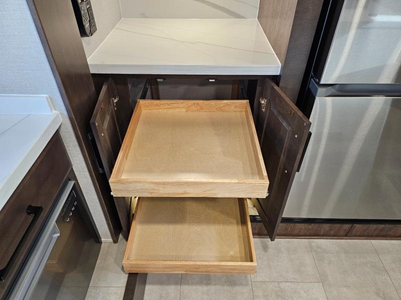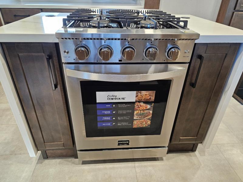 You will feel right at home in this fifth wheel! The rear private bedroom has a 72" x 80" king bed slide for a good night's rest, a rear large wardrobe with the washer and dryer next to it, and even a dresser with a 40" LED TV. And two can get ready at once in the full bathroom with the dual sink vanity. You can then head to either the desk slide to get some work done or whip up some scrambled eggs on the three burner cooktop at the island in the front kitchen. The kitchen even has a dishwasher for easy clean up and two bar stools at the high top dinette that overlooks the middle living area. Relax each night in true comfort on either the E-Z Glide sofa bed slide or the theater seating across from the entertainment center which has a fireplace and 65" Samsung LED Smart TV to watch your favorite movies!
