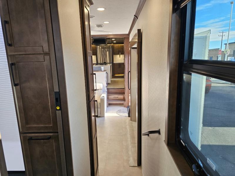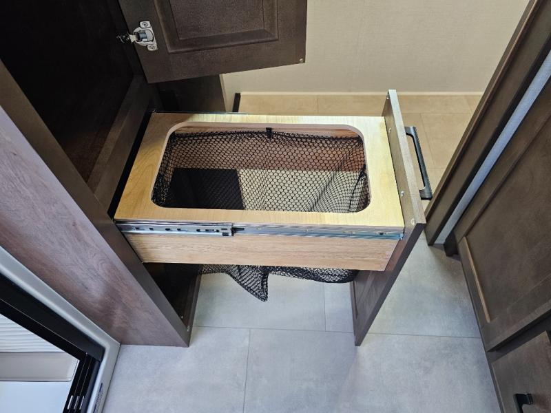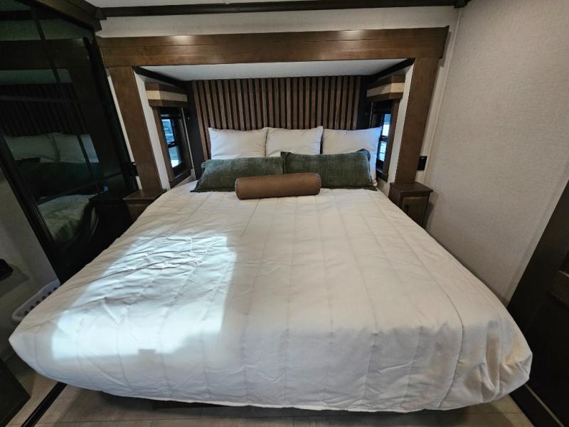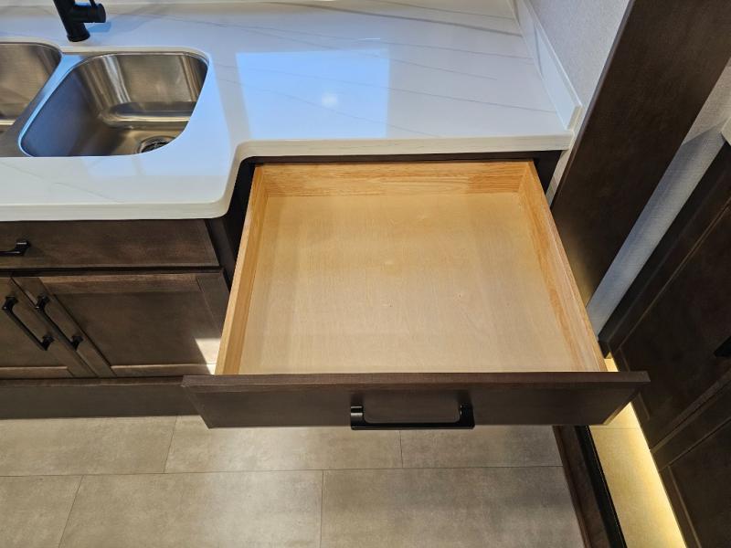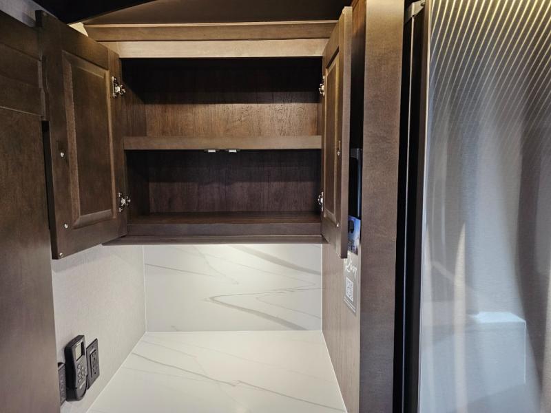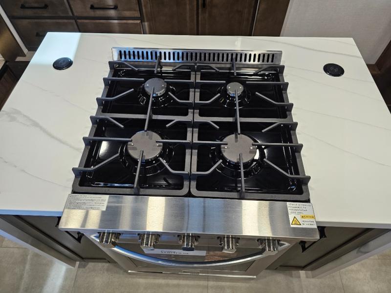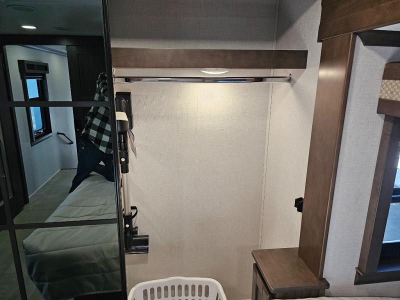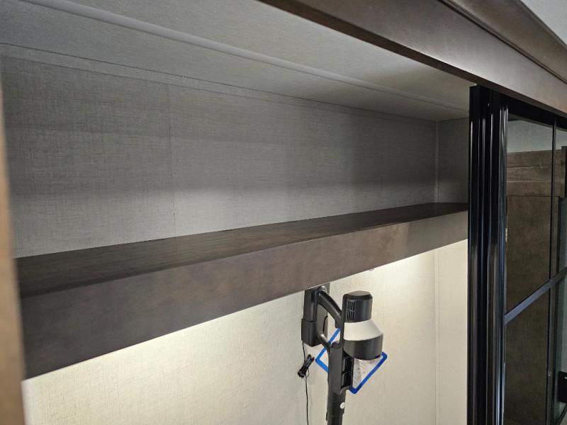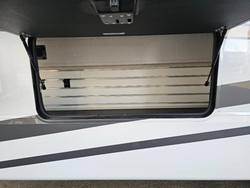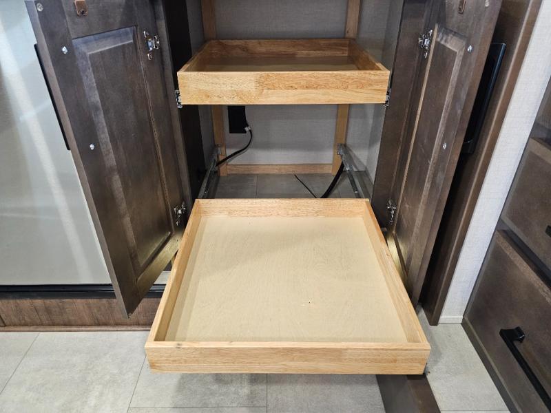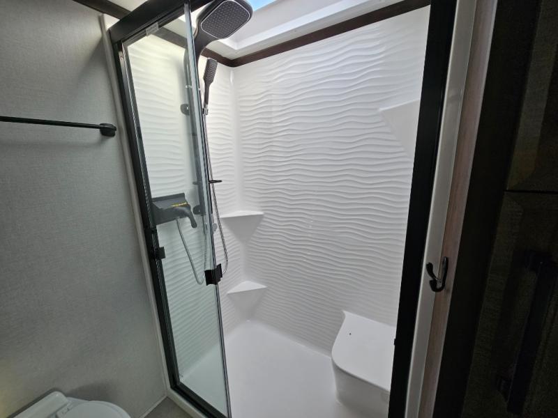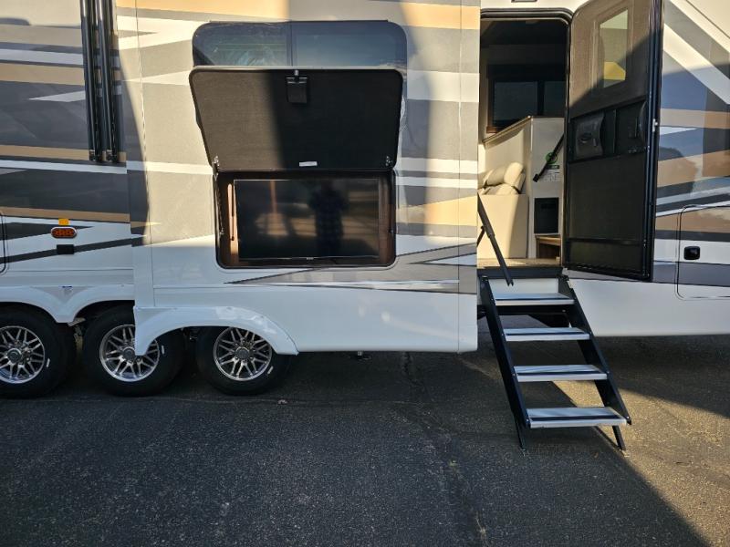 You will feel right at home in this fifth wheel! The rear private bedroom has a 72" x 80" king bed slide for a good night's rest, a rear large wardrobe with the washer and dryer next to it, and even a dresser with a 40" LED TV. And two can get ready at once in the full bathroom with the dual sink vanity. You can then head to either the desk slide to get some work done or whip up some scrambled eggs on the three burner cooktop at the island in the front kitchen. The kitchen even has a dishwasher for easy clean up and two bar stools at the high top dinette that overlooks the middle living area. Relax each night in true comfort on either the E-Z Glide sofa bed slide or the theater seating across from the entertainment center which has a fireplace and 65" Samsung LED Smart TV to watch your favorite movies!
