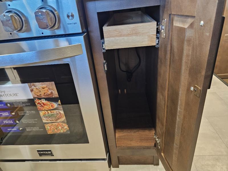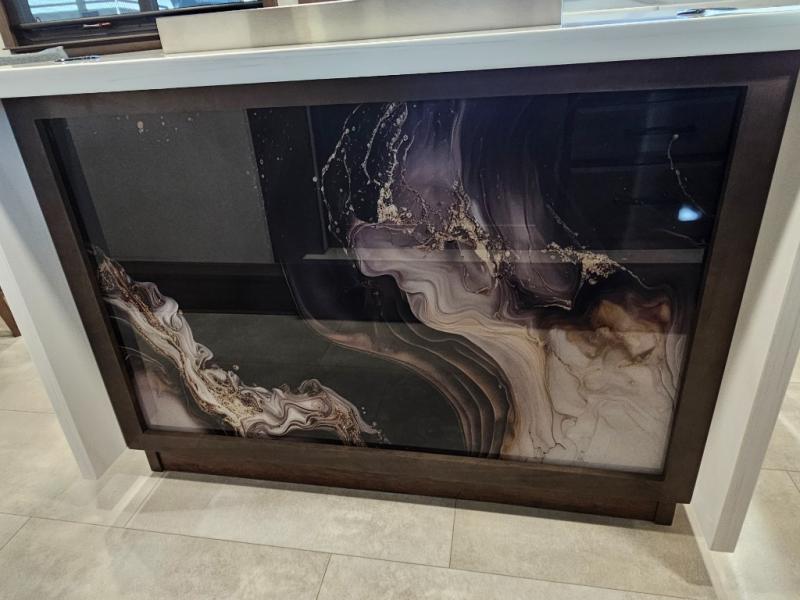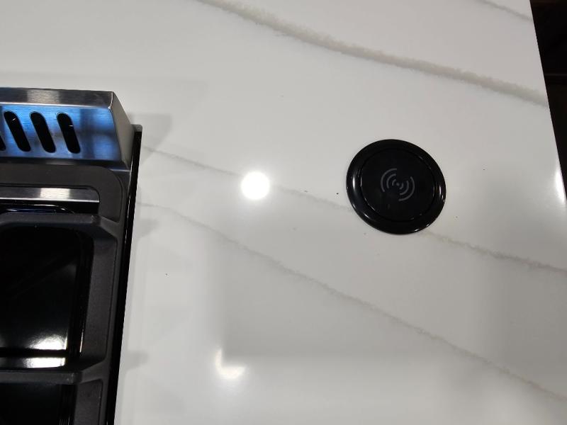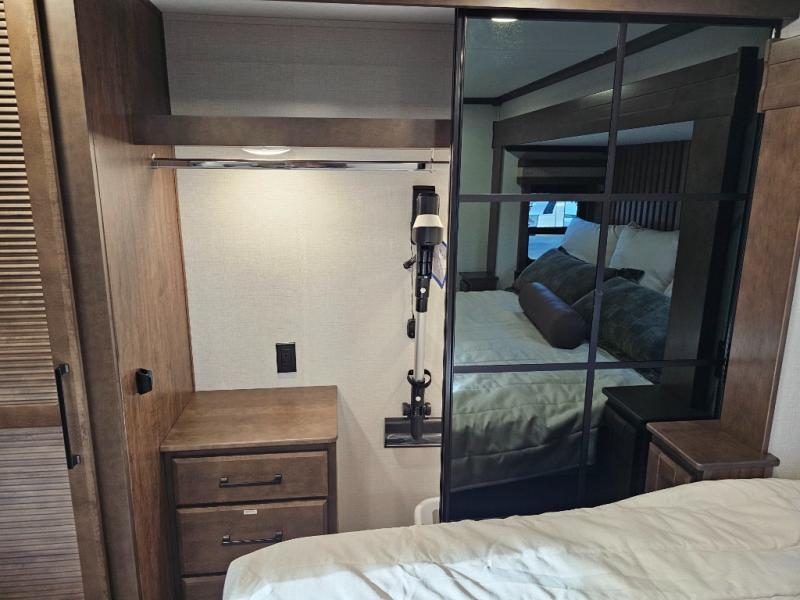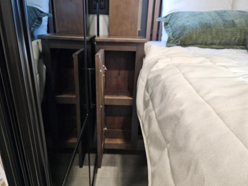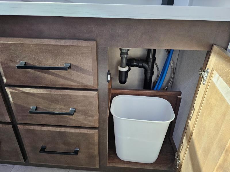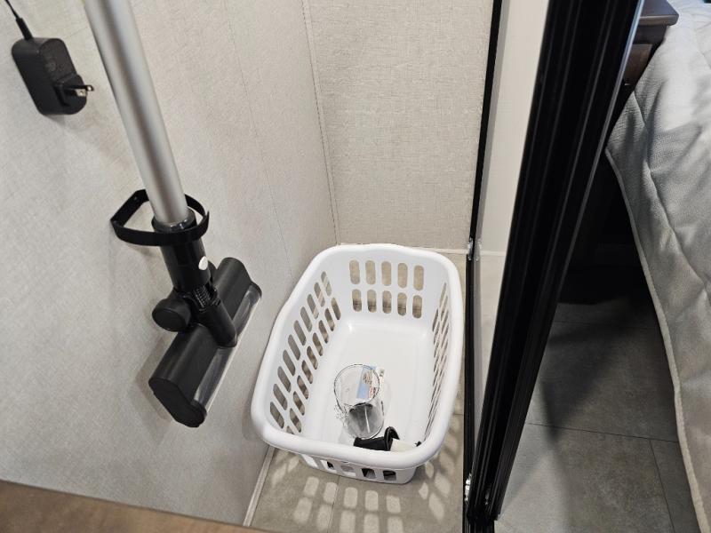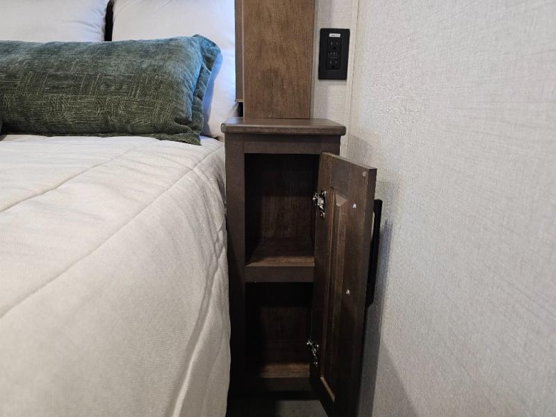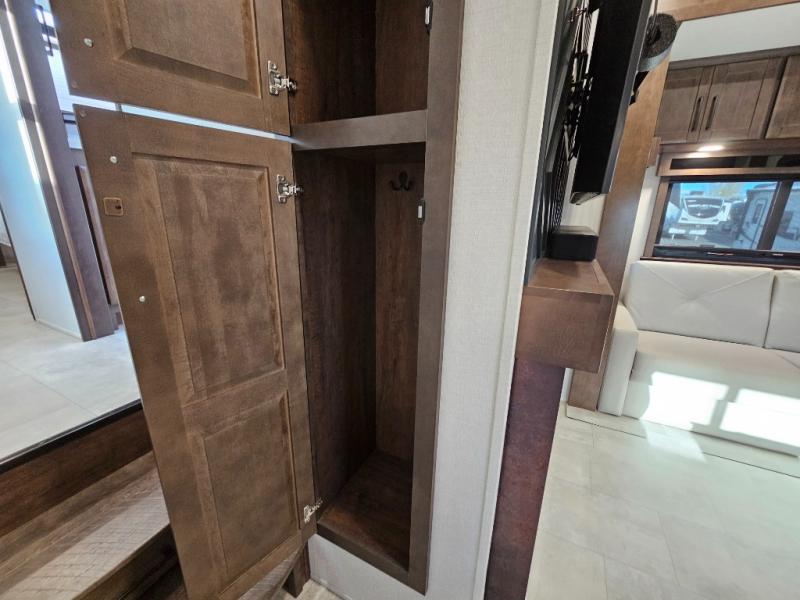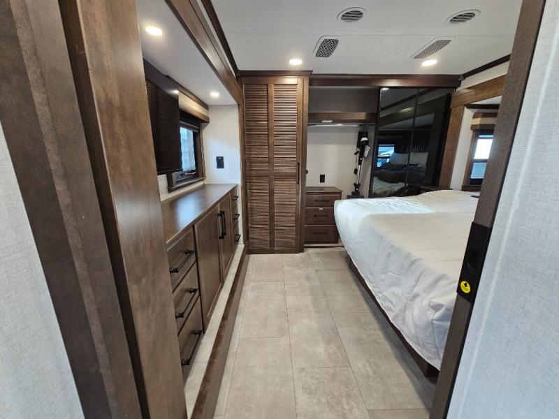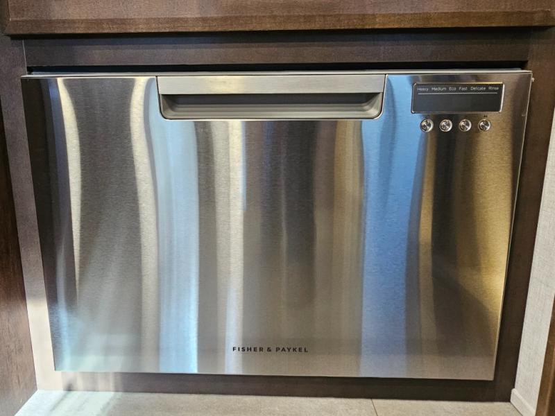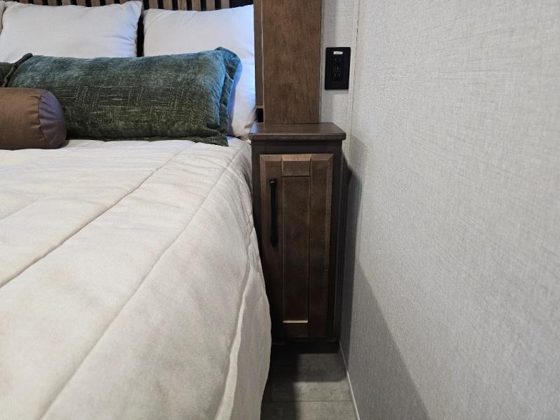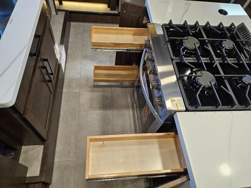 You will feel right at home in this fifth wheel! The rear private bedroom has a 72" x 80" king bed slide for a good night's rest, a rear large wardrobe with the washer and dryer next to it, and even a dresser with a 40" LED TV. And two can get ready at once in the full bathroom with the dual sink vanity. You can then head to either the desk slide to get some work done or whip up some scrambled eggs on the three burner cooktop at the island in the front kitchen. The kitchen even has a dishwasher for easy clean up and two bar stools at the high top dinette that overlooks the middle living area. Relax each night in true comfort on either the E-Z Glide sofa bed slide or the theater seating across from the entertainment center which has a fireplace and 65" Samsung LED Smart TV to watch your favorite movies!