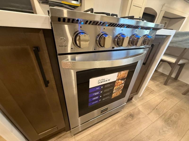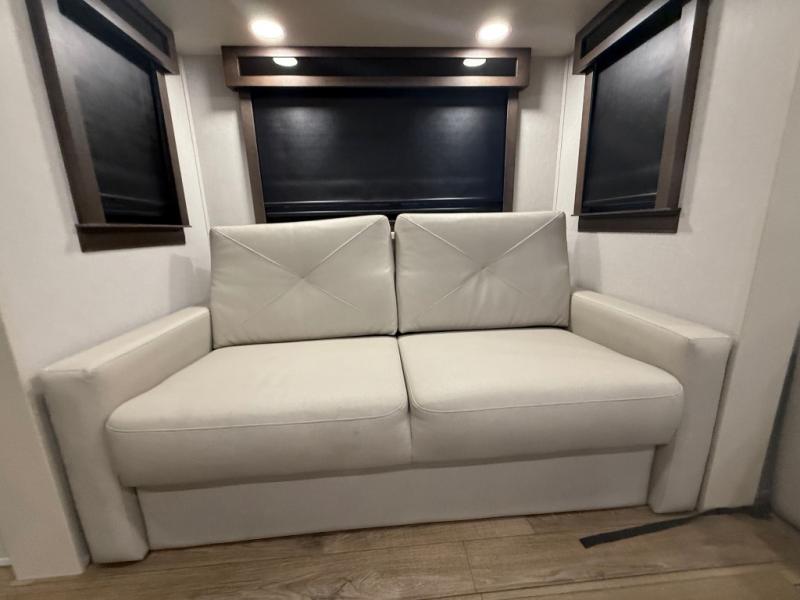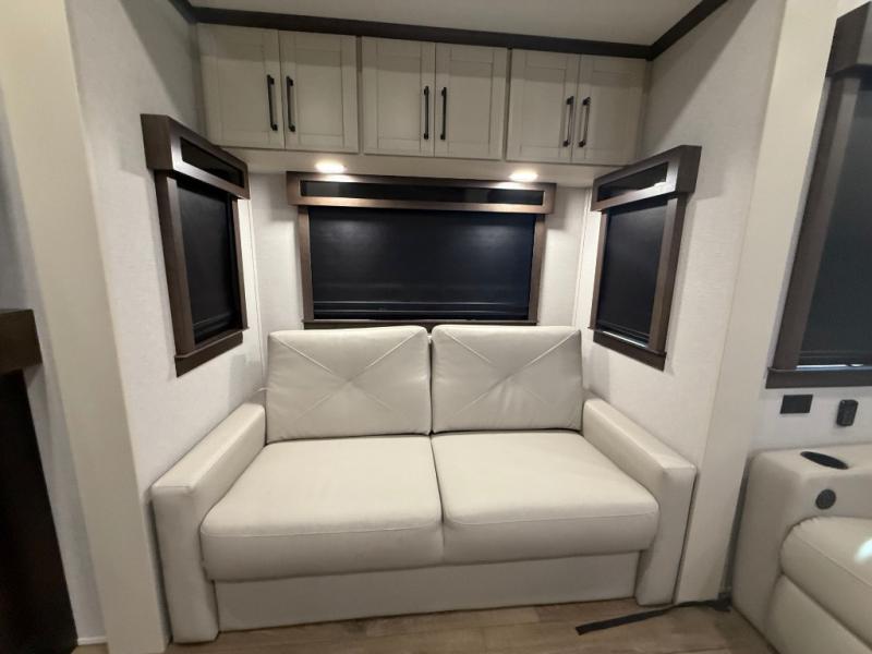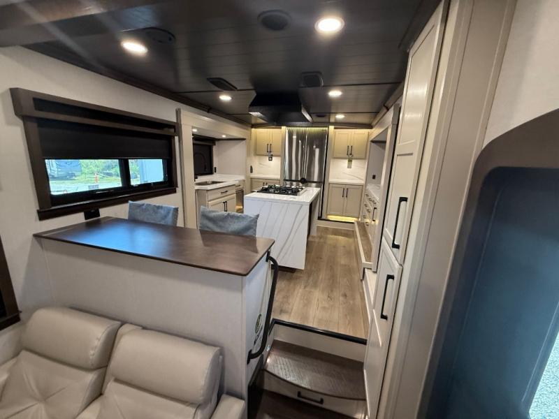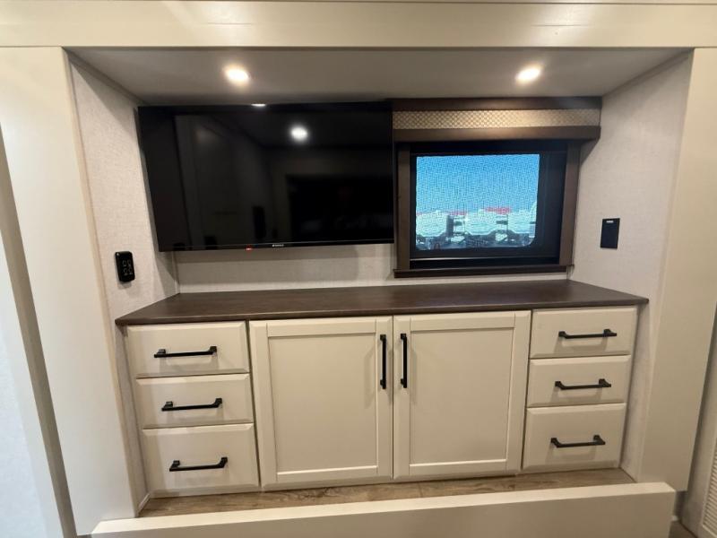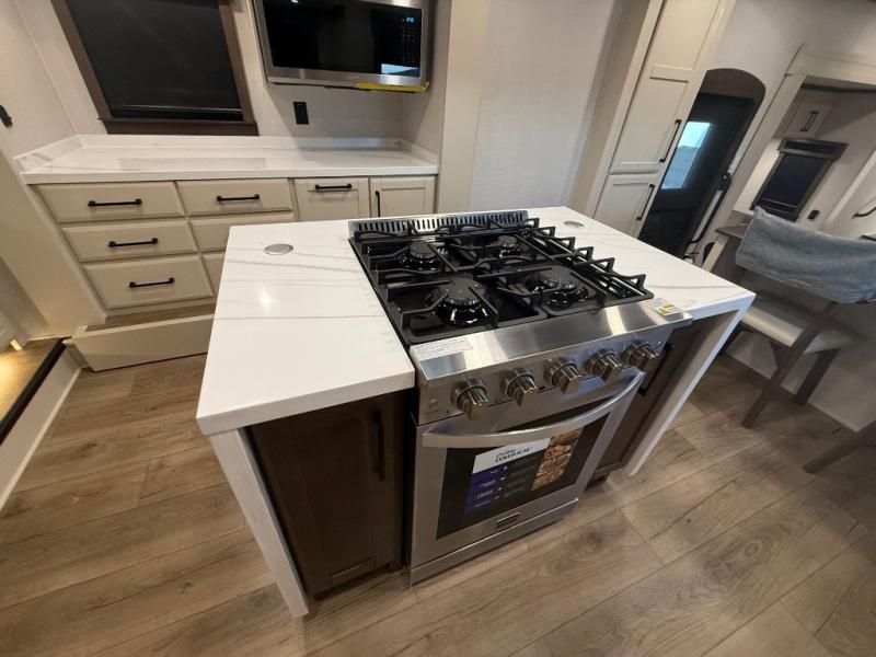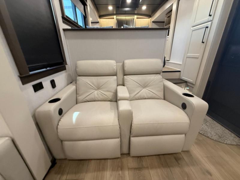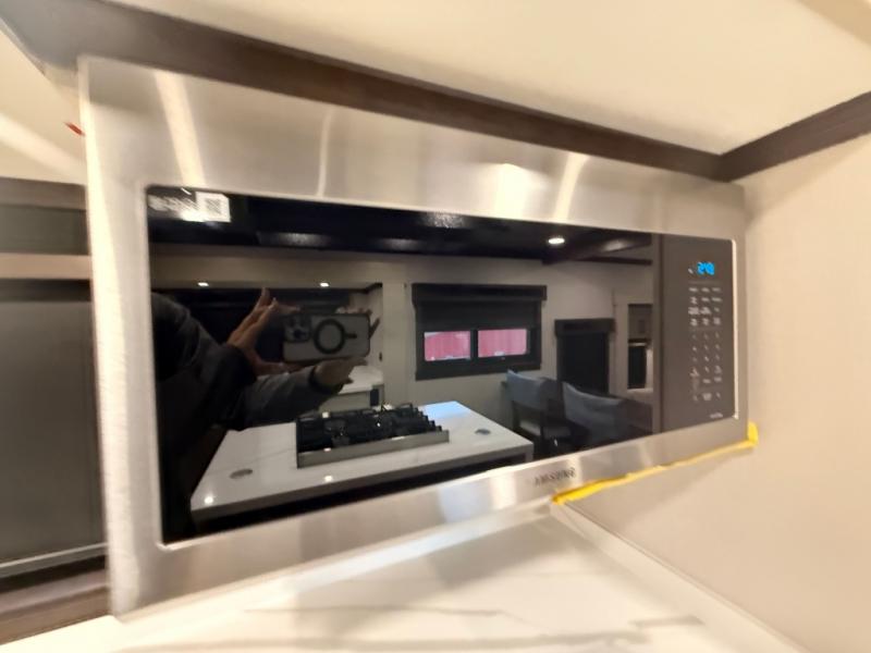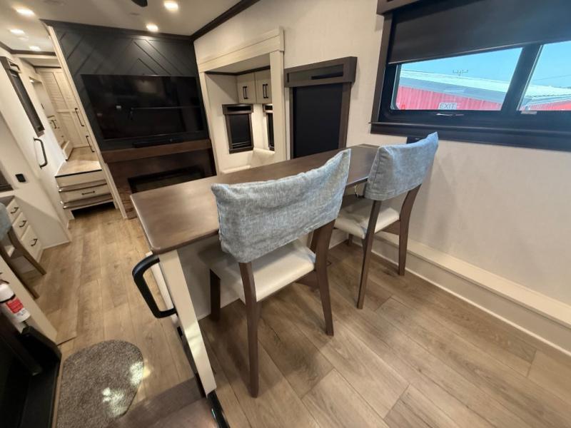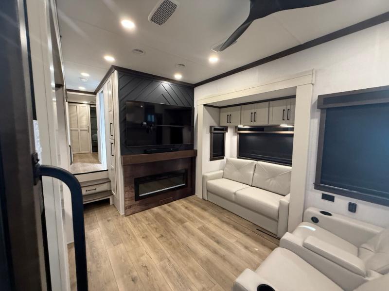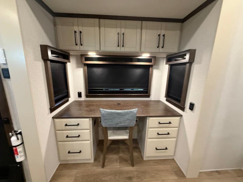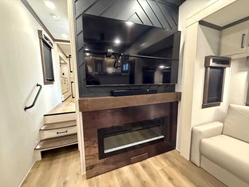 You will feel right at home in this fifth wheel! The rear private bedroom has a 72" x 80" king bed slide for a good night's rest, a rear large wardrobe with the washer and dryer next to it, and even a dresser with a 40" LED TV. And two can get ready at once in the full bathroom with the dual sink vanity. You can then head to either the desk slide to get some work done or whip up some scrambled eggs on the three burner cooktop at the island in the front kitchen. The kitchen even has a dishwasher for easy clean up and two bar stools at the high top dinette that overlooks the middle living area. Relax each night in true comfort on either the E-Z Glide sofa bed slide or the theater seating across from the entertainment center which has a fireplace and 65" Samsung LED Smart TV to watch your favorite movies!