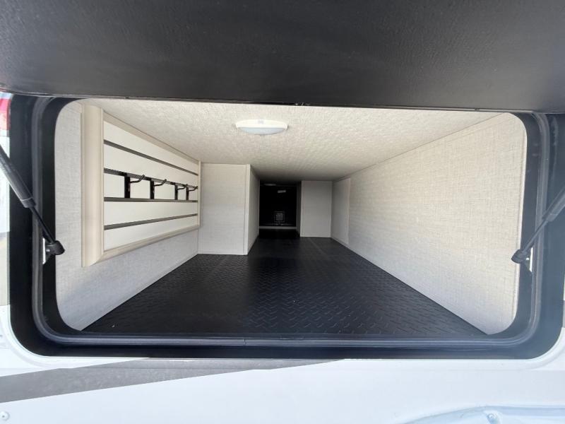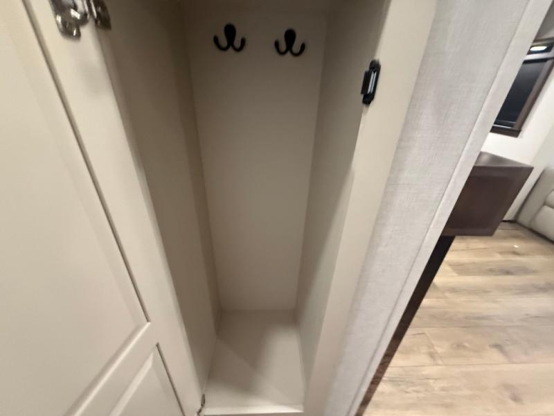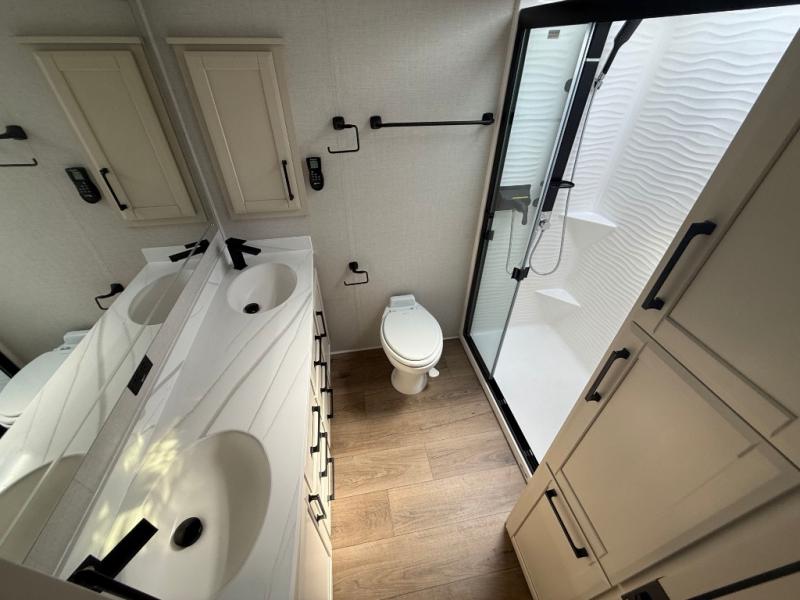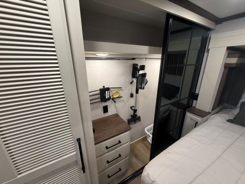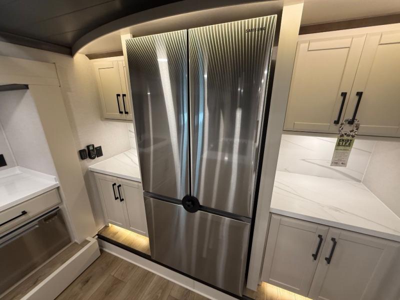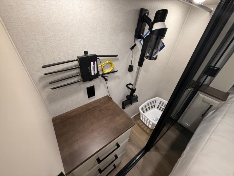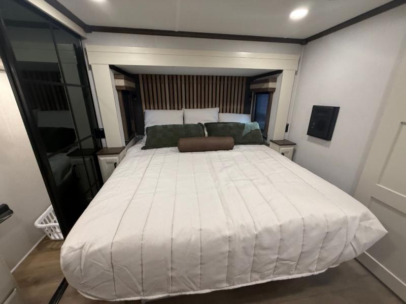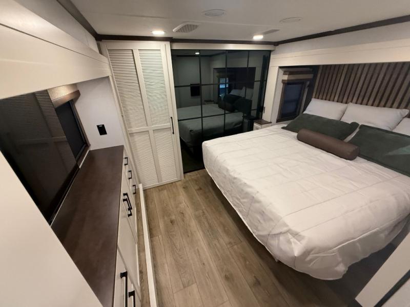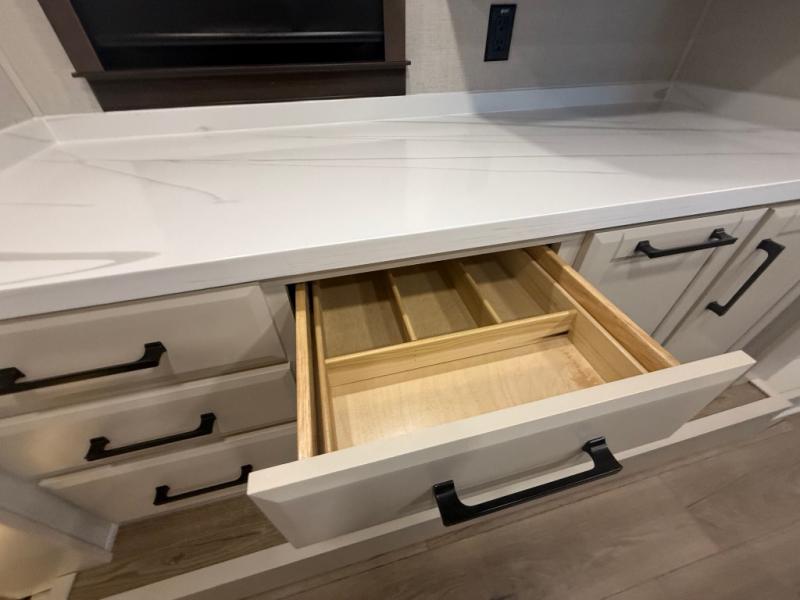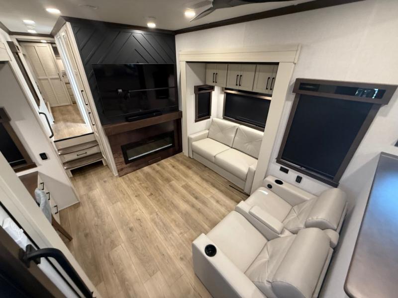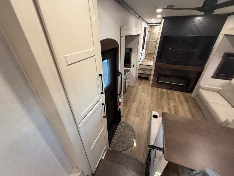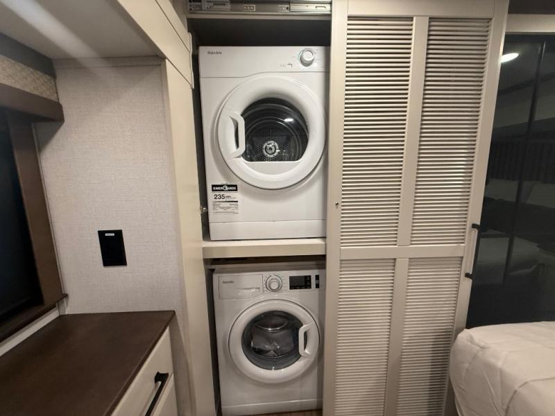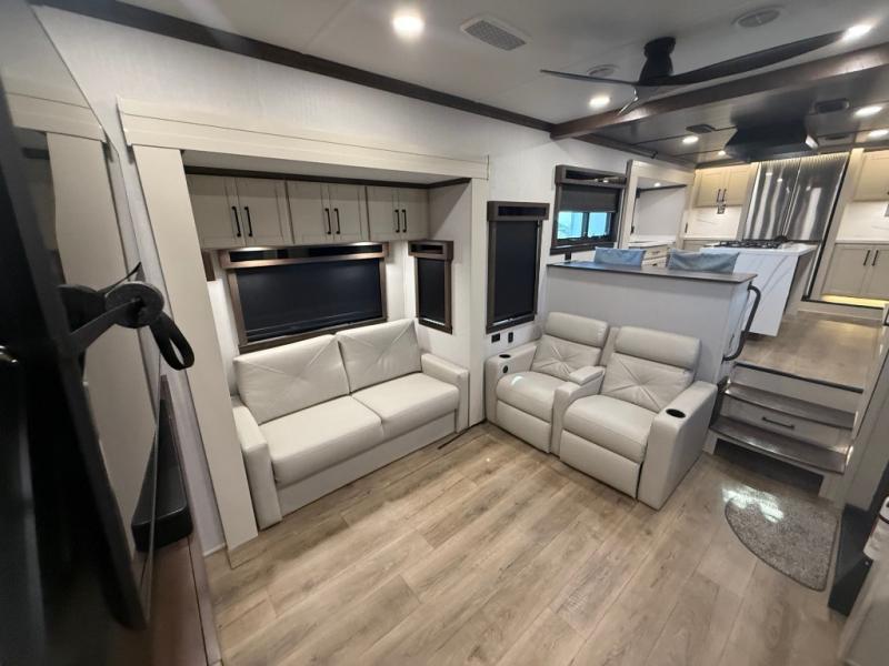 You will feel right at home in this fifth wheel! The rear private bedroom has a 72" x 80" king bed slide for a good night's rest, a rear large wardrobe with the washer and dryer next to it, and even a dresser with a 40" LED TV. And two can get ready at once in the full bathroom with the dual sink vanity. You can then head to either the desk slide to get some work done or whip up some scrambled eggs on the three burner cooktop at the island in the front kitchen. The kitchen even has a dishwasher for easy clean up and two bar stools at the high top dinette that overlooks the middle living area. Relax each night in true comfort on either the E-Z Glide sofa bed slide or the theater seating across from the entertainment center which has a fireplace and 65" Samsung LED Smart TV to watch your favorite movies!