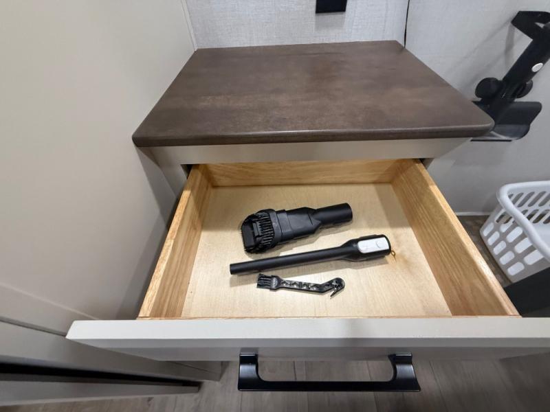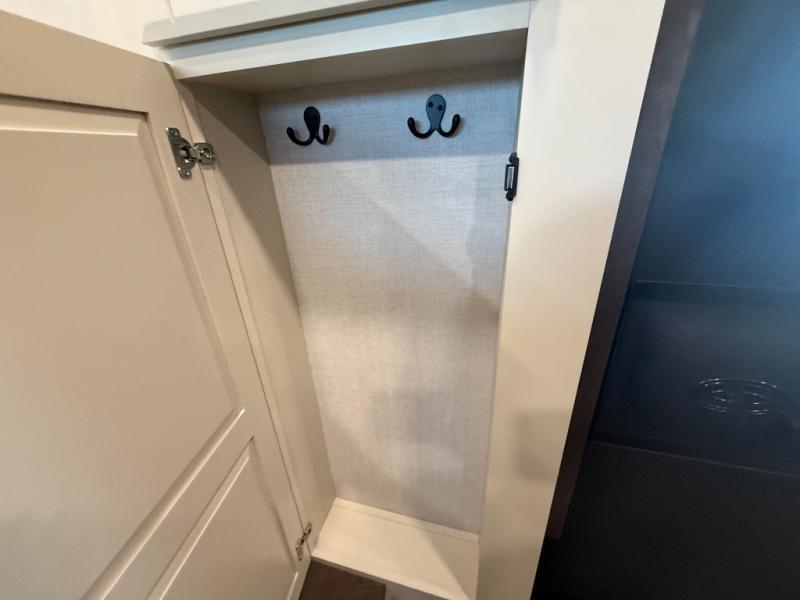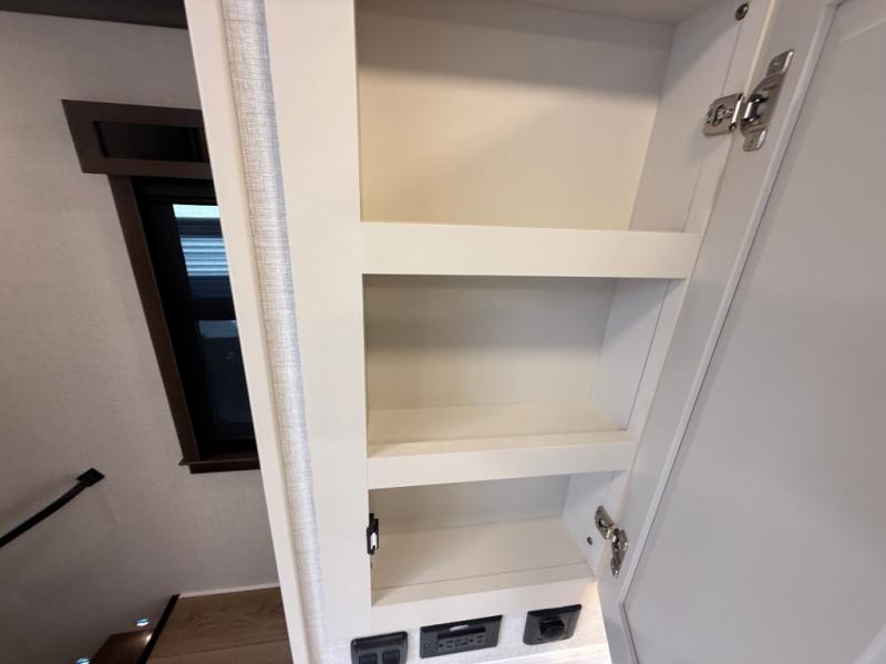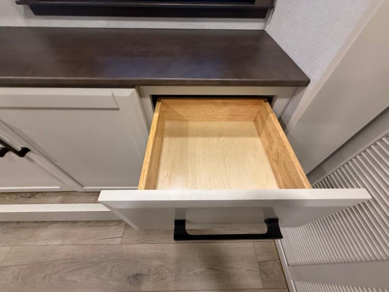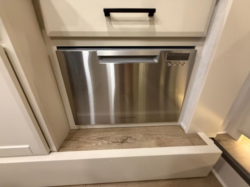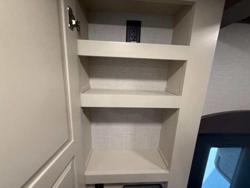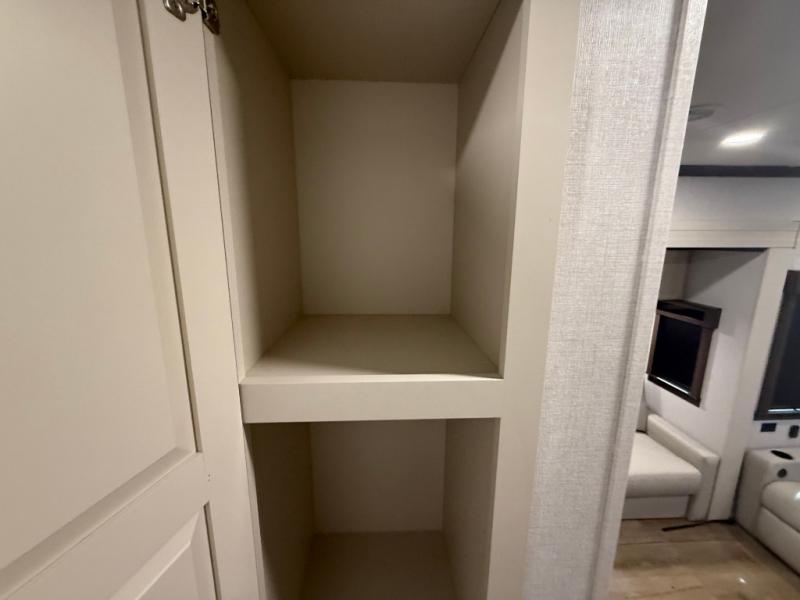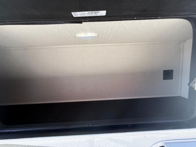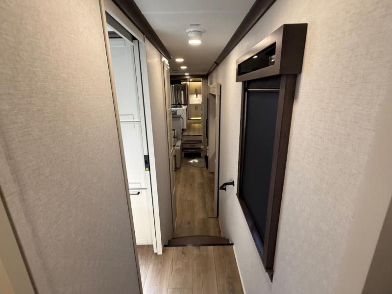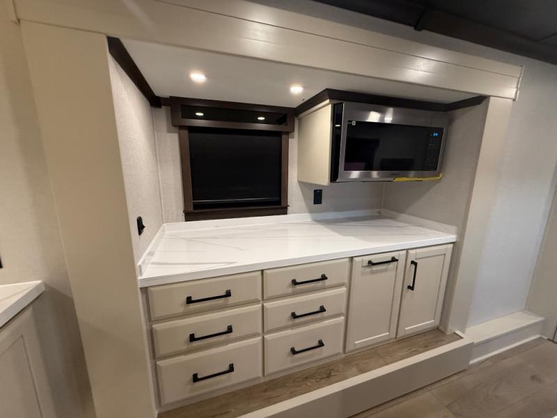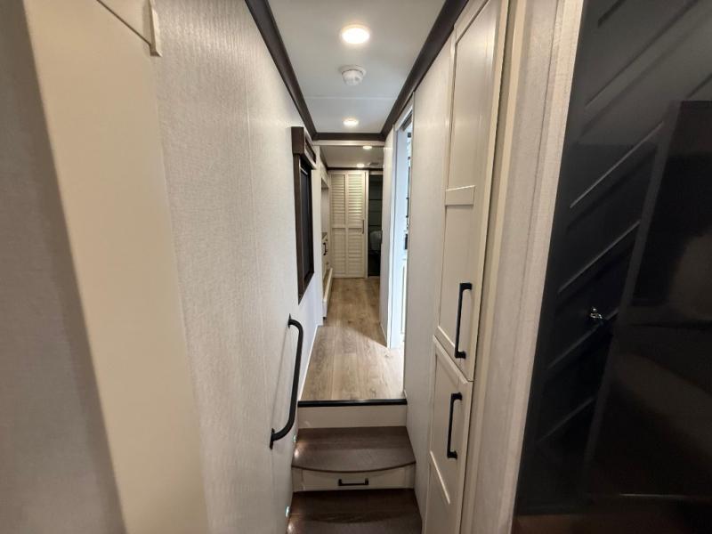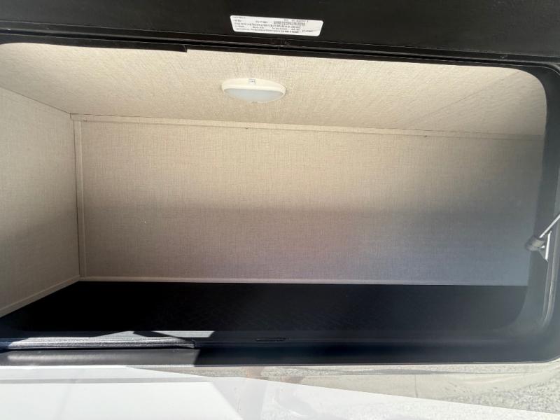 You will feel right at home in this fifth wheel! The rear private bedroom has a 72" x 80" king bed slide for a good night's rest, a rear large wardrobe with the washer and dryer next to it, and even a dresser with a 40" LED TV. And two can get ready at once in the full bathroom with the dual sink vanity. You can then head to either the desk slide to get some work done or whip up some scrambled eggs on the three burner cooktop at the island in the front kitchen. The kitchen even has a dishwasher for easy clean up and two bar stools at the high top dinette that overlooks the middle living area. Relax each night in true comfort on either the E-Z Glide sofa bed slide or the theater seating across from the entertainment center which has a fireplace and 65" Samsung LED Smart TV to watch your favorite movies!