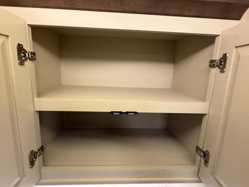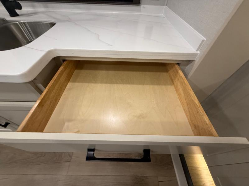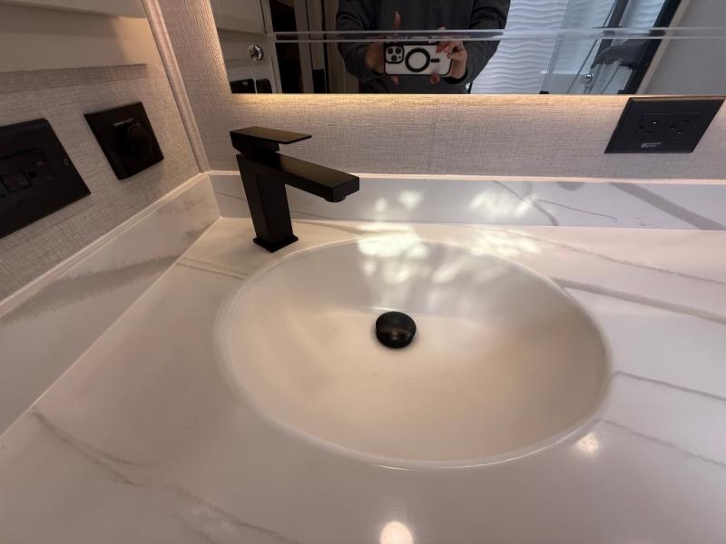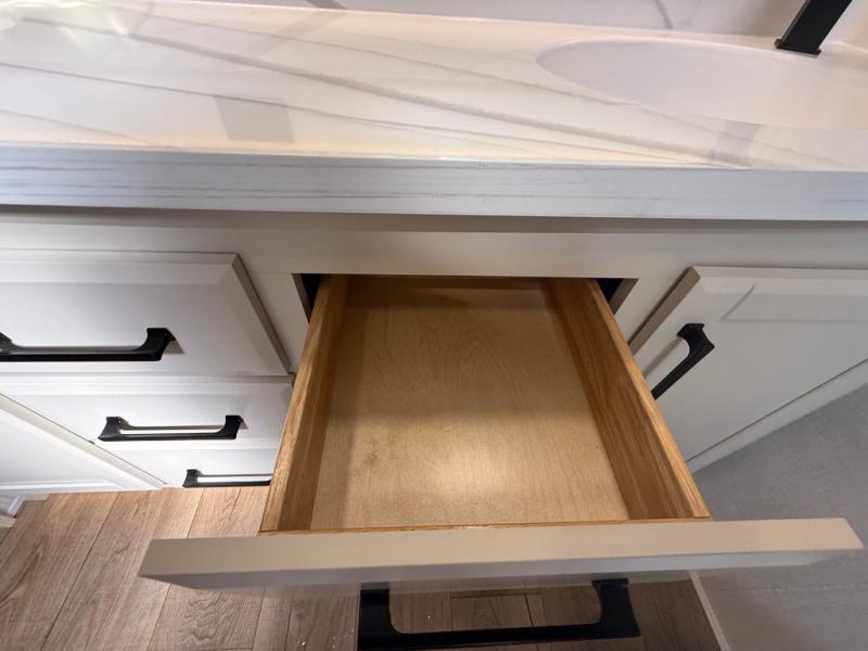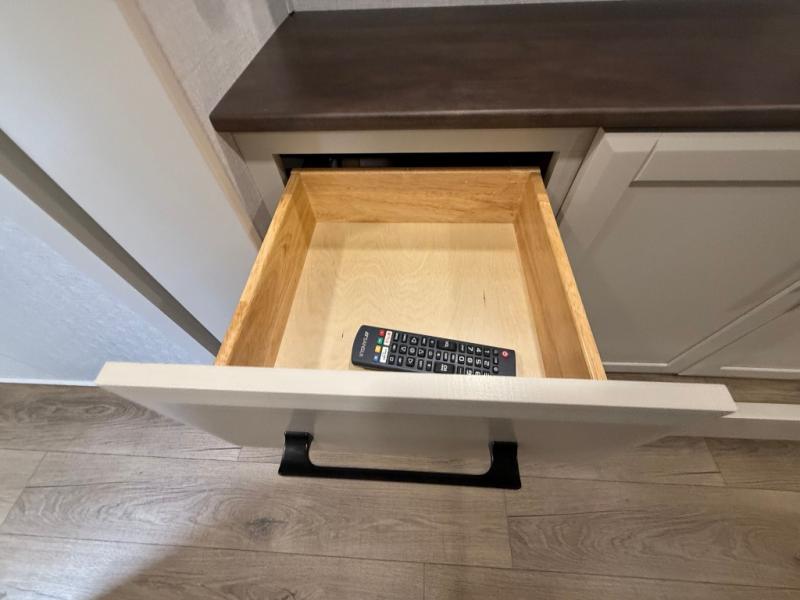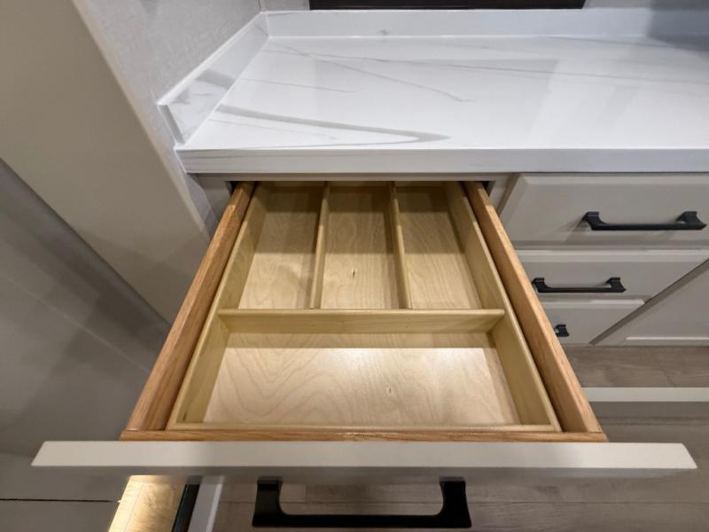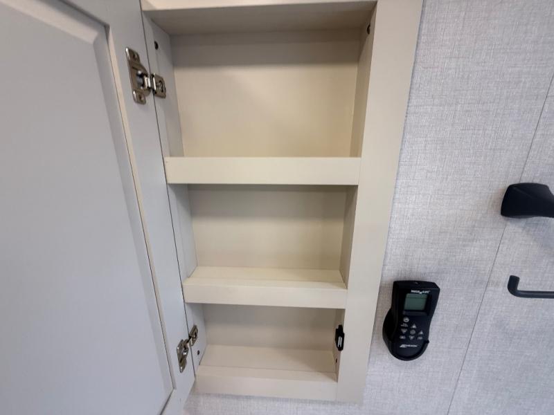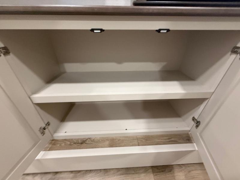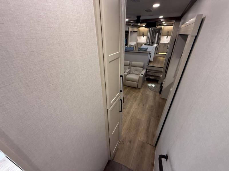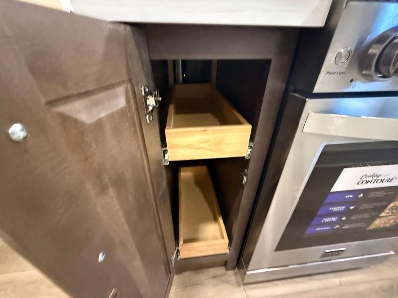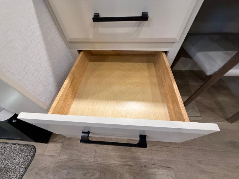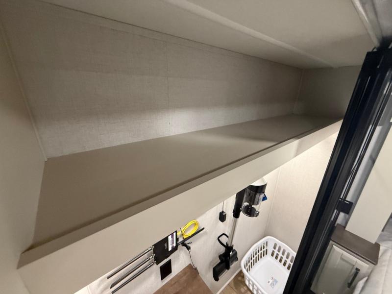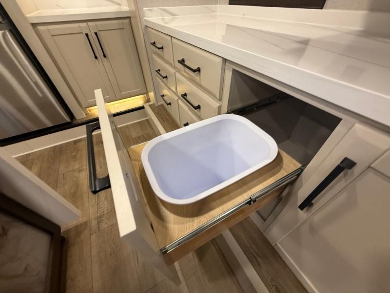 You will feel right at home in this fifth wheel! The rear private bedroom has a 72" x 80" king bed slide for a good night's rest, a rear large wardrobe with the washer and dryer next to it, and even a dresser with a 40" LED TV. And two can get ready at once in the full bathroom with the dual sink vanity. You can then head to either the desk slide to get some work done or whip up some scrambled eggs on the three burner cooktop at the island in the front kitchen. The kitchen even has a dishwasher for easy clean up and two bar stools at the high top dinette that overlooks the middle living area. Relax each night in true comfort on either the E-Z Glide sofa bed slide or the theater seating across from the entertainment center which has a fireplace and 65" Samsung LED Smart TV to watch your favorite movies!