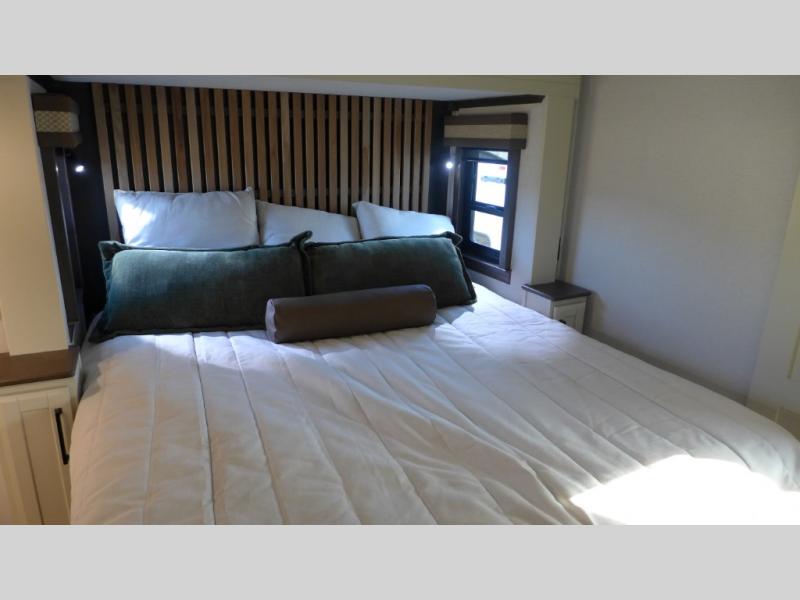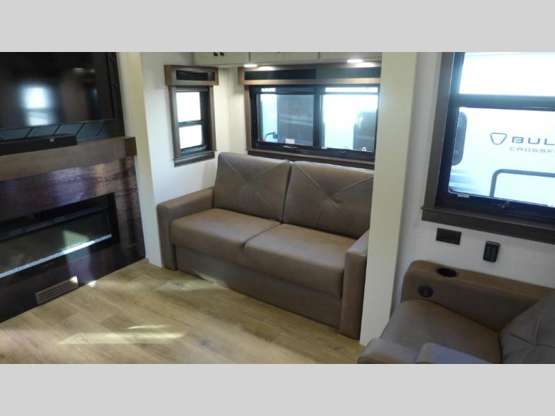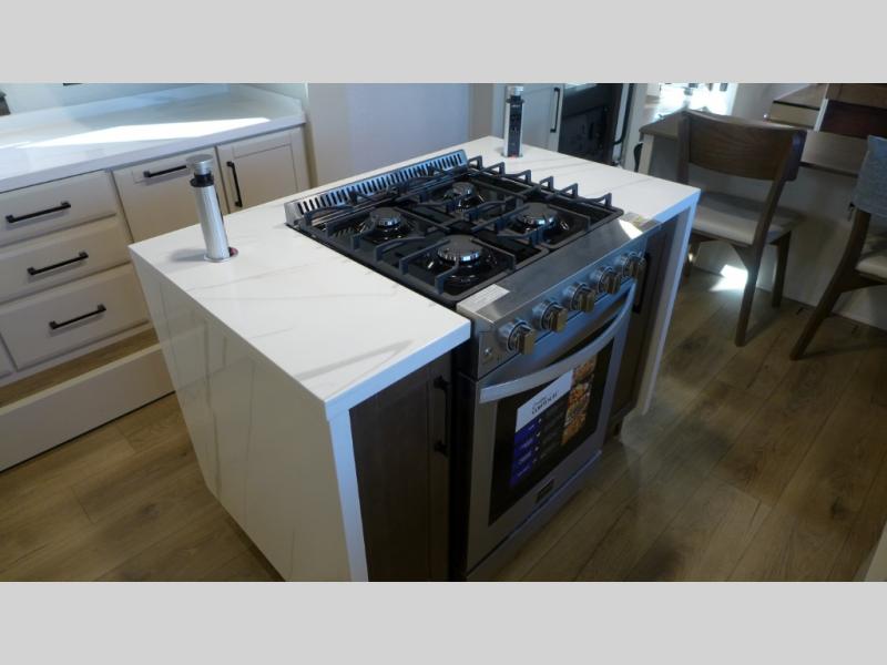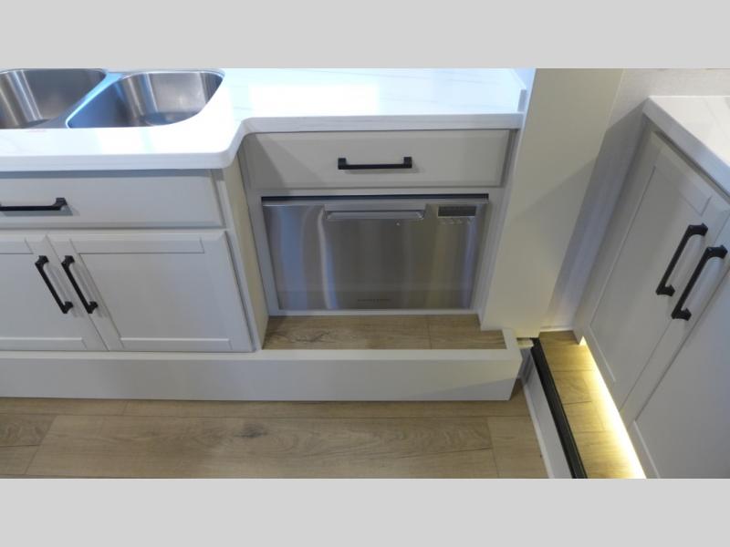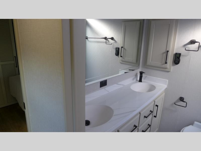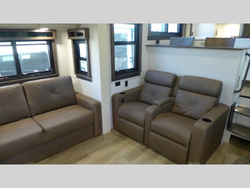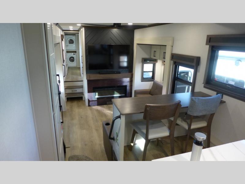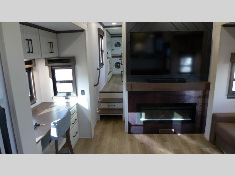 You will feel right at home in this fifth wheel! The rear private bedroom has a 72" x 80" king bed slide for a good night's rest, a rear large wardrobe with the washer and dryer next to it, and even a dresser with a 40" LED TV. And two can get ready at once in the full bathroom with the dual sink vanity. You can then head to either the desk slide to get some work done or whip up some scrambled eggs on the three burner cooktop at the island in the front kitchen. The kitchen even has a dishwasher for easy clean up and two bar stools at the high top dinette that overlooks the middle living area. Relax each night in true comfort on either the E-Z Glide sofa bed slide or the theater seating across from the entertainment center which has a fireplace and 65" Samsung LED Smart TV to watch your favorite movies!