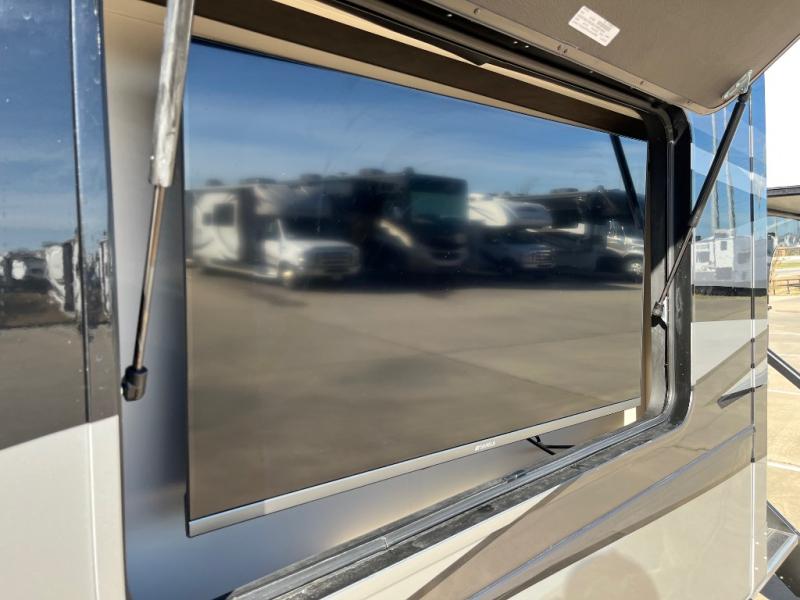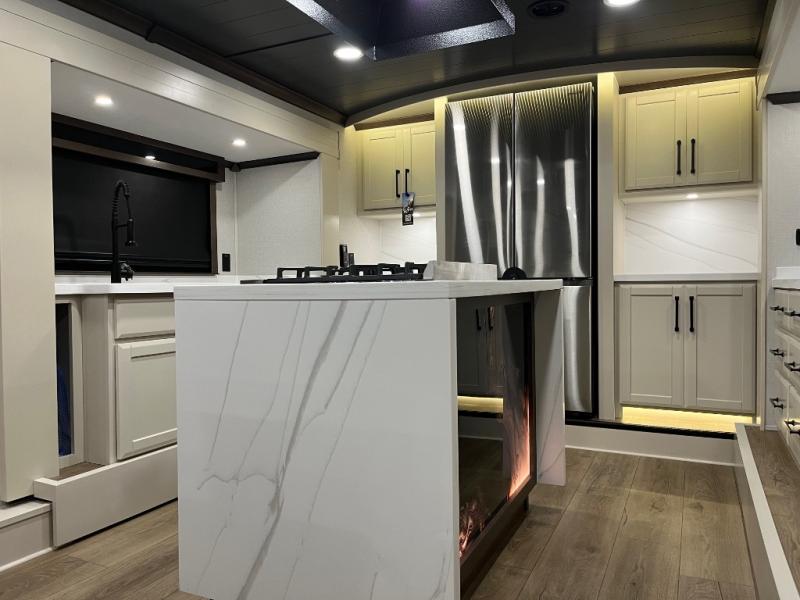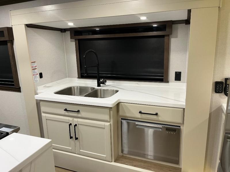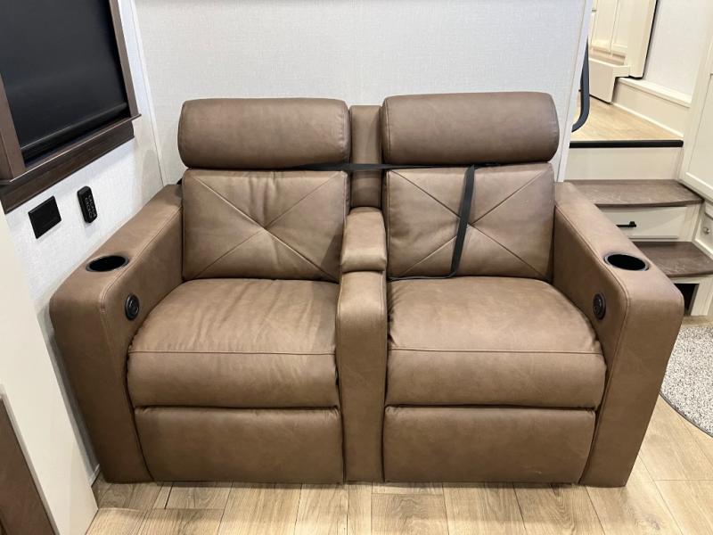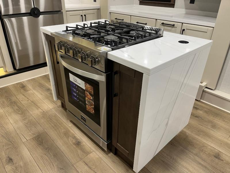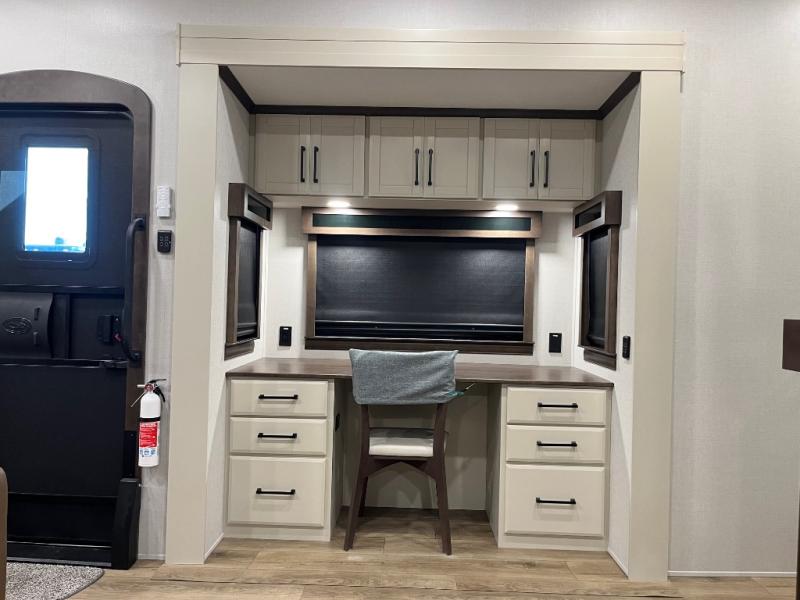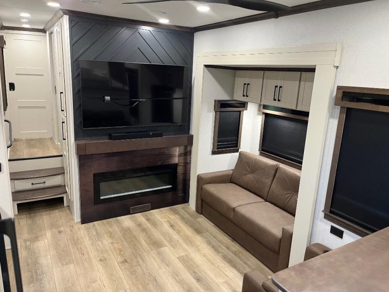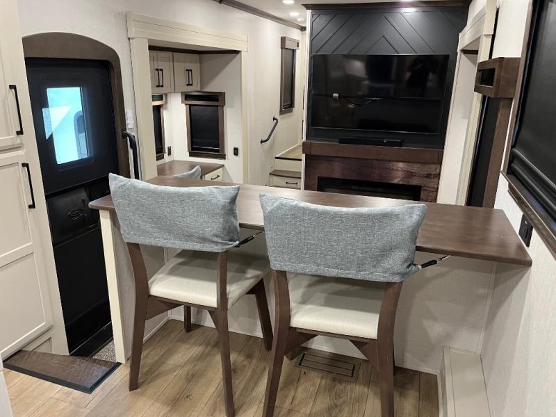 You will feel right at home in this fifth wheel! The rear private bedroom has a 72" x 80" king bed slide for a good night's rest, a rear large wardrobe with the washer and dryer next to it, and even a dresser with a 40" LED TV. And two can get ready at once in the full bathroom with the dual sink vanity. You can then head to either the desk slide to get some work done or whip up some scrambled eggs on the three burner cooktop at the island in the front kitchen. The kitchen even has a dishwasher for easy clean up and two bar stools at the high top dinette that overlooks the middle living area. Relax each night in true comfort on either the E-Z Glide sofa bed slide or the theater seating across from the entertainment center which has a fireplace and 65" Samsung LED Smart TV to watch your favorite movies!
