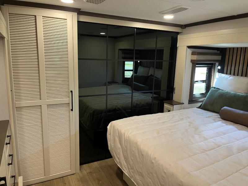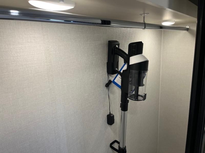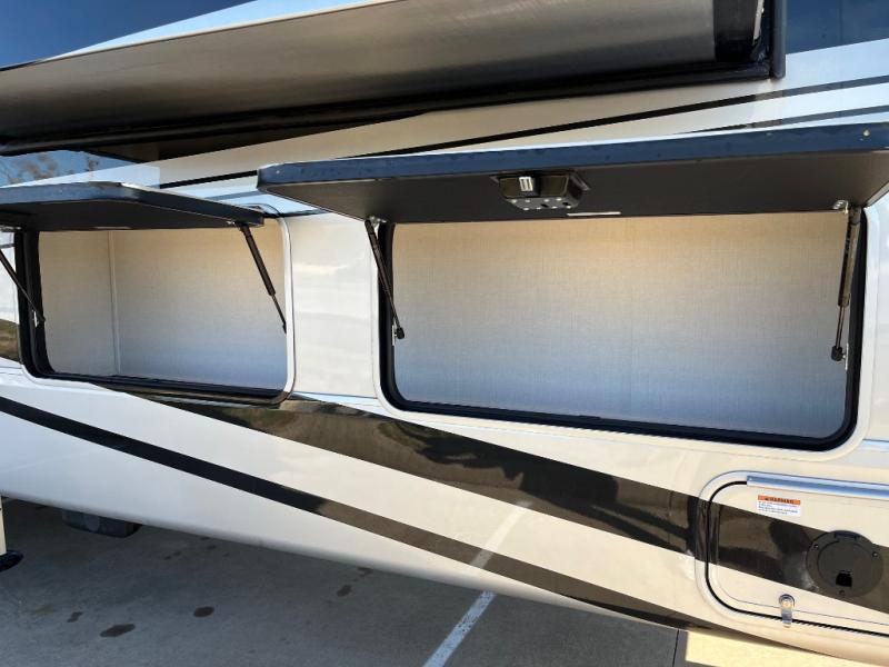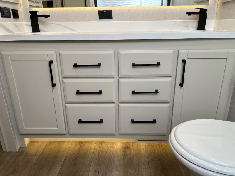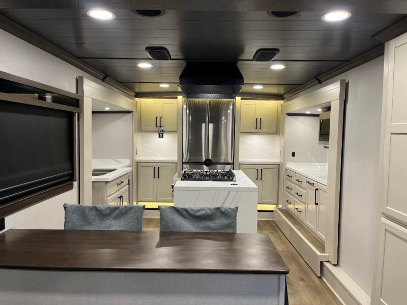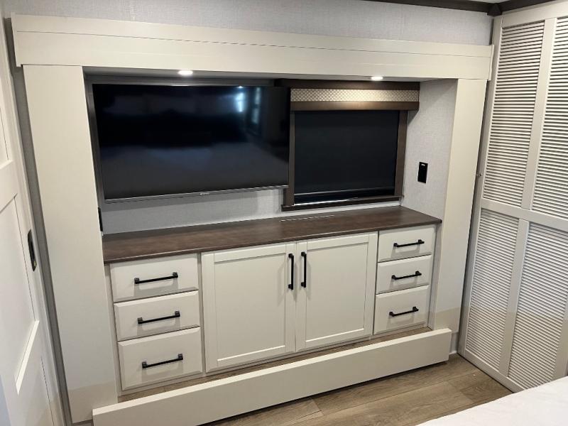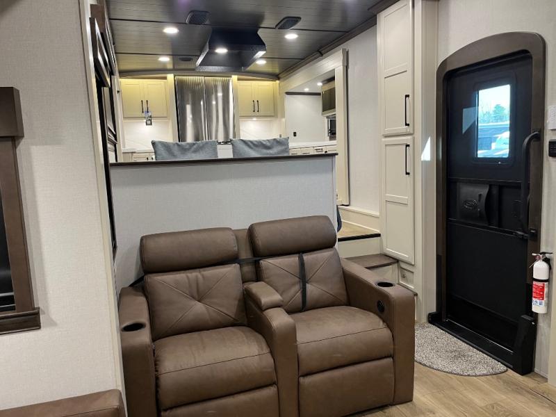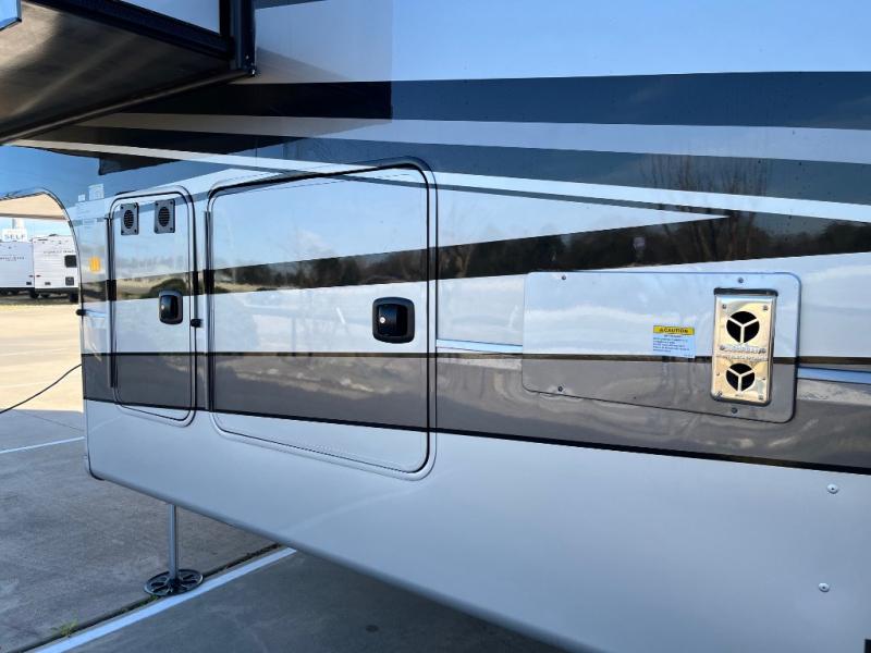 You will feel right at home in this fifth wheel! The rear private bedroom has a 72" x 80" king bed slide for a good night's rest, a rear large wardrobe with the washer and dryer next to it, and even a dresser with a 40" LED TV. And two can get ready at once in the full bathroom with the dual sink vanity. You can then head to either the desk slide to get some work done or whip up some scrambled eggs on the three burner cooktop at the island in the front kitchen. The kitchen even has a dishwasher for easy clean up and two bar stools at the high top dinette that overlooks the middle living area. Relax each night in true comfort on either the E-Z Glide sofa bed slide or the theater seating across from the entertainment center which has a fireplace and 65" Samsung LED Smart TV to watch your favorite movies!