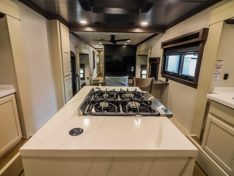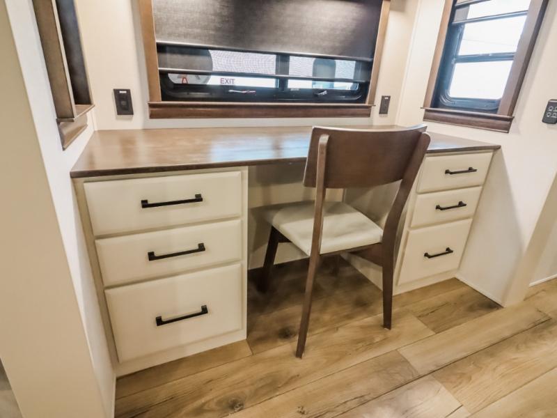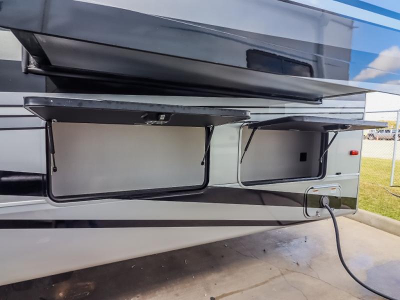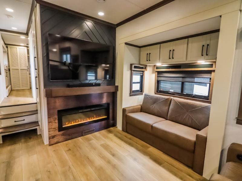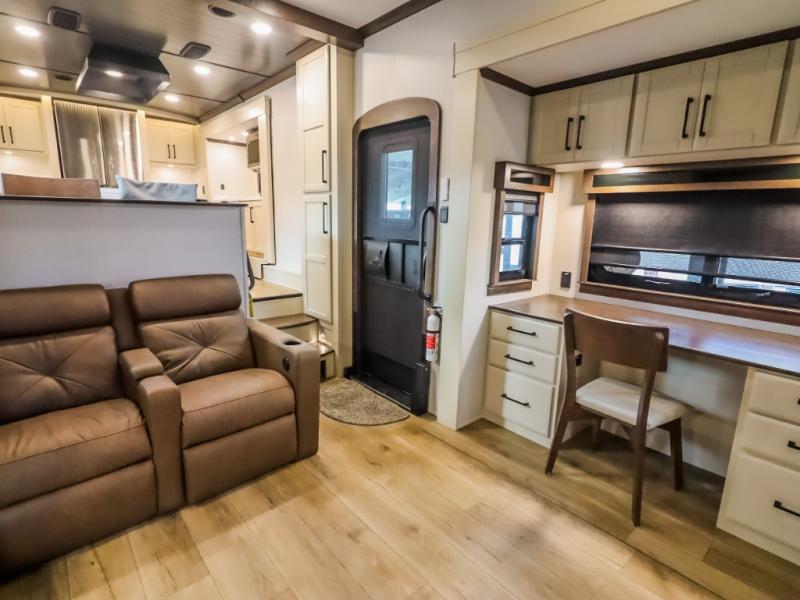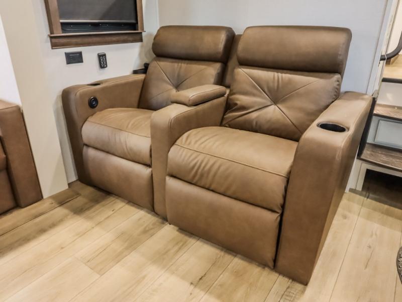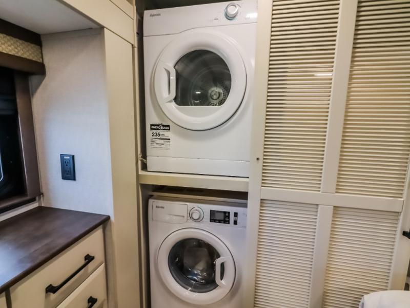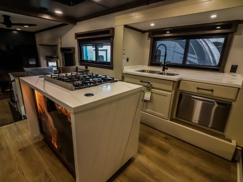 You will feel right at home in this fifth wheel! The rear private bedroom has a 72" x 80" king bed slide for a good night's rest, a rear large wardrobe with the washer and dryer next to it, and even a dresser with a 40" LED TV. And two can get ready at once in the full bathroom with the dual sink vanity. You can then head to either the desk slide to get some work done or whip up some scrambled eggs on the three burner cooktop at the island in the front kitchen. The kitchen even has a dishwasher for easy clean up and two bar stools at the high top dinette that overlooks the middle living area. Relax each night in true comfort on either the E-Z Glide sofa bed slide or the theater seating across from the entertainment center which has a fireplace and 65" Samsung LED Smart TV to watch your favorite movies!