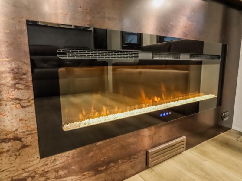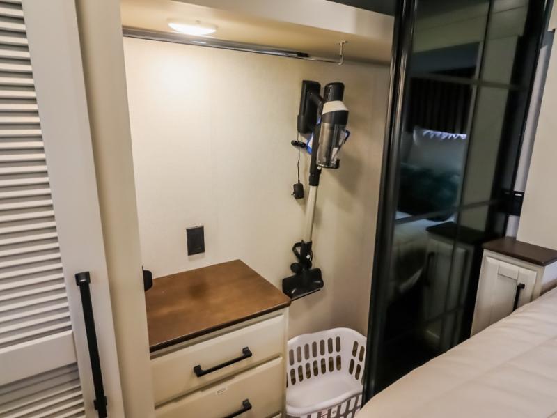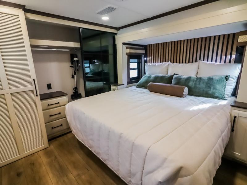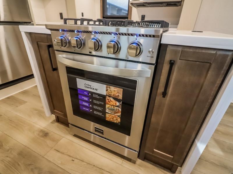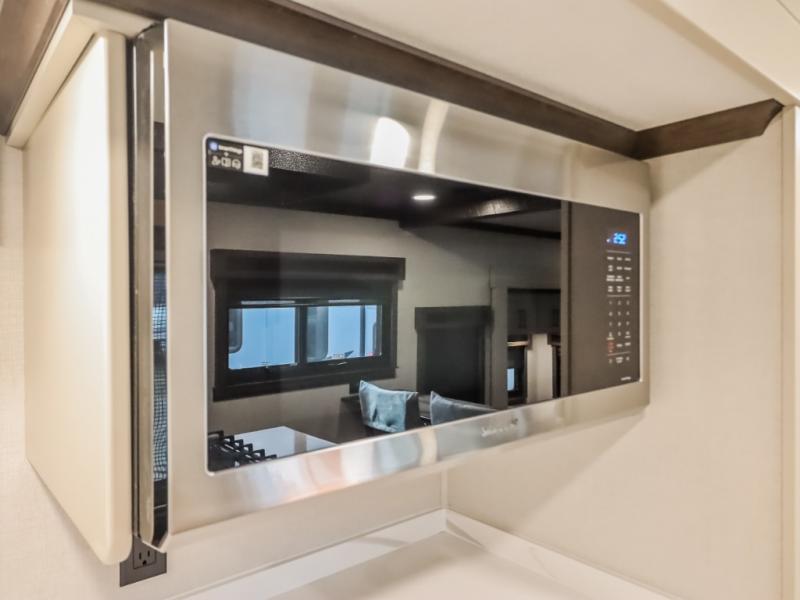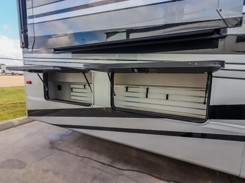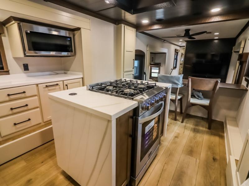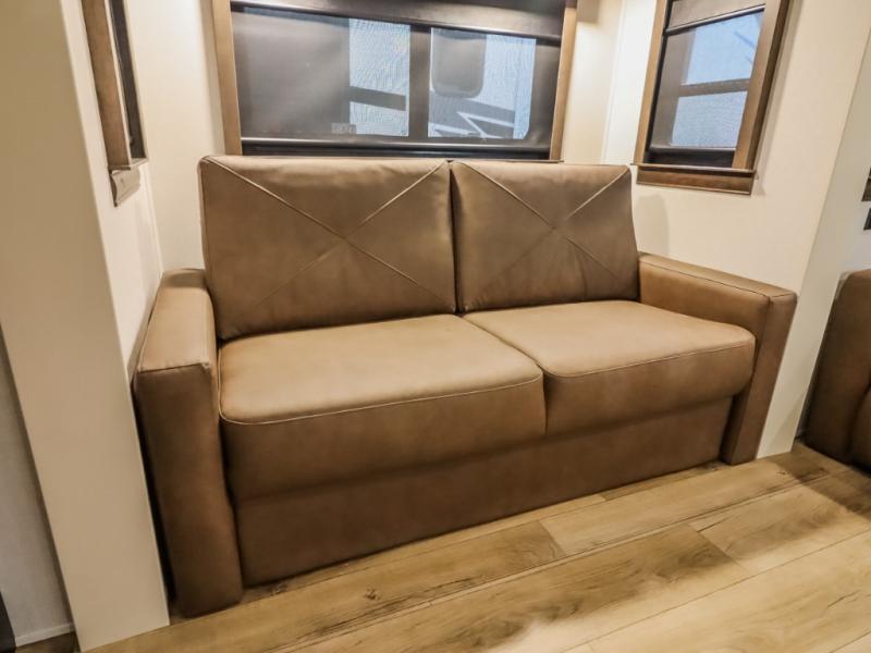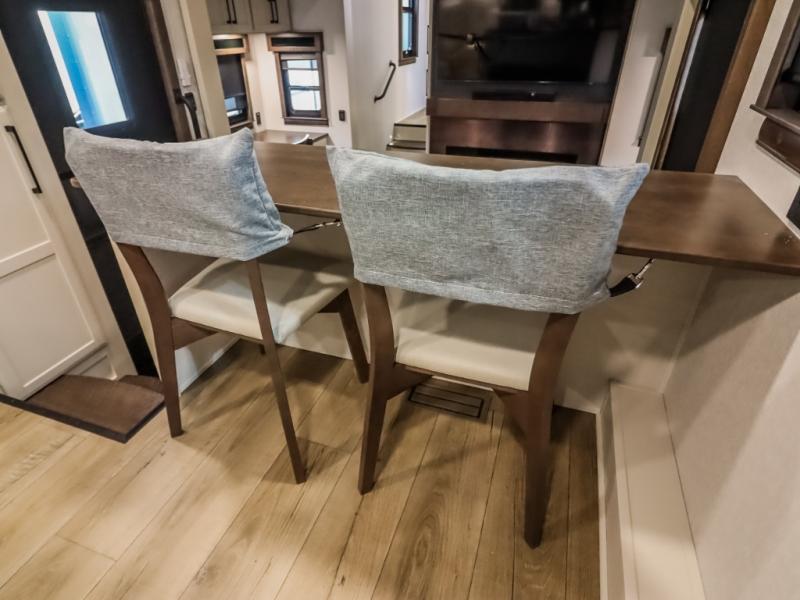 You will feel right at home in this fifth wheel! The rear private bedroom has a 72" x 80" king bed slide for a good night's rest, a rear large wardrobe with the washer and dryer next to it, and even a dresser with a 40" LED TV. And two can get ready at once in the full bathroom with the dual sink vanity. You can then head to either the desk slide to get some work done or whip up some scrambled eggs on the three burner cooktop at the island in the front kitchen. The kitchen even has a dishwasher for easy clean up and two bar stools at the high top dinette that overlooks the middle living area. Relax each night in true comfort on either the E-Z Glide sofa bed slide or the theater seating across from the entertainment center which has a fireplace and 65" Samsung LED Smart TV to watch your favorite movies!