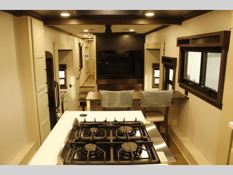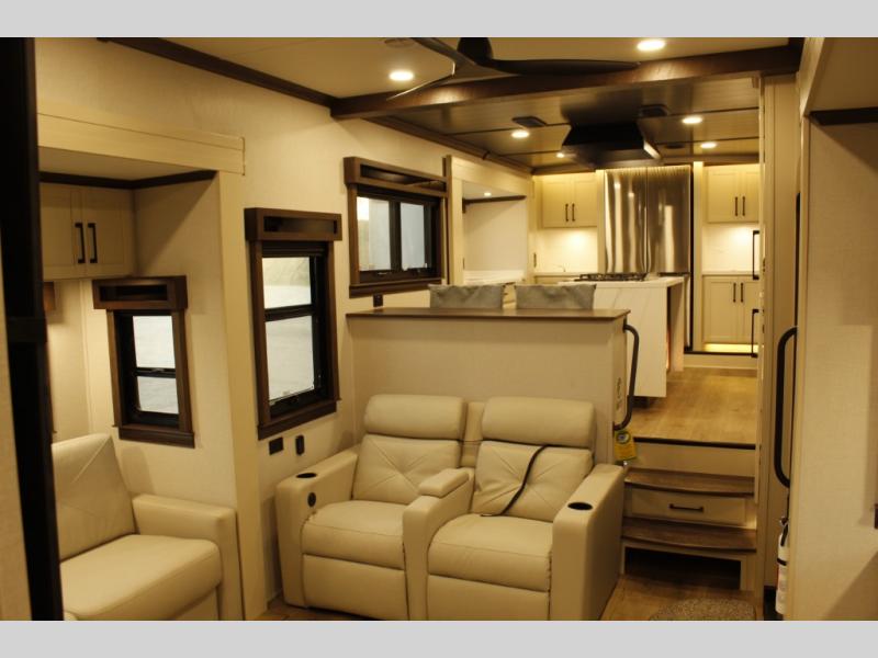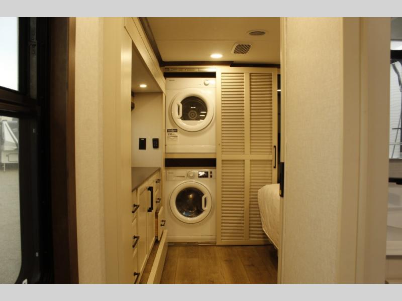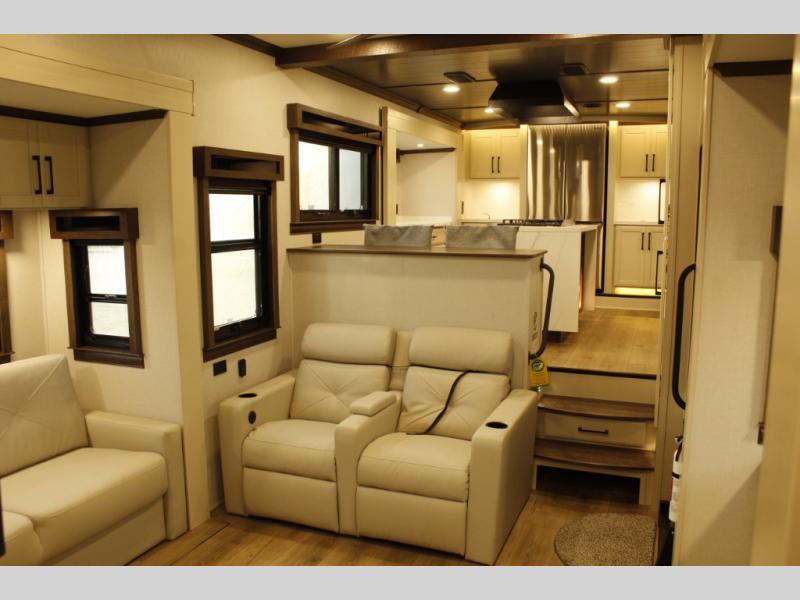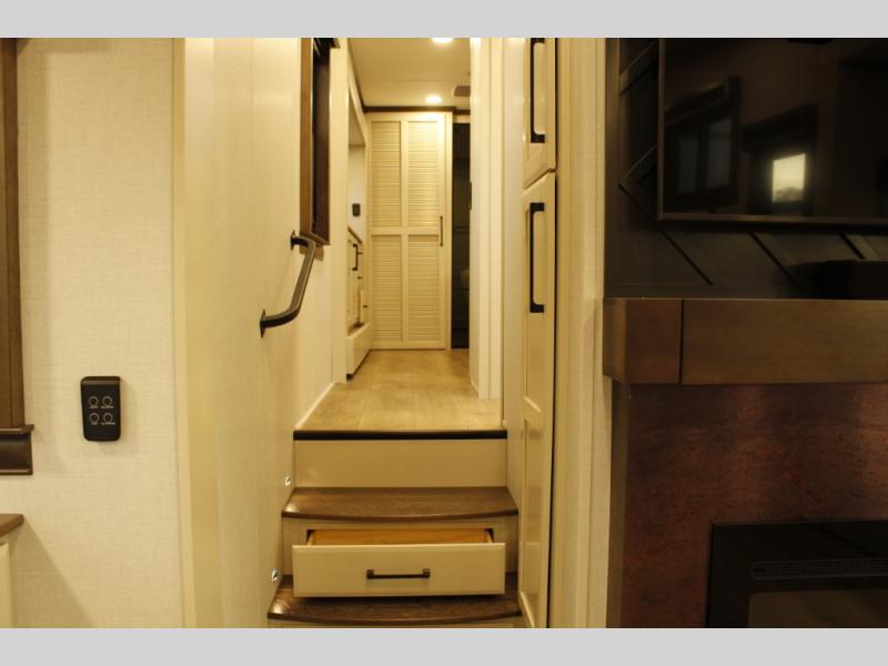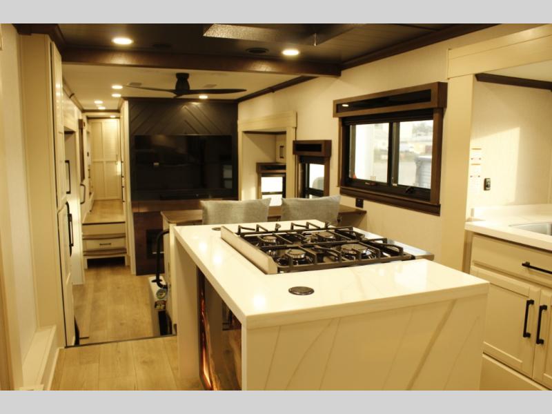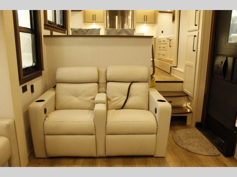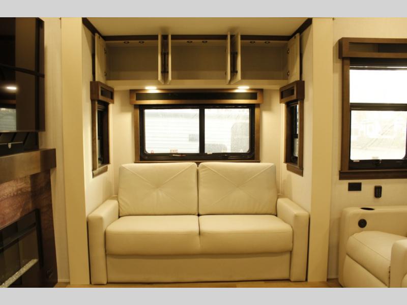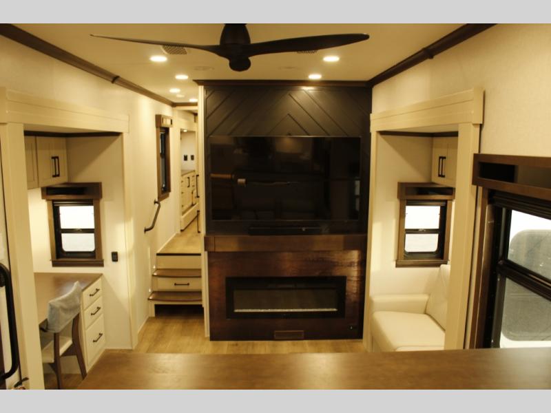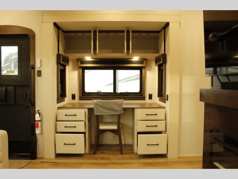 You will feel right at home in this fifth wheel! The rear private bedroom has a 72" x 80" king bed slide for a good night's rest, a rear large wardrobe with the washer and dryer next to it, and even a dresser with a 40" LED TV. And two can get ready at once in the full bathroom with the dual sink vanity. You can then head to either the desk slide to get some work done or whip up some scrambled eggs on the three burner cooktop at the island in the front kitchen. The kitchen even has a dishwasher for easy clean up and two bar stools at the high top dinette that overlooks the middle living area. Relax each night in true comfort on either the E-Z Glide sofa bed slide or the theater seating across from the entertainment center which has a fireplace and 65" Samsung LED Smart TV to watch your favorite movies!